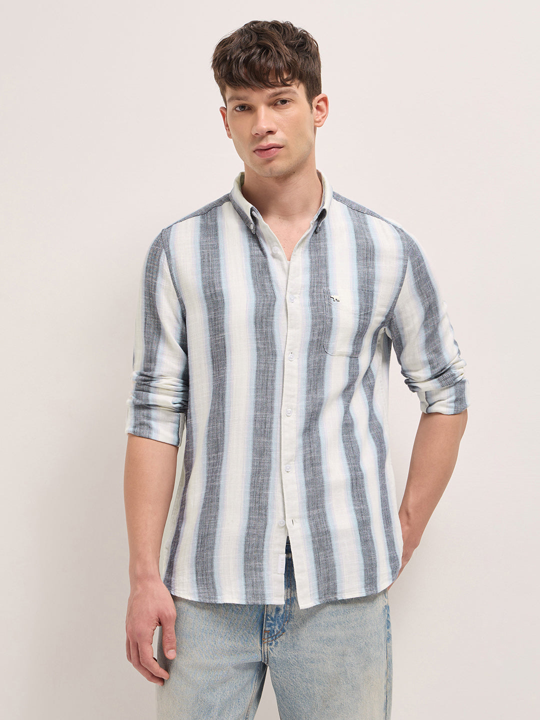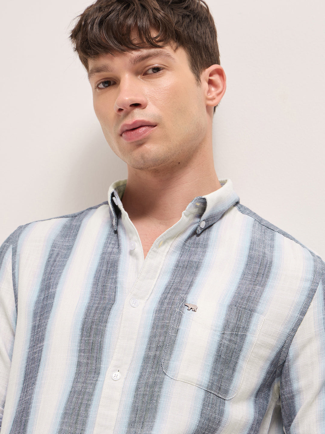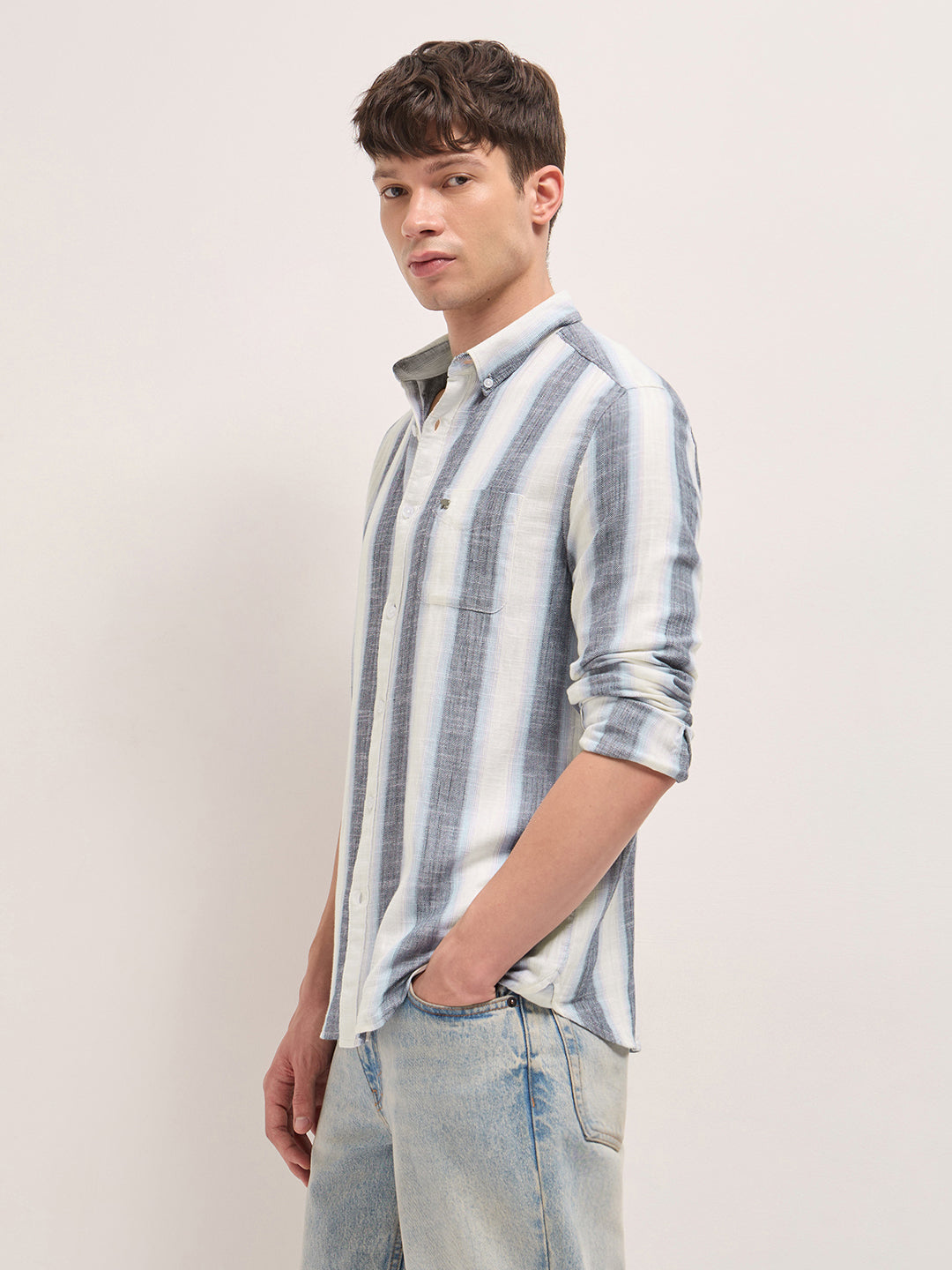 Blue & White Woven Vertical Striped Slim Fit Casual Shirt
