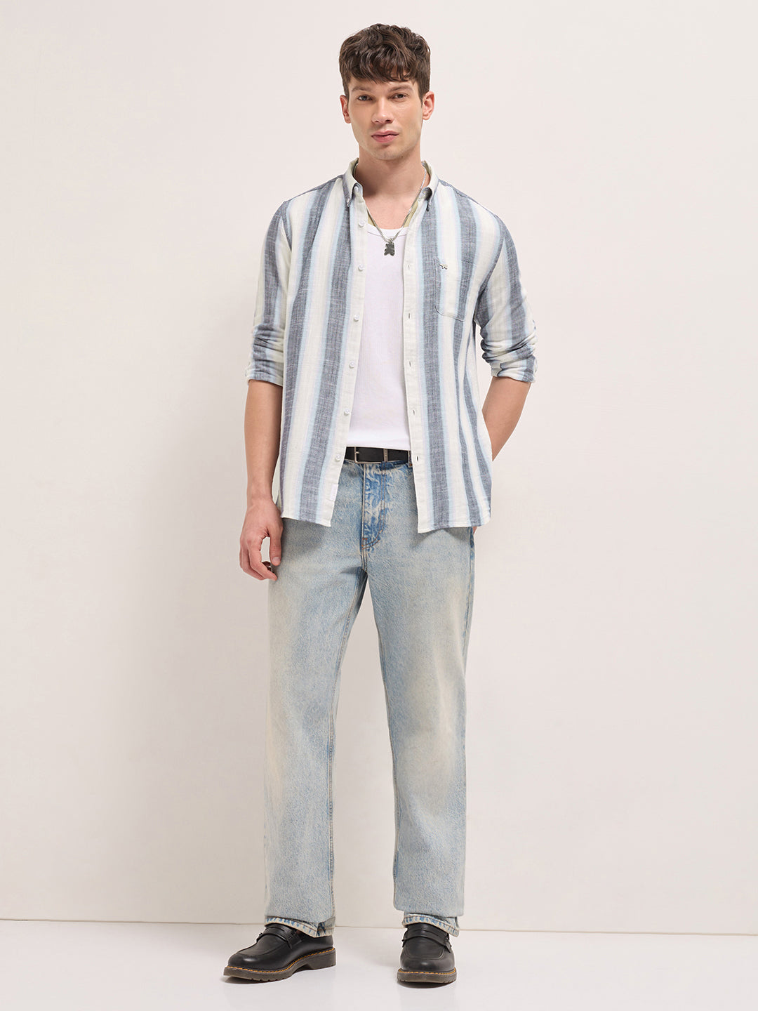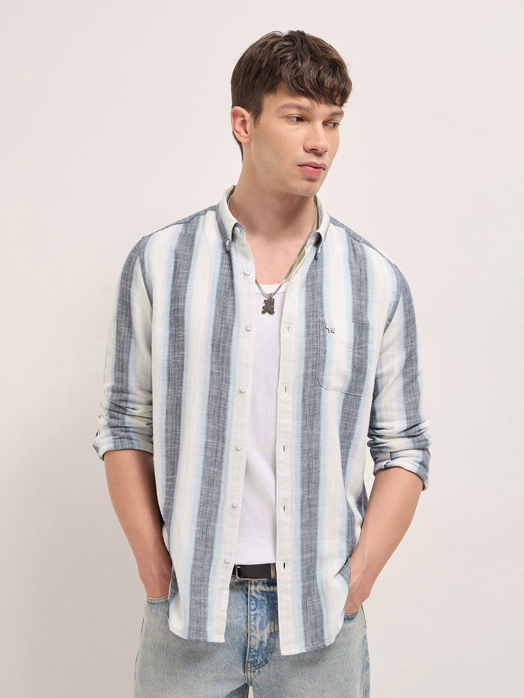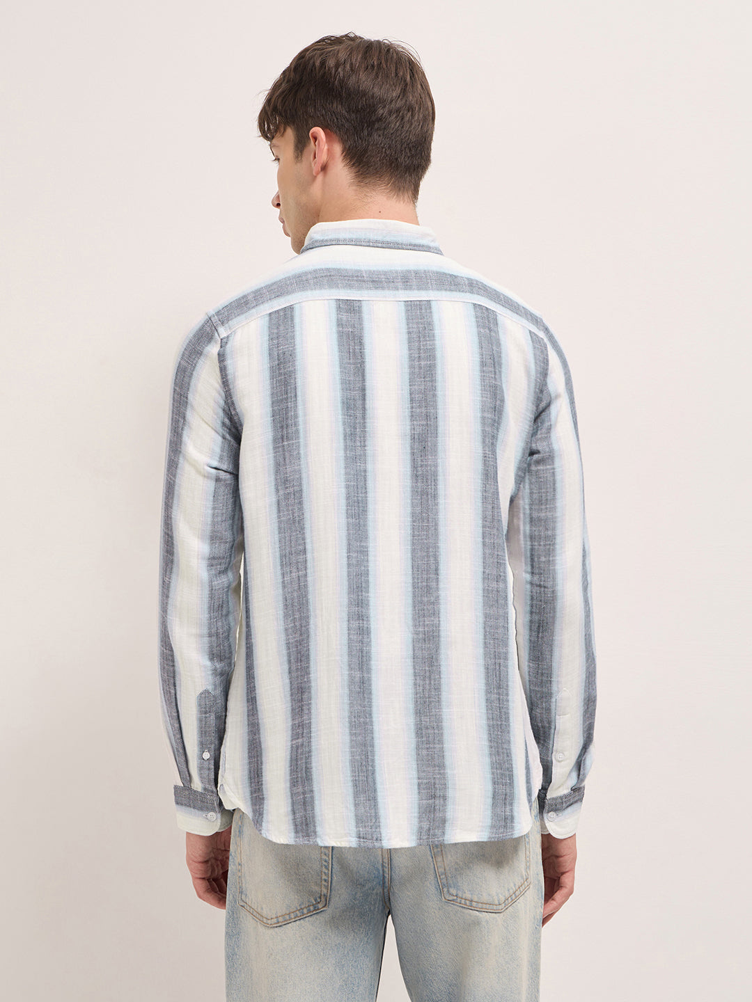 Blue & White Woven Vertical Striped Slim Fit Casual Shirt