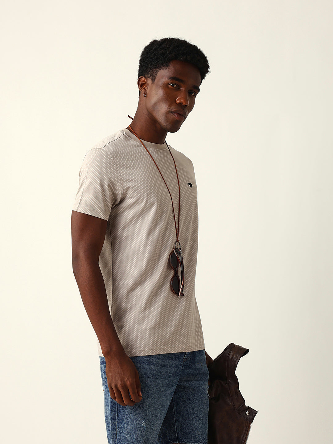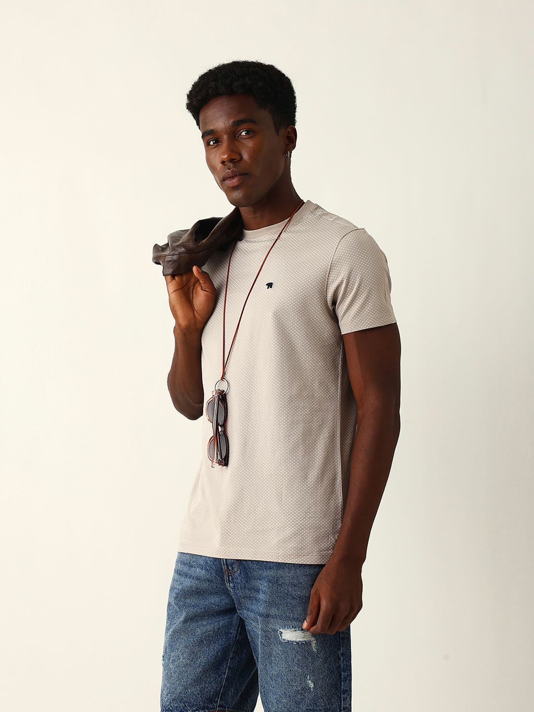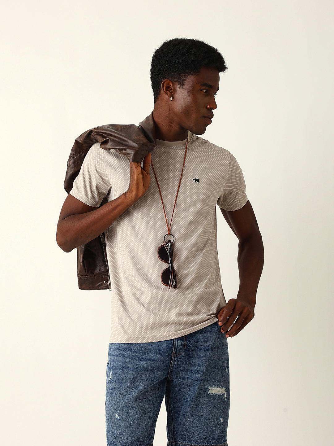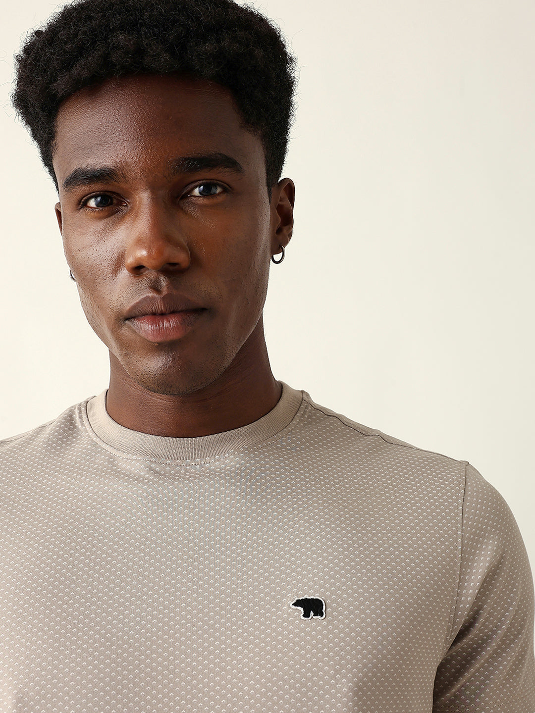 Beige Crew Neck Slim Fit T-Shirt with Bear Logo Embroidery