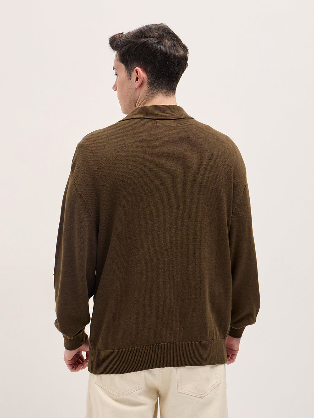 Brown Textured Knit Relaxed Fit Polo with a Stylish Open Placket