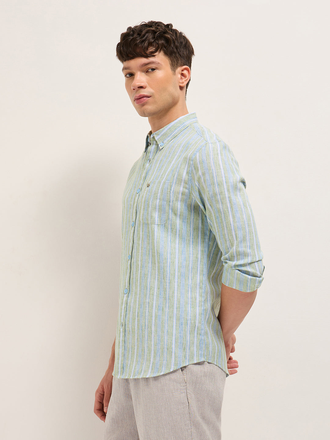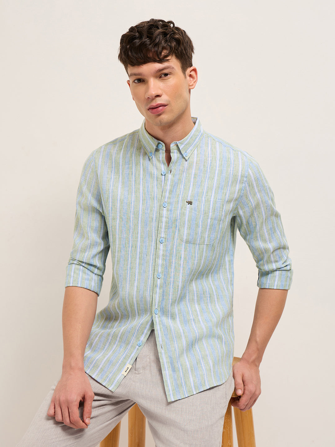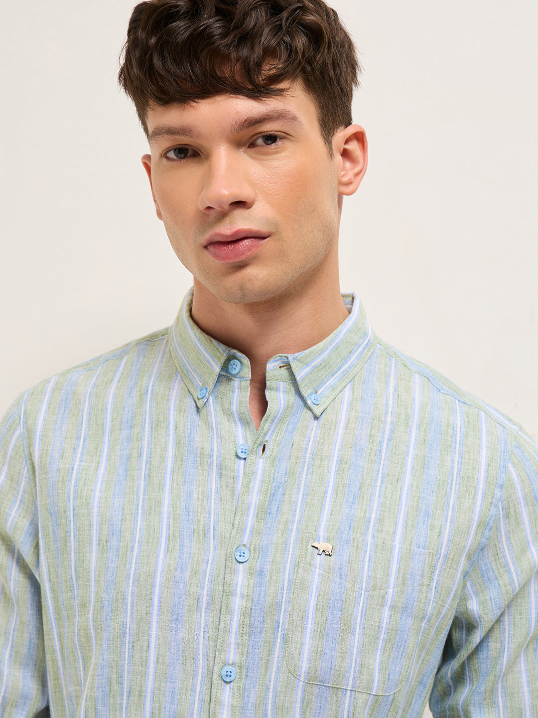 Blue & Green Slim Fit Vertical Striped Cotton Casual Shirt