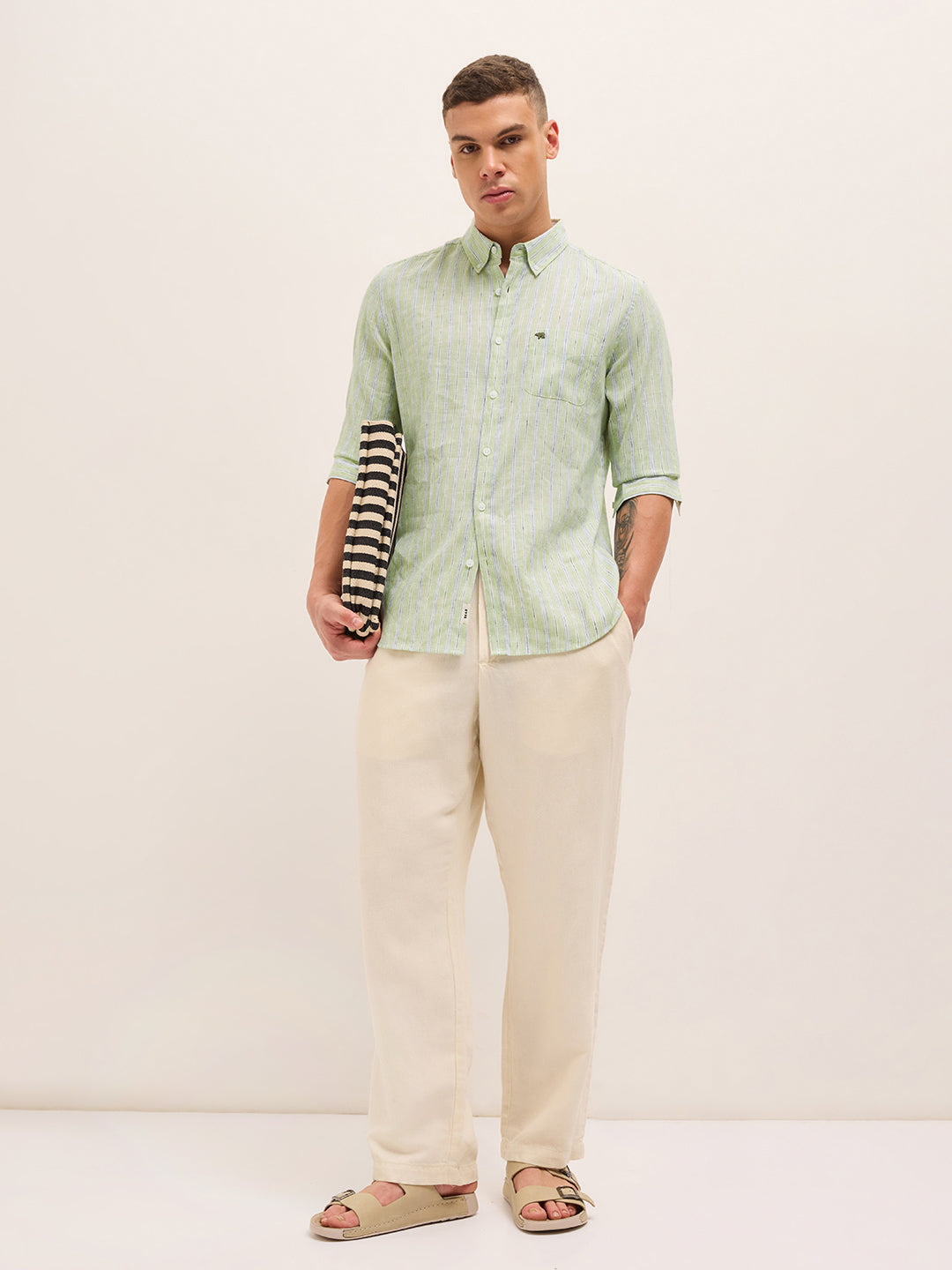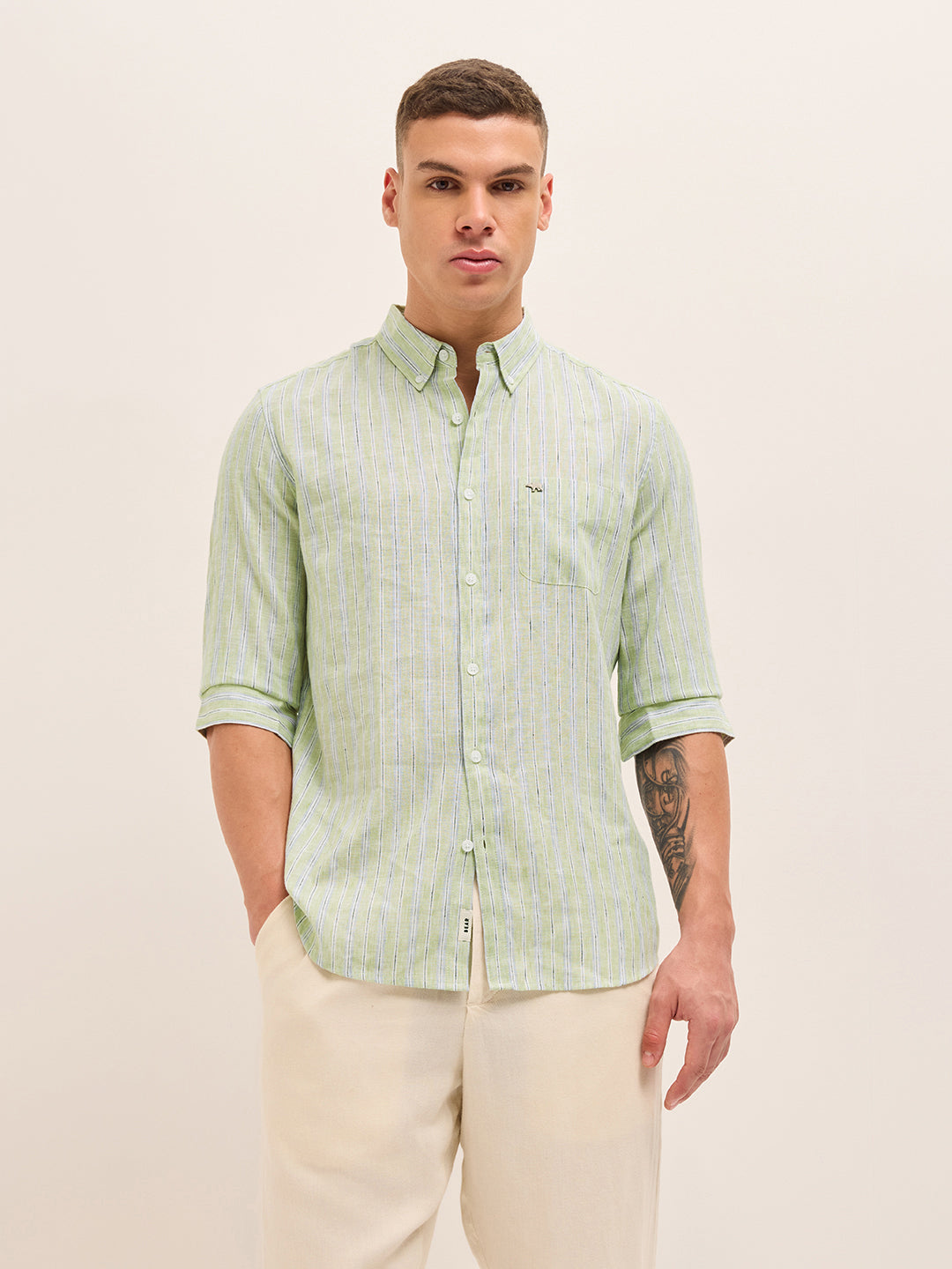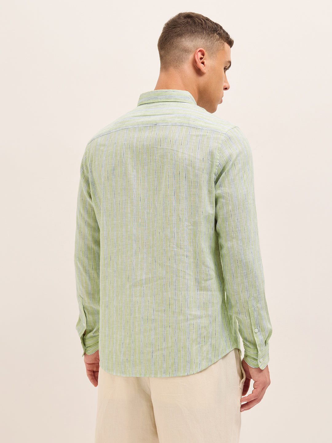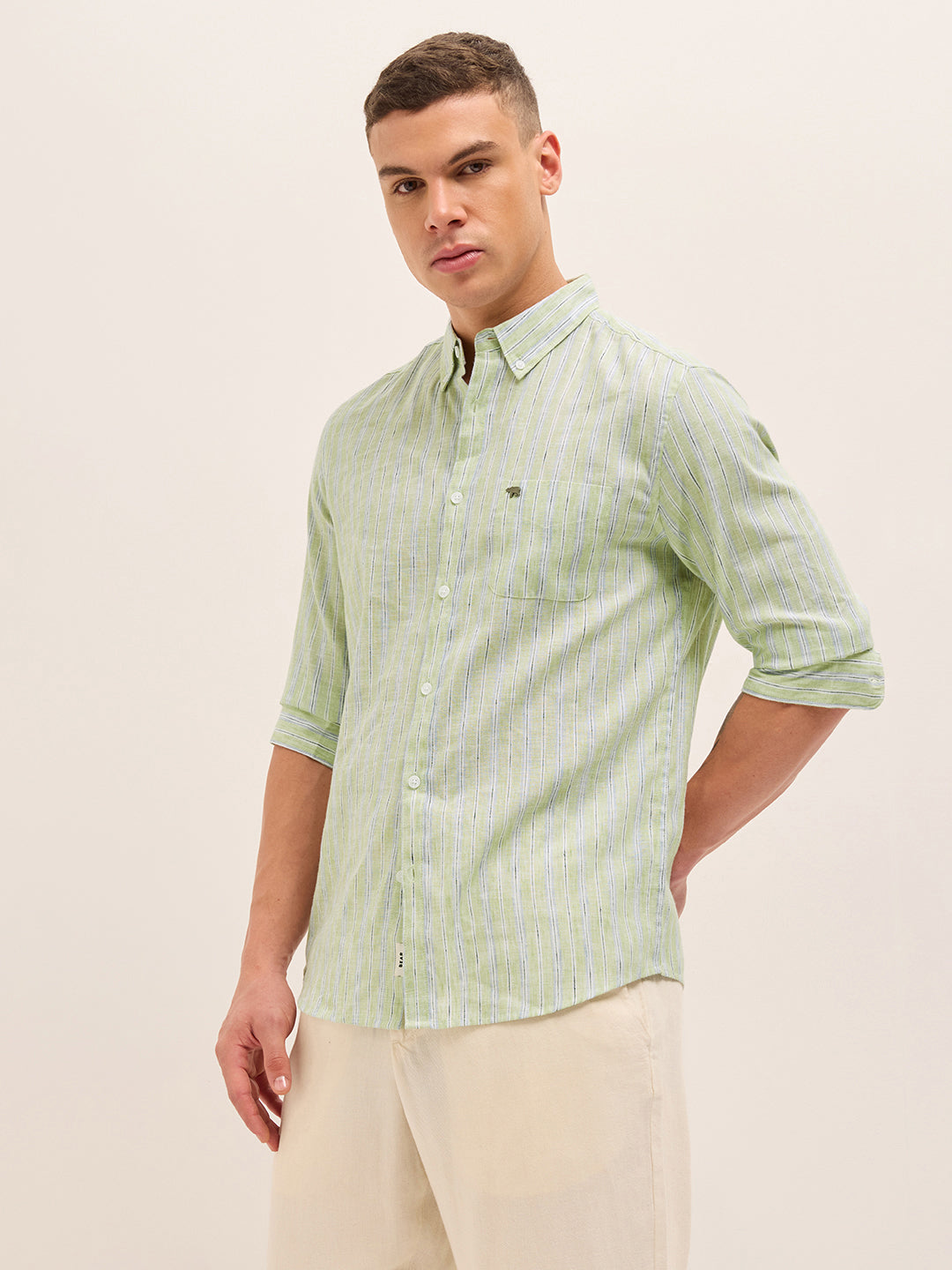 Green Vertical Striped Woven Slim Fit Casual Shirt