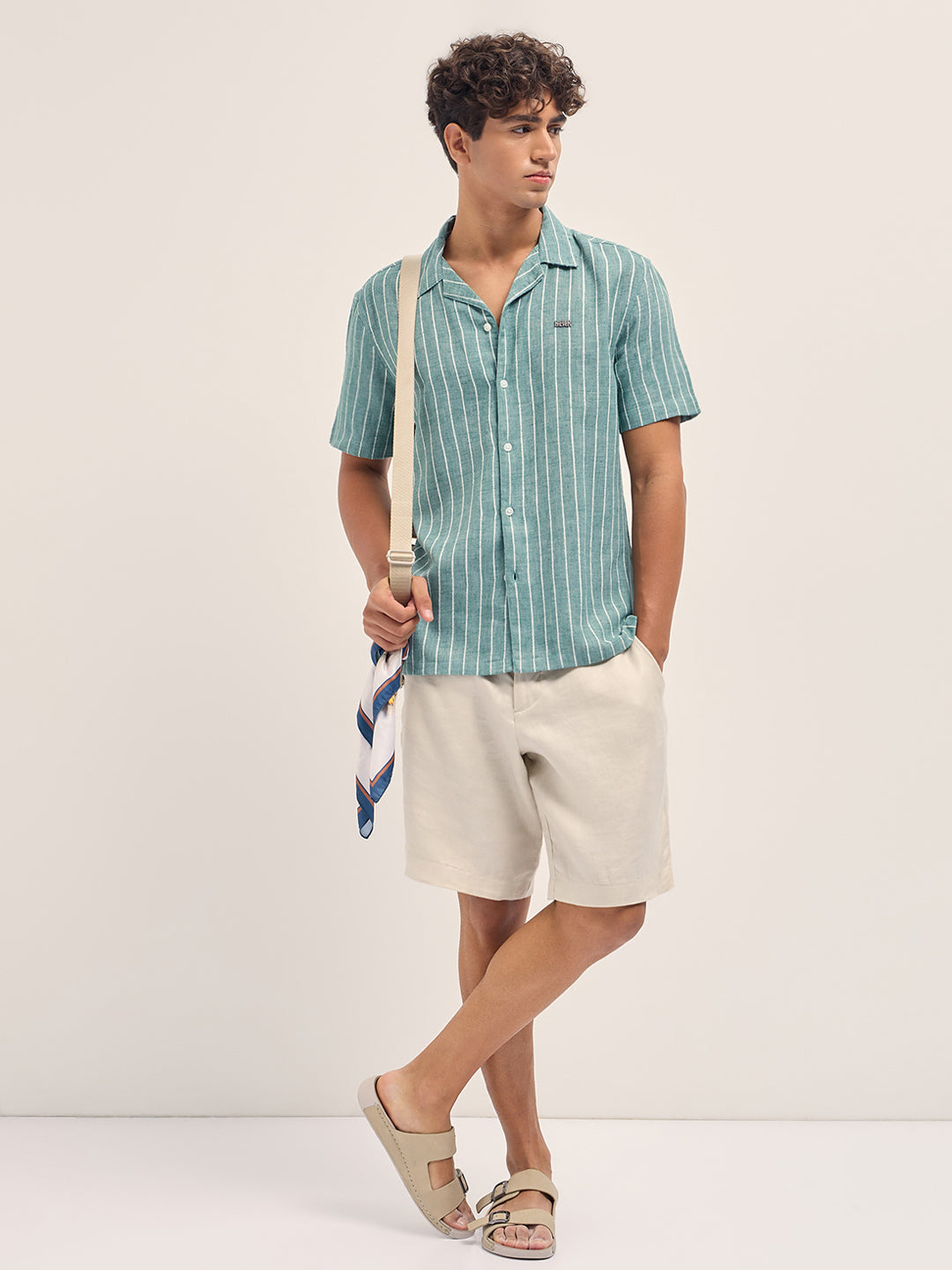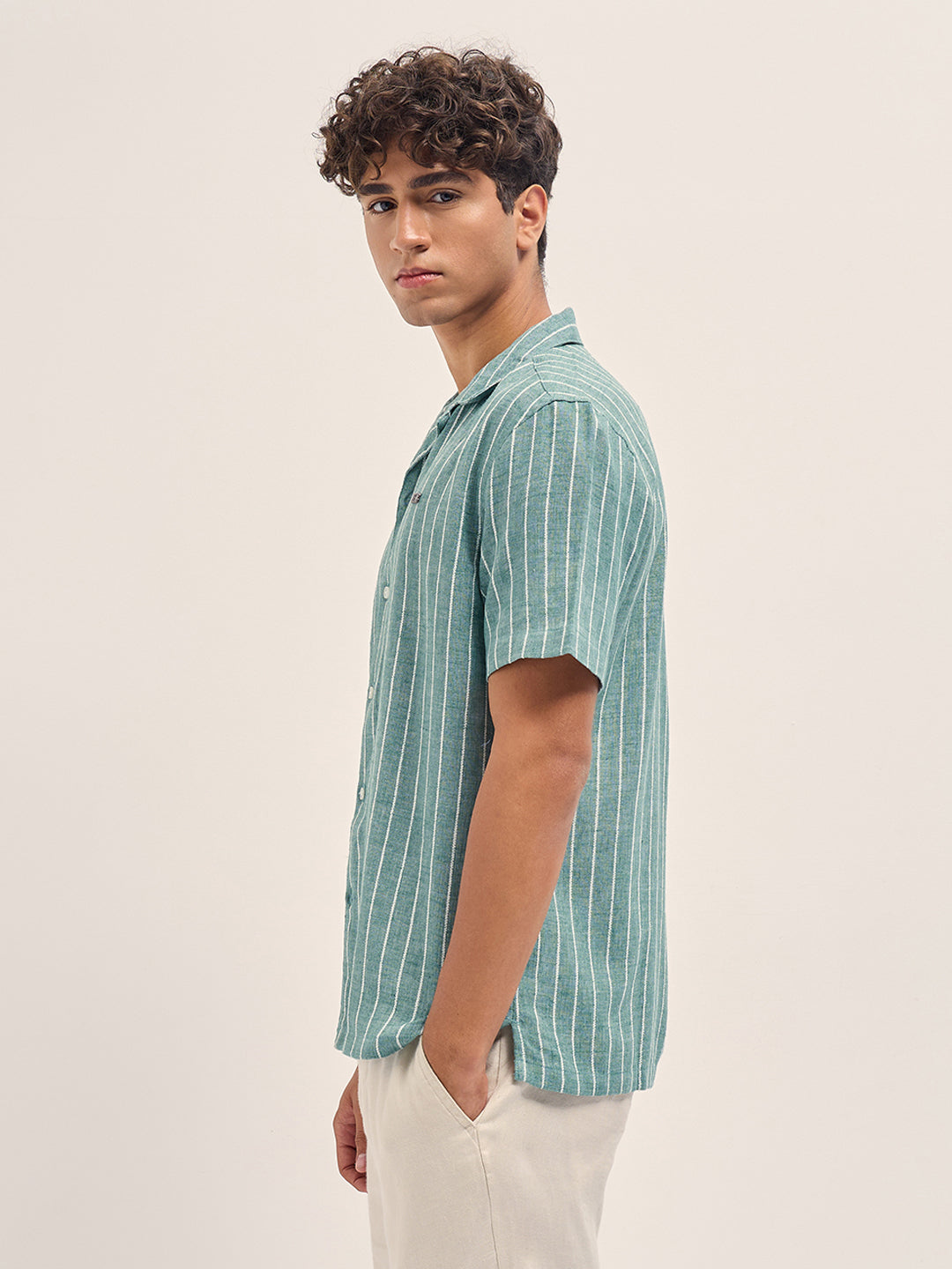 Teal Linen Vertical Textured Stripe Relaxed Fit Half Sleeve Casual Shirt