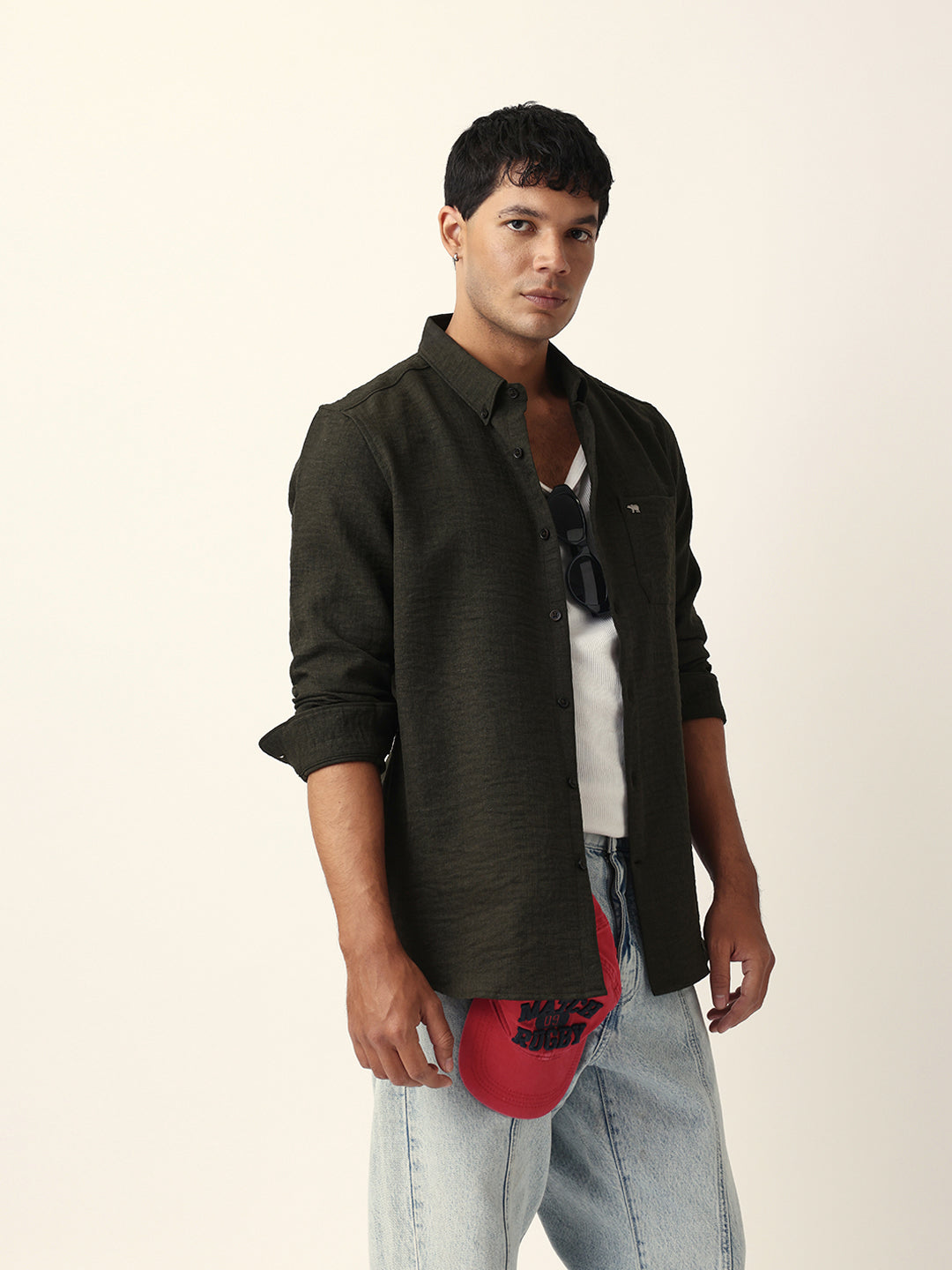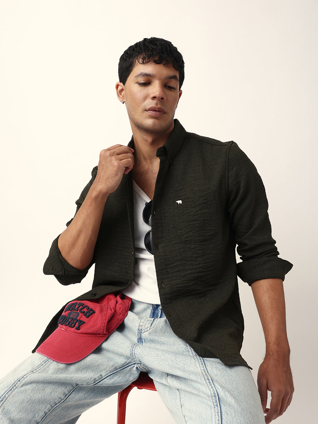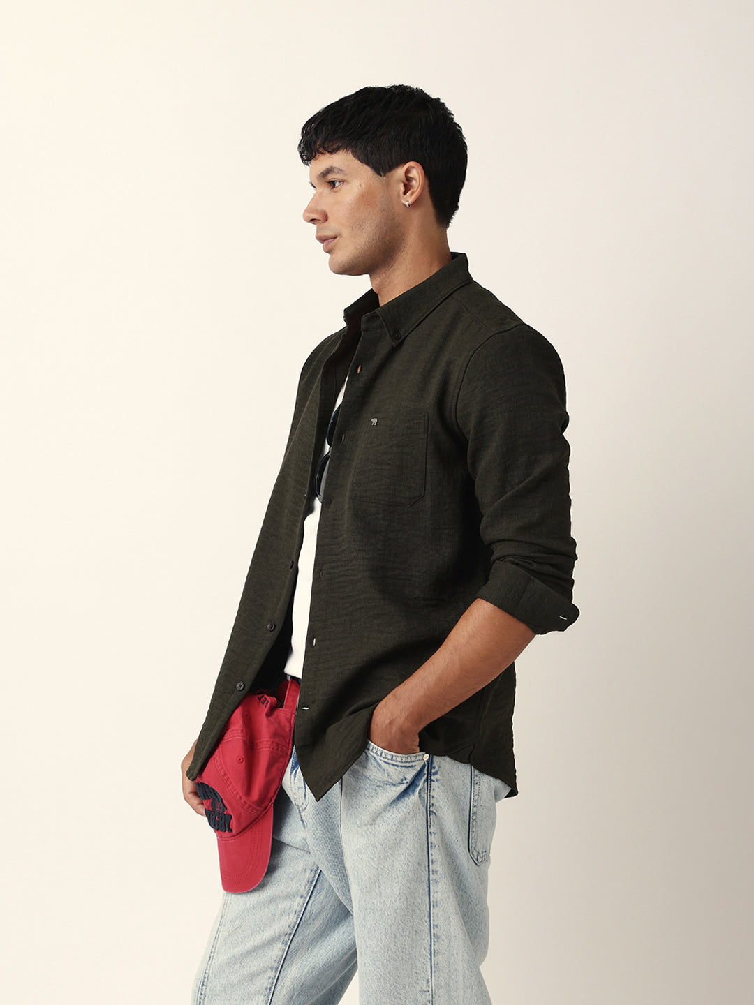 Olive Slim Fit Casual Shirt with Woven Textured Design
