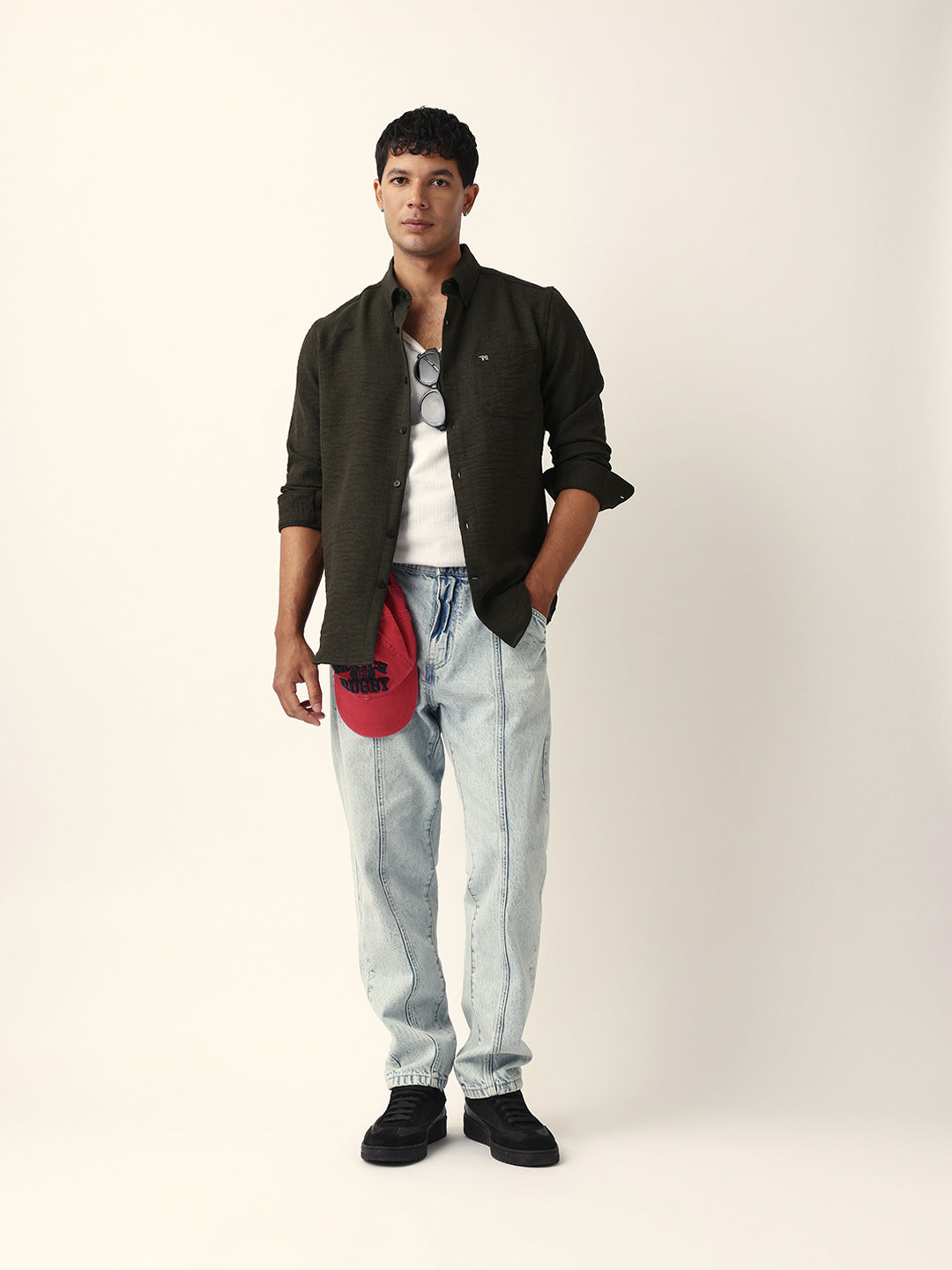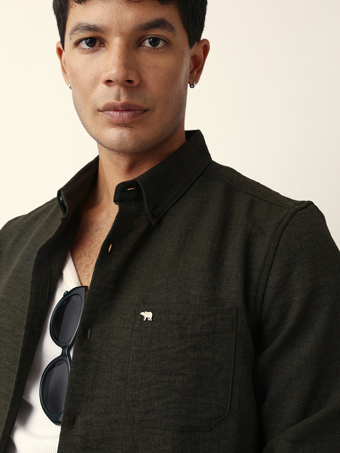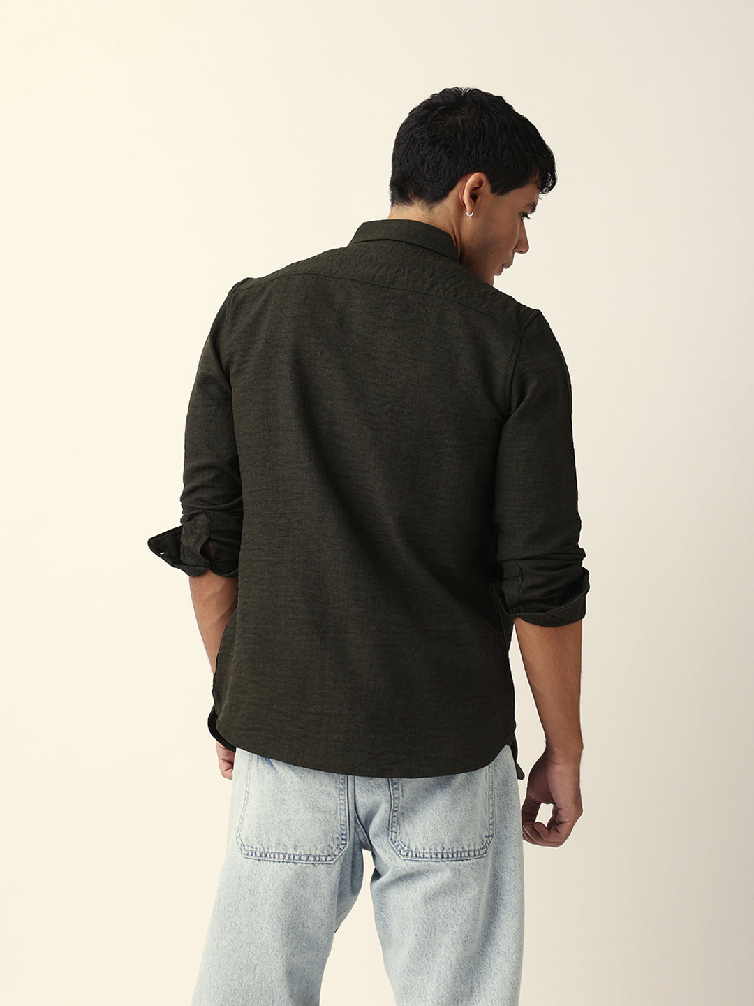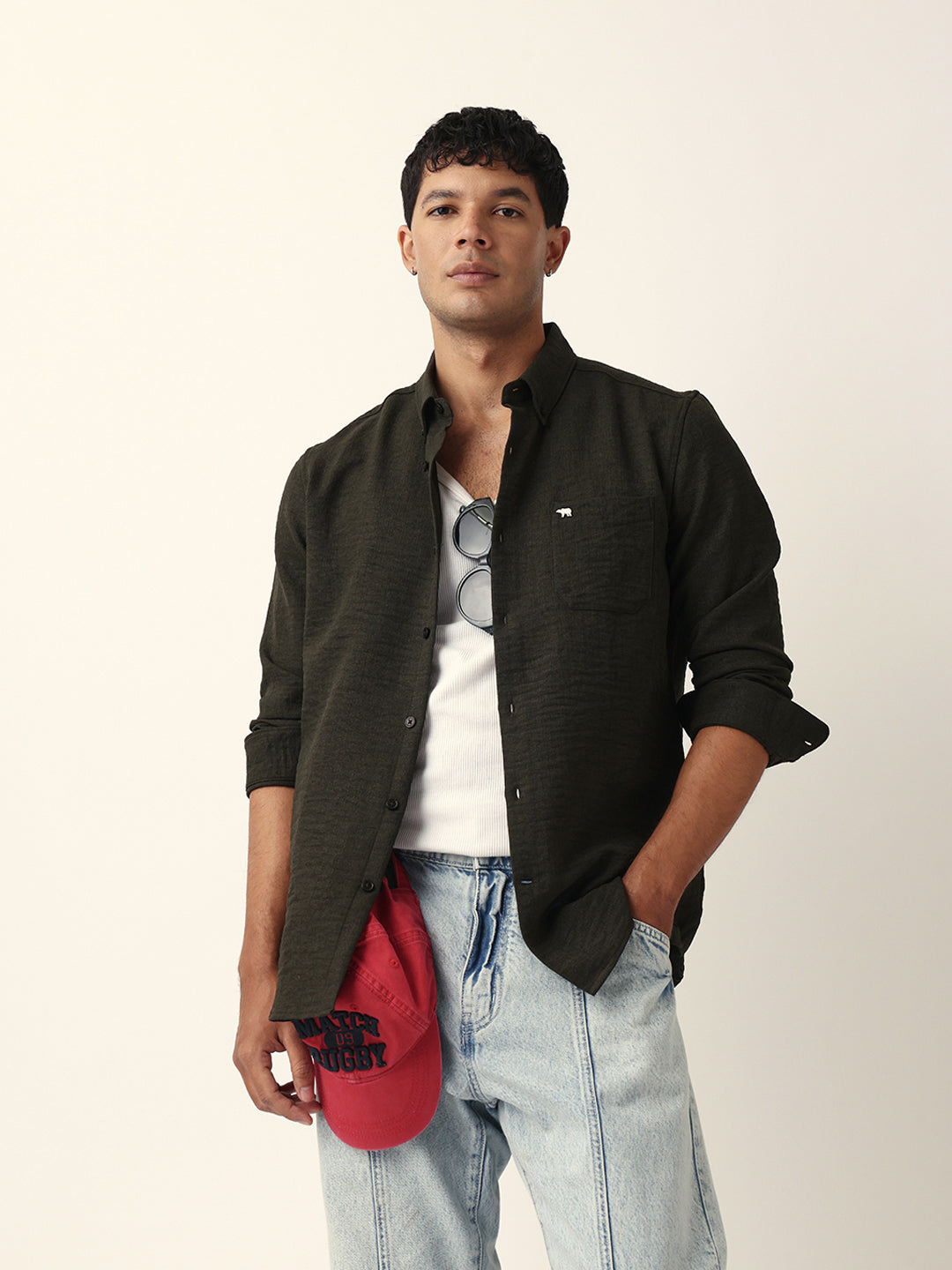 Olive Slim Fit Casual Shirt with Woven Textured Design