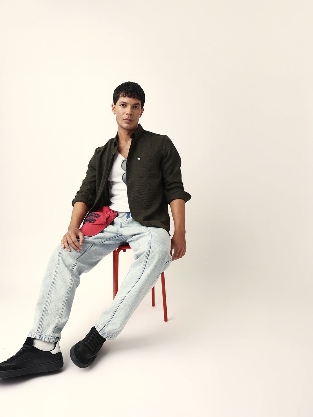 Shop Olive Slim Fit Casual Shirt with Woven Textured Design Online.
