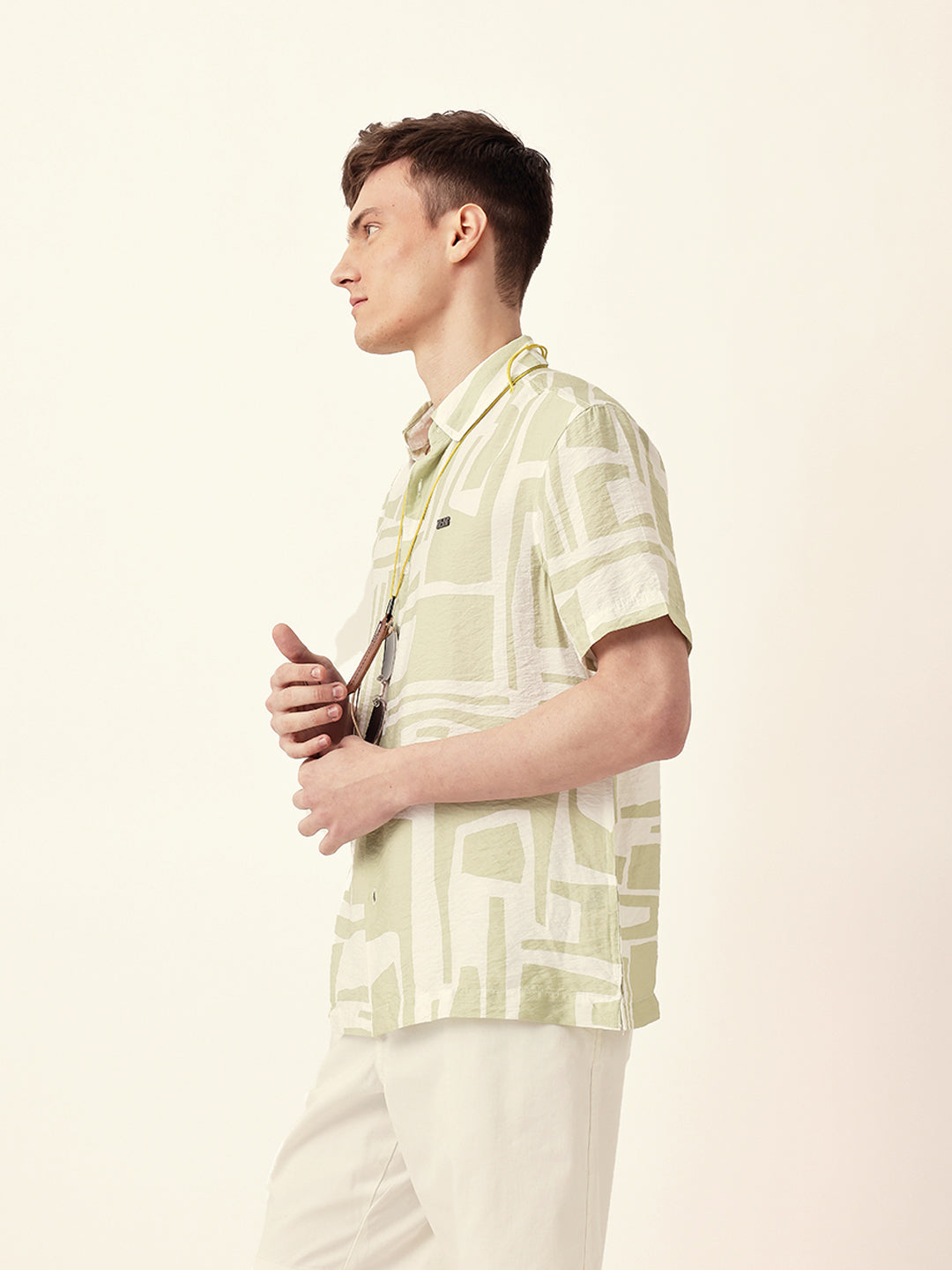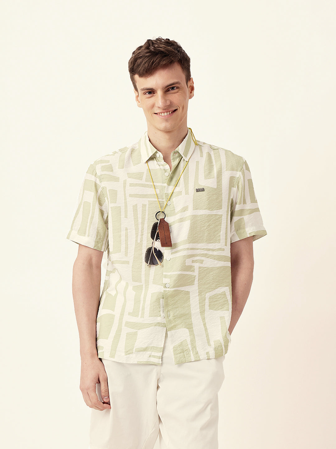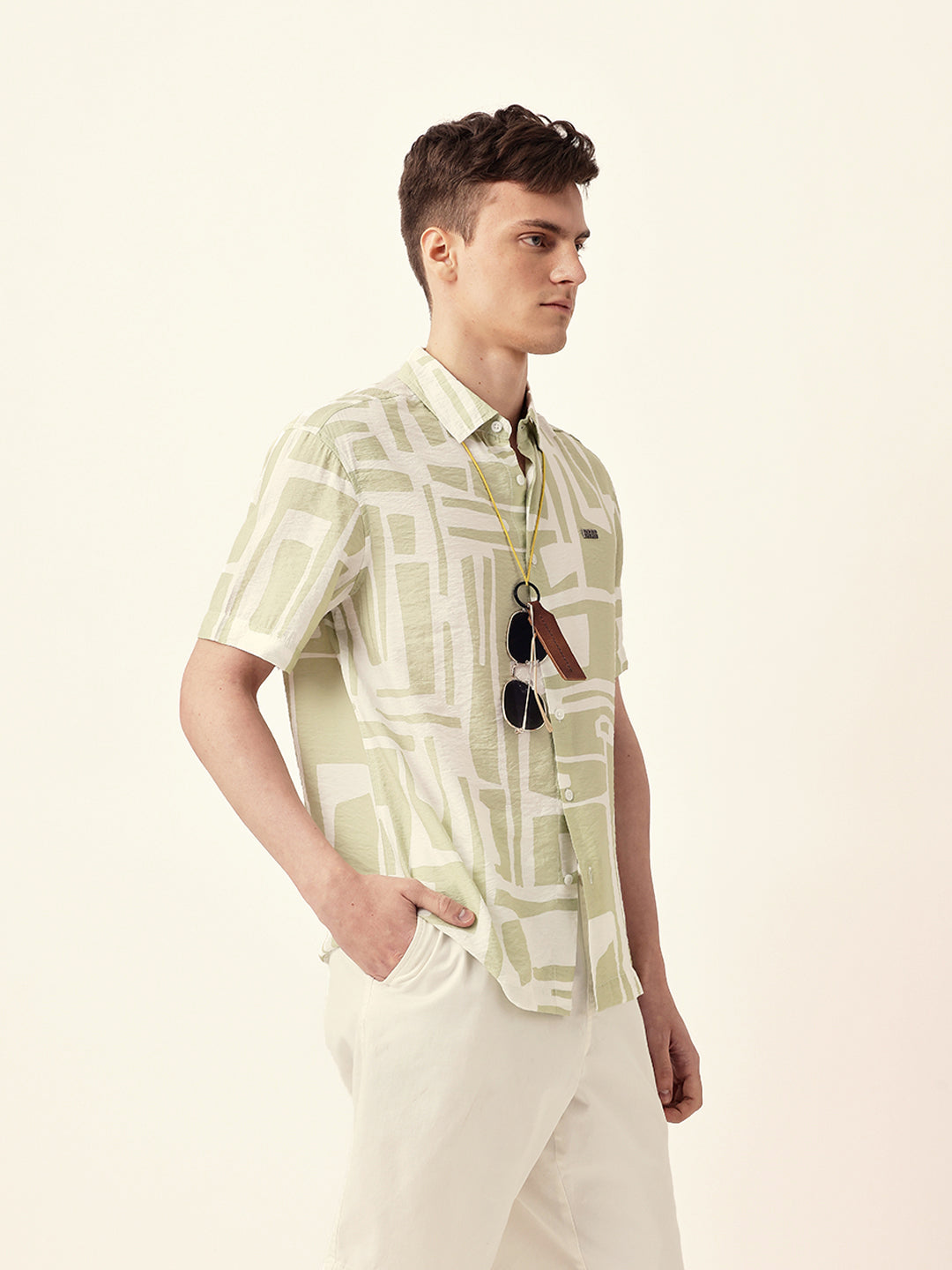 Shop White & Green Relaxed Fit Abstract Stroke Print Half Sleeve Casual Shirt Online.
