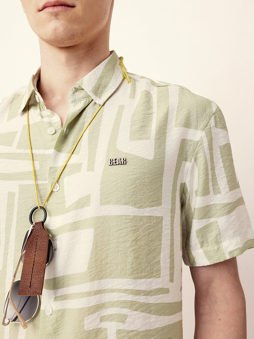 White & Green Relaxed Fit Abstract Stroke Print Half Sleeve Casual Shirt