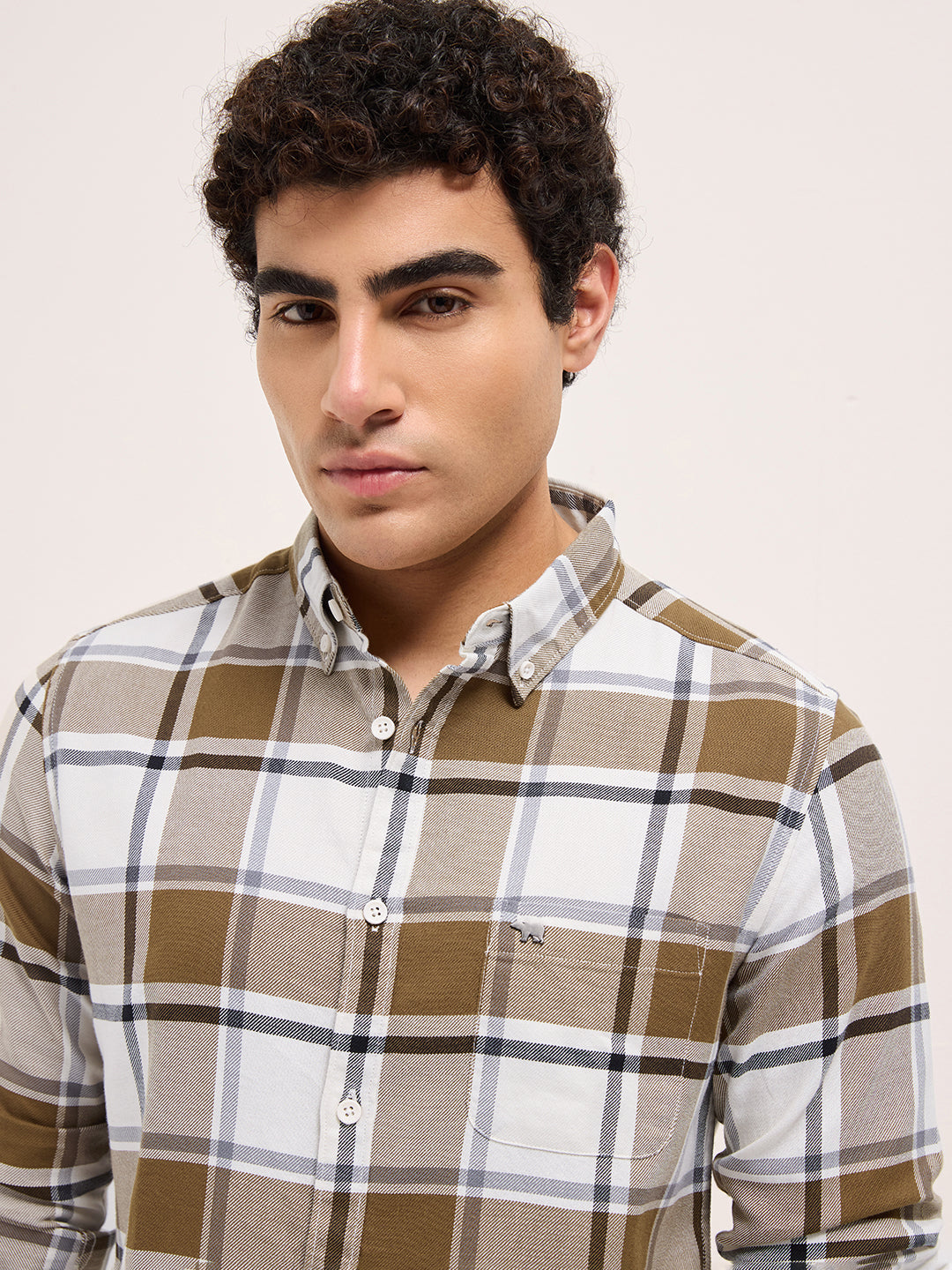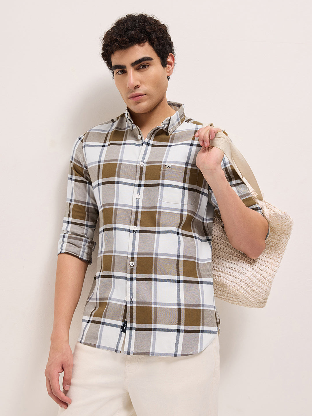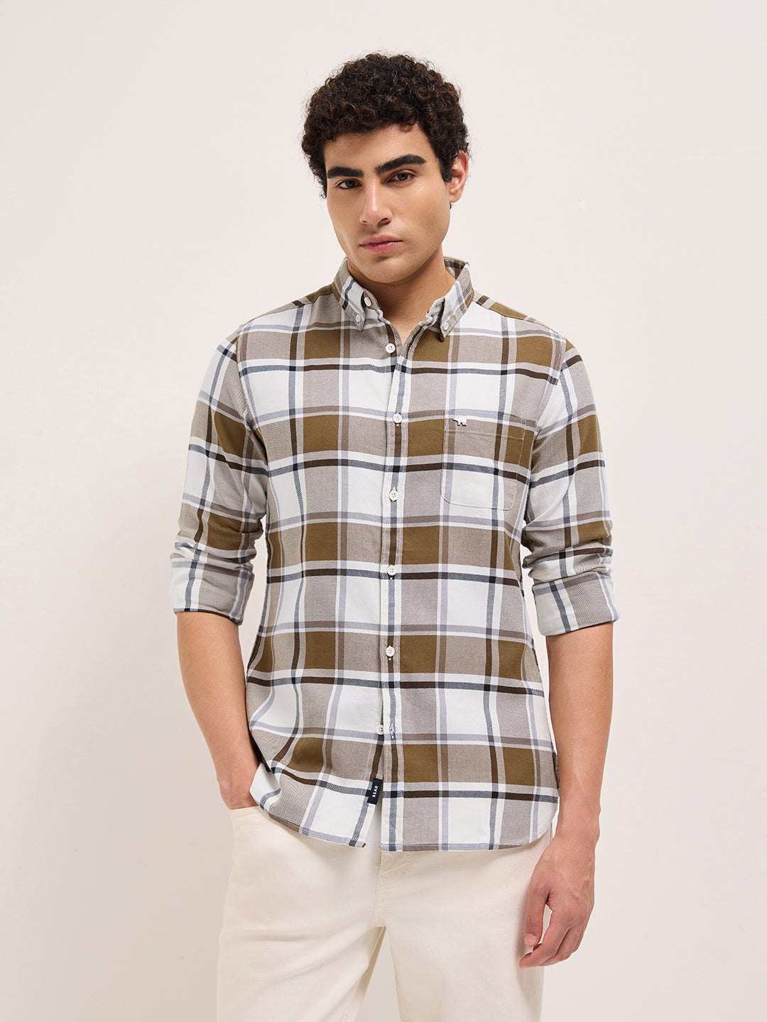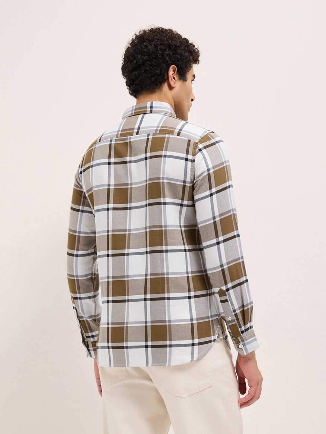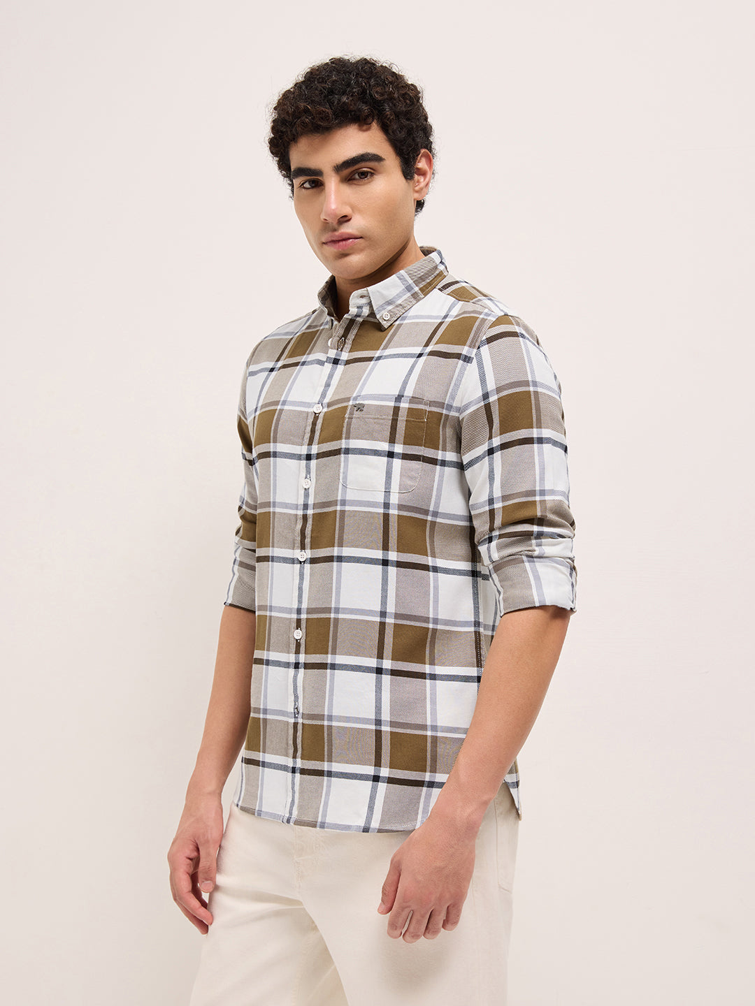 Mustard & White Woven Checks Slim Fit Casual Shirt