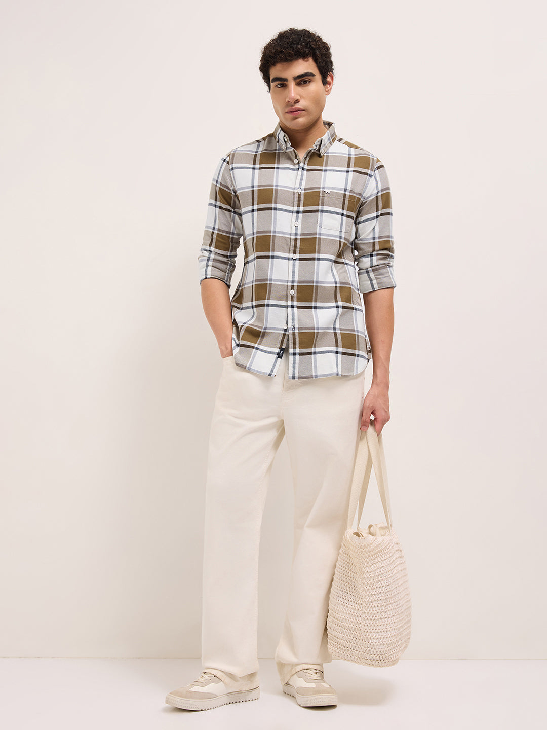 Shop Mustard & White Woven Checks Slim Fit Casual Shirt Online.