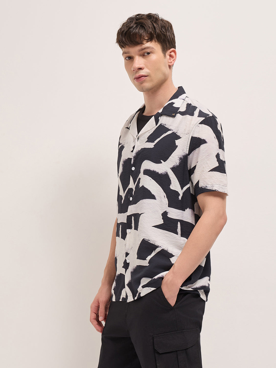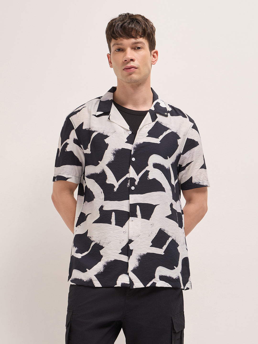 Shop Black Abstract Brushstroke Print Relaxed Fit Cuban Collar Casual Shirt Online.