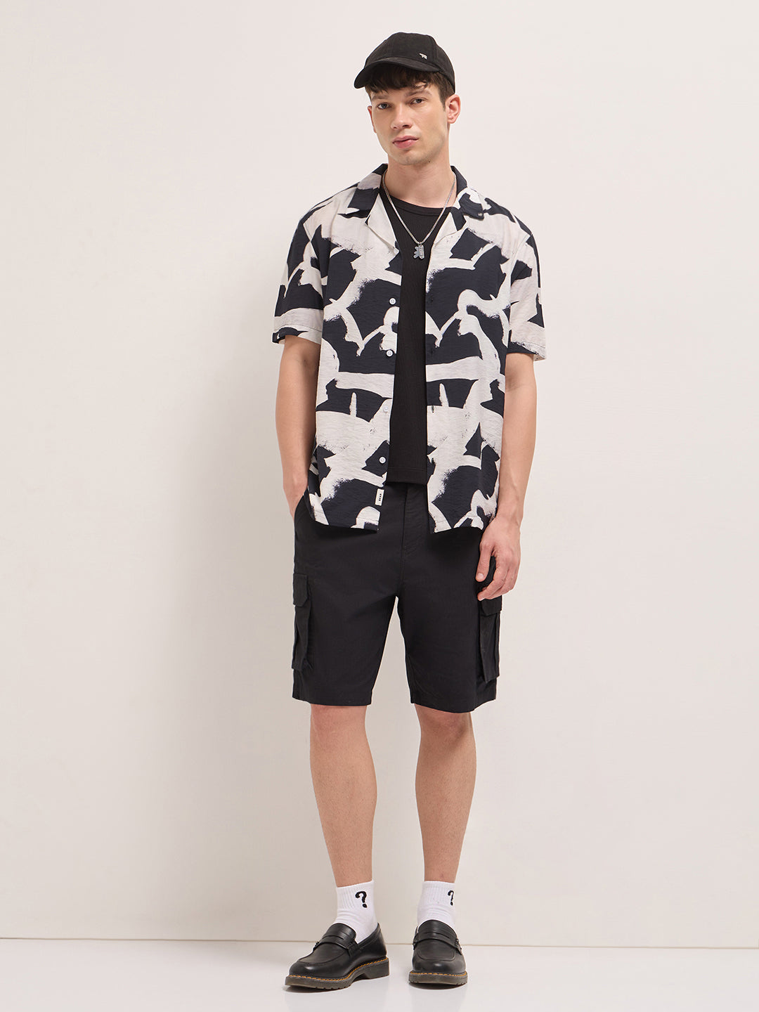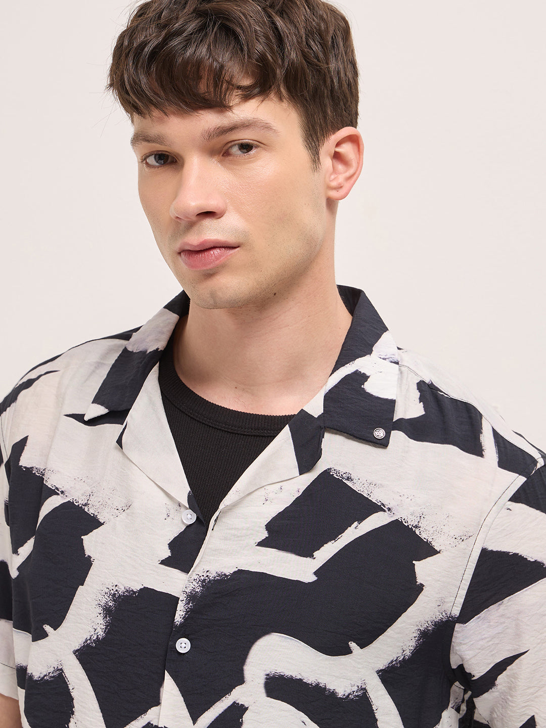 Black Abstract Brushstroke Print Relaxed Fit Cuban Collar Casual Shirt