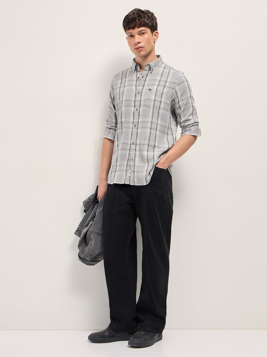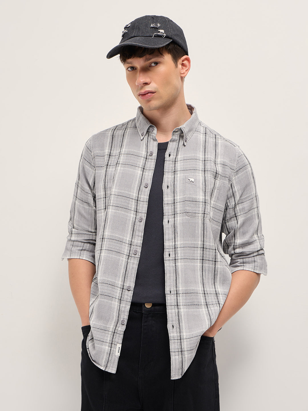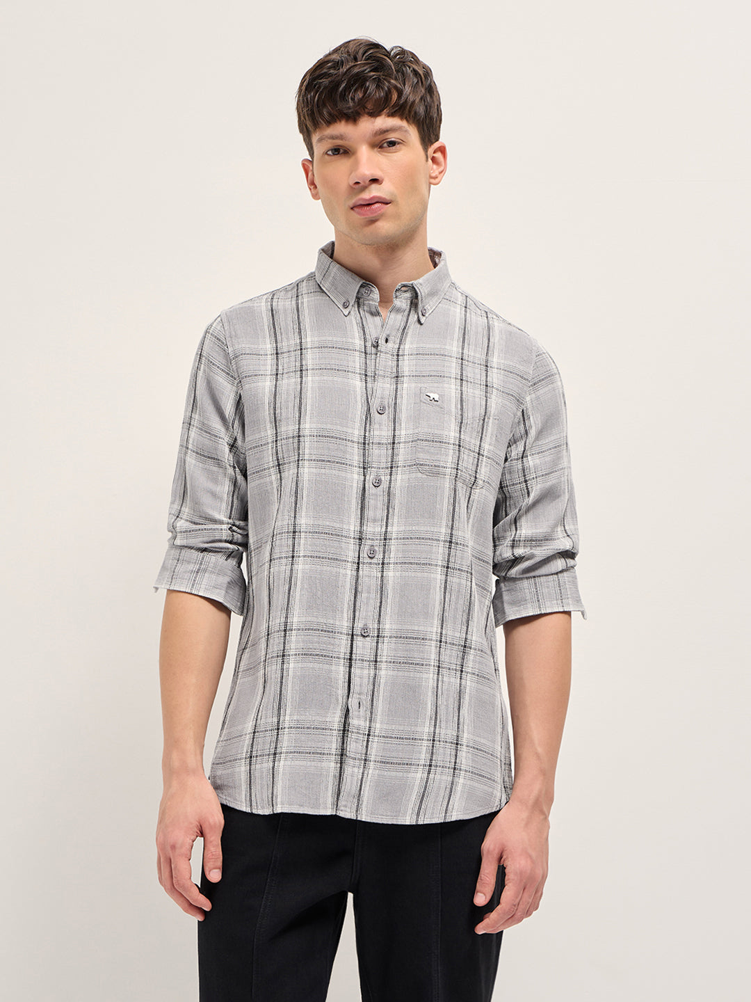 Shop Grey Woven Checkered Cotton Slim Fit Casual Shirt Online.