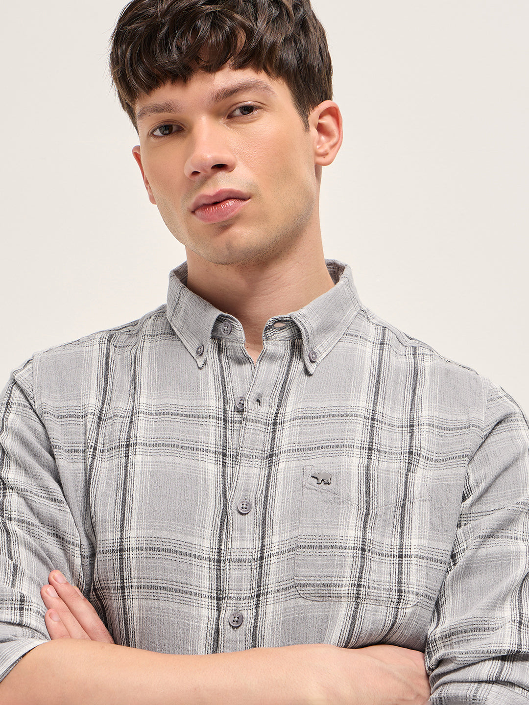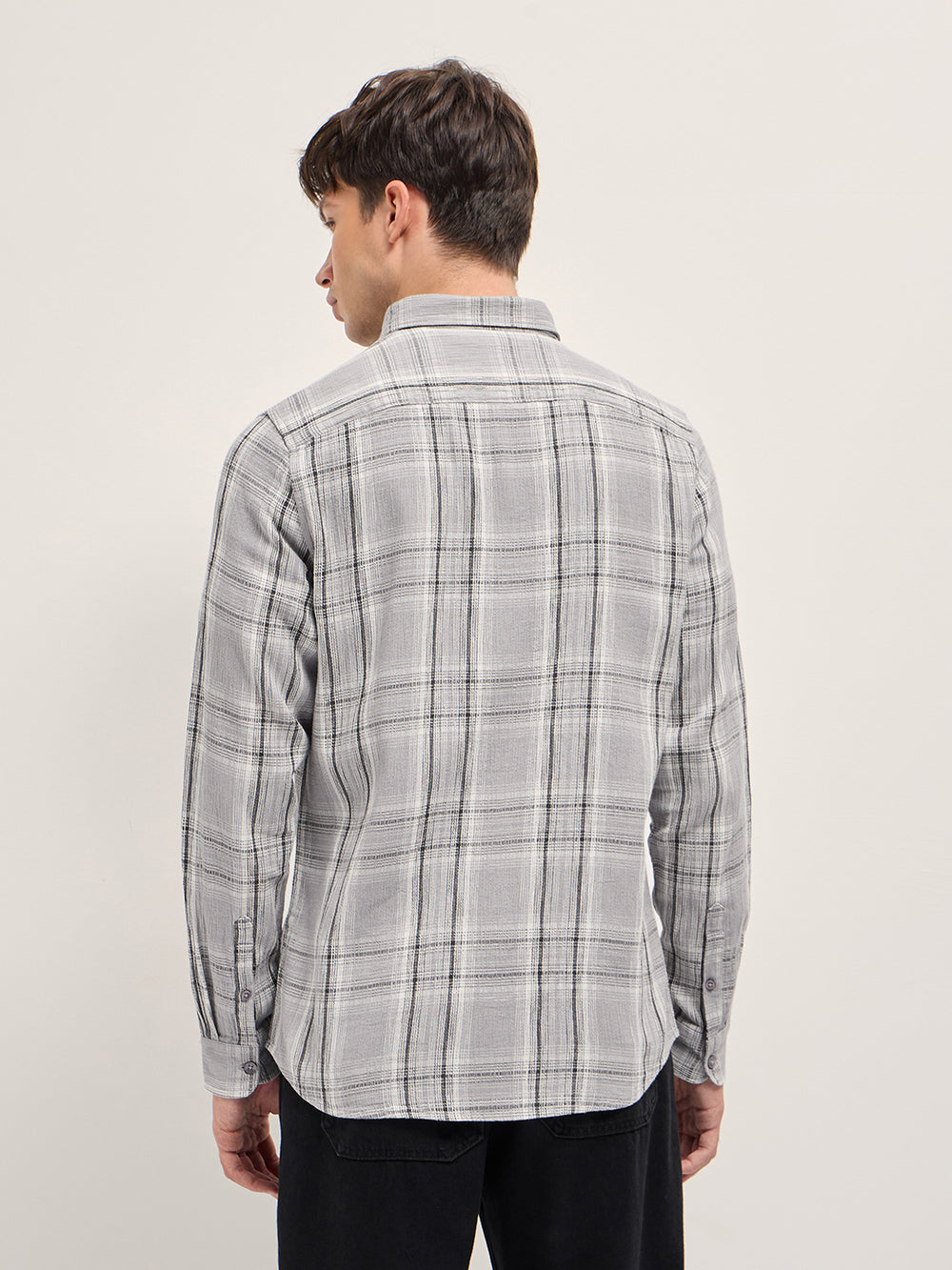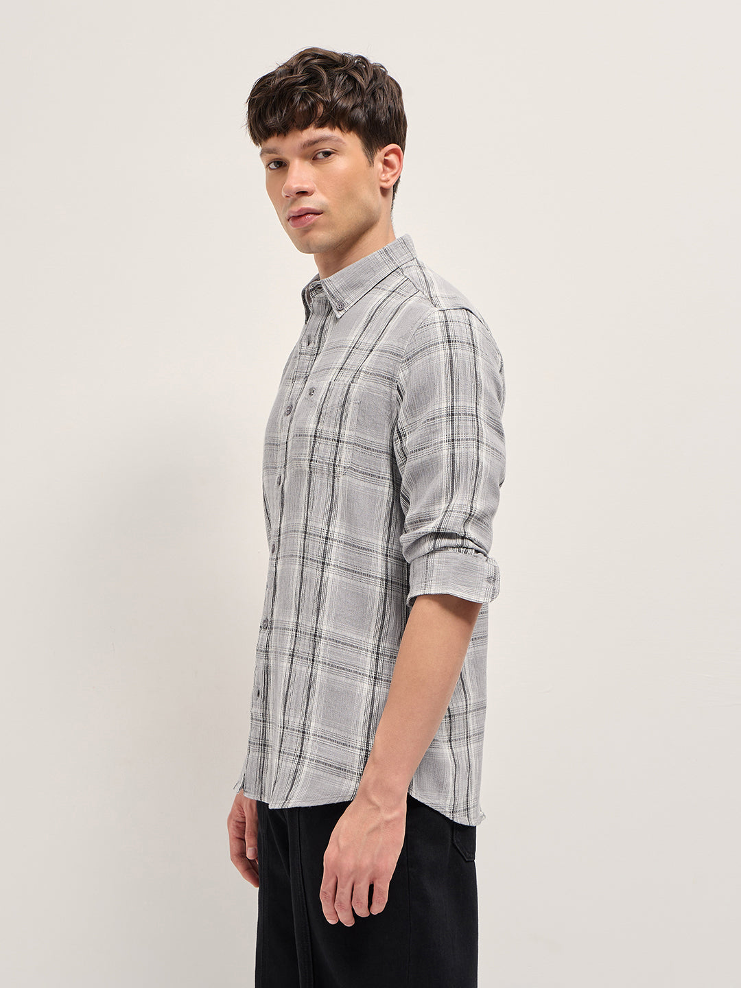 Grey Woven Checkered Cotton Slim Fit Casual Shirt