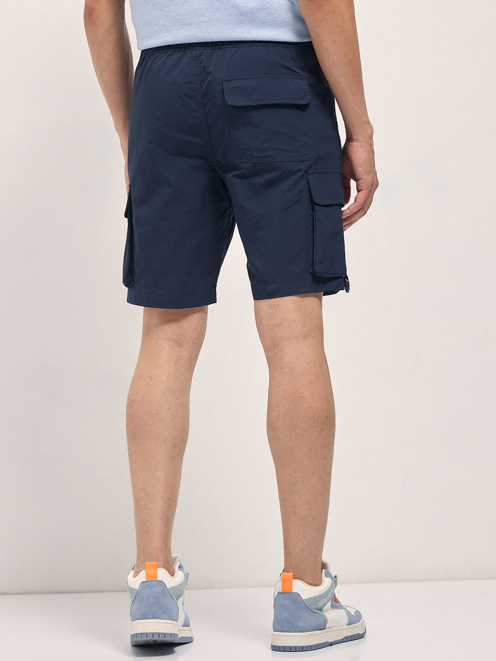 Shop Navy Blue Solid Nylon Cargo Shorts with Multiple Utility Pockets Online