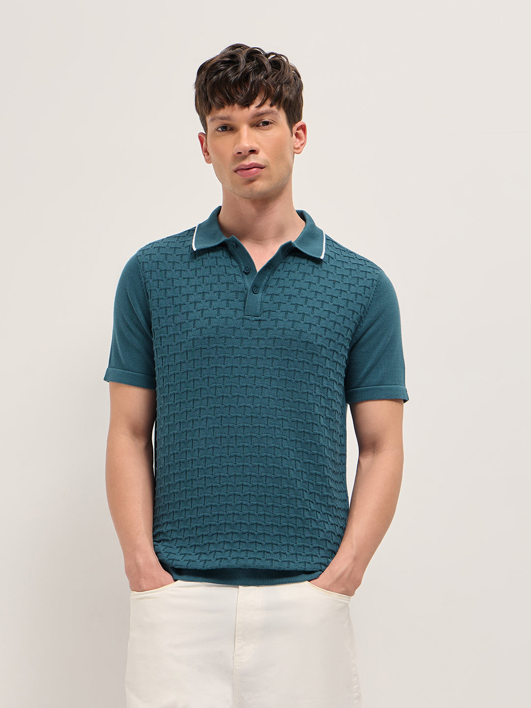 Teal Regular Fit Geometric Textured Knit Polo Shirt