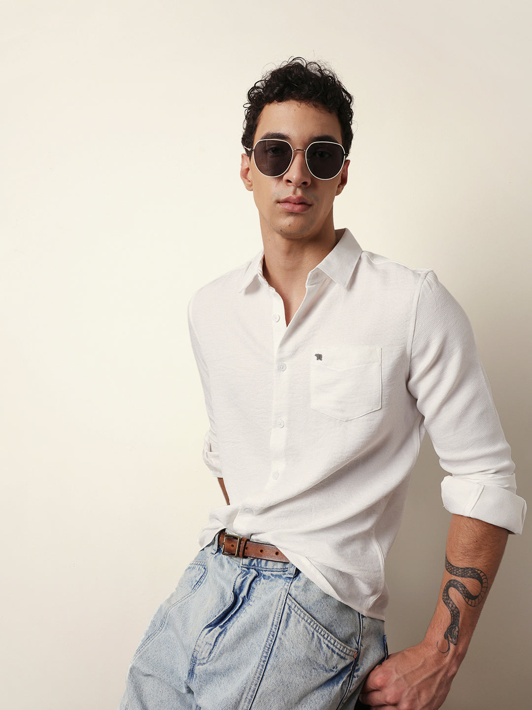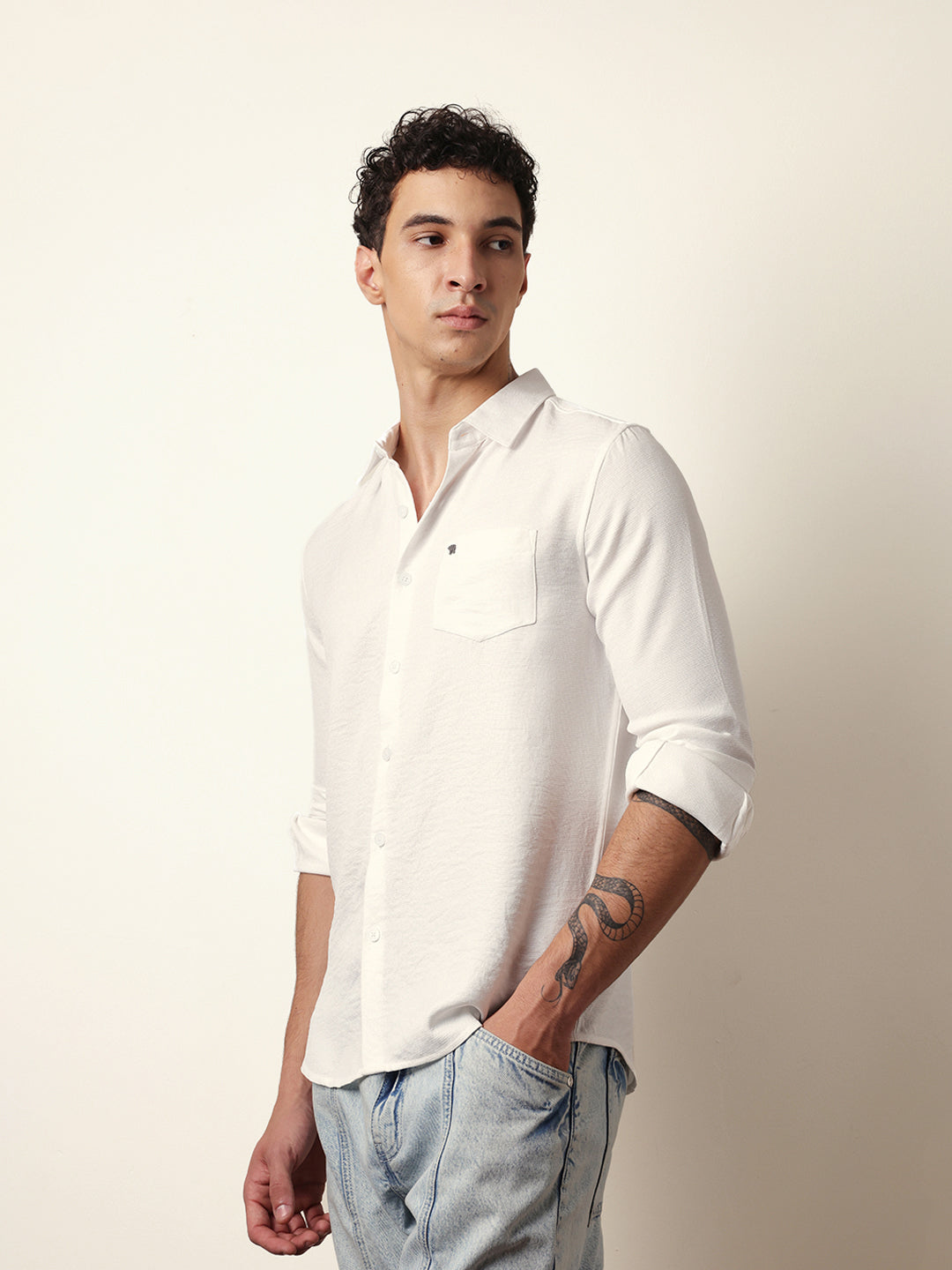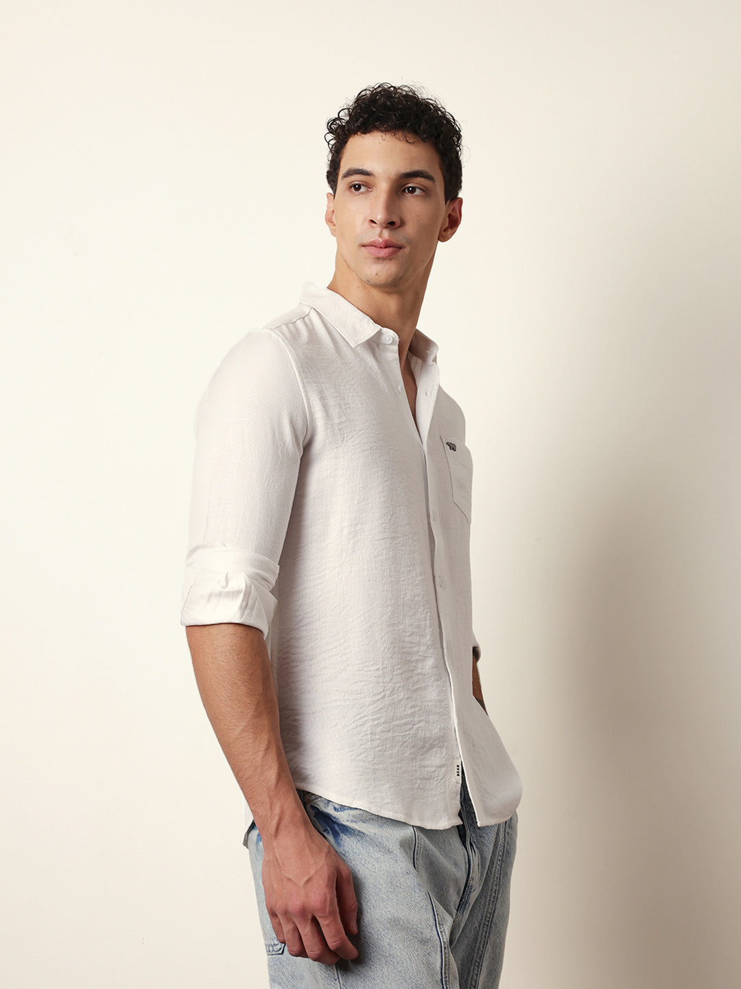 Shop White Woven Solid Slim Fit Casual Shirt Online.