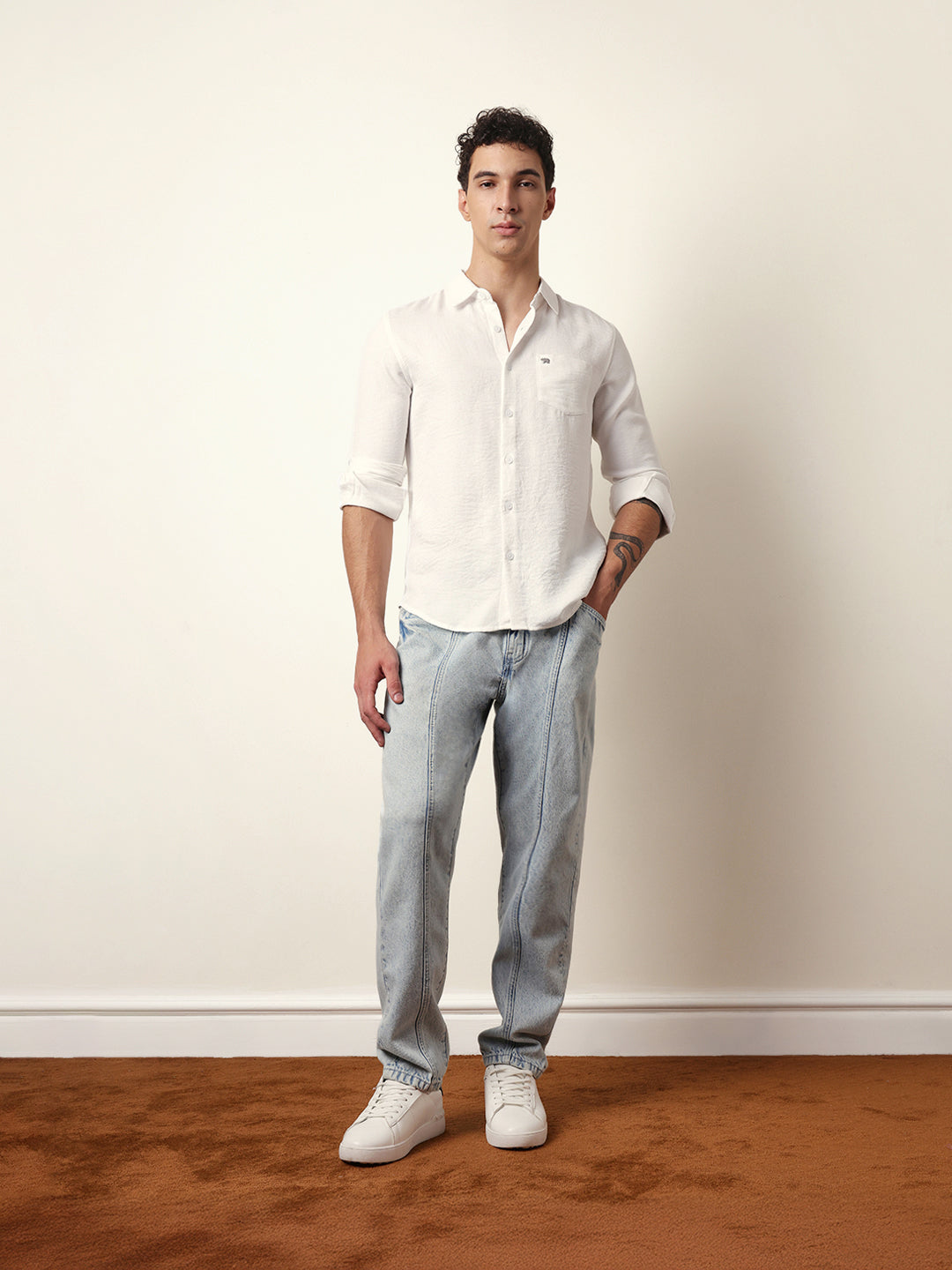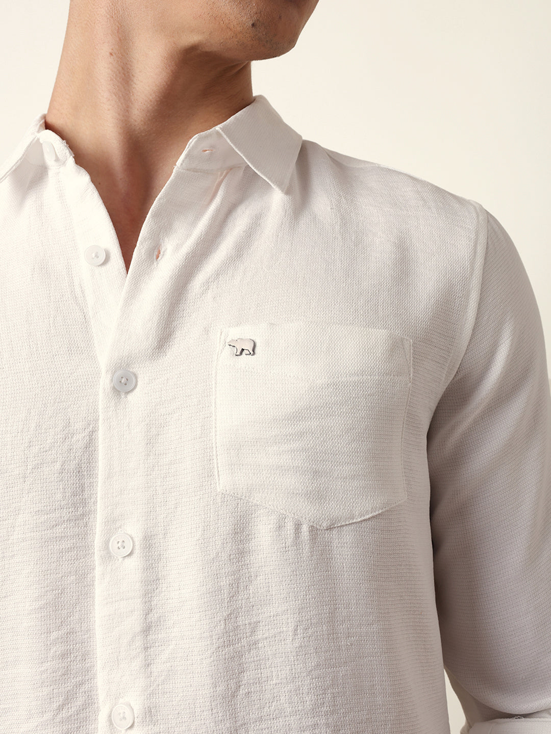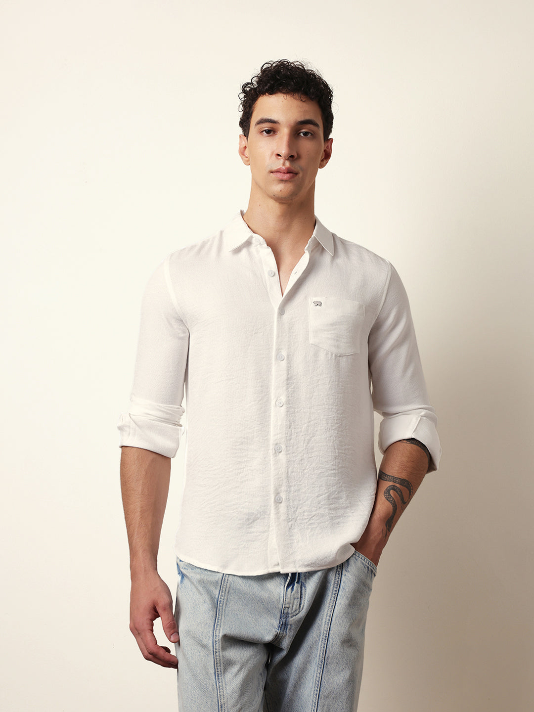 Shop White Woven Solid Slim Fit Casual Shirt Online.