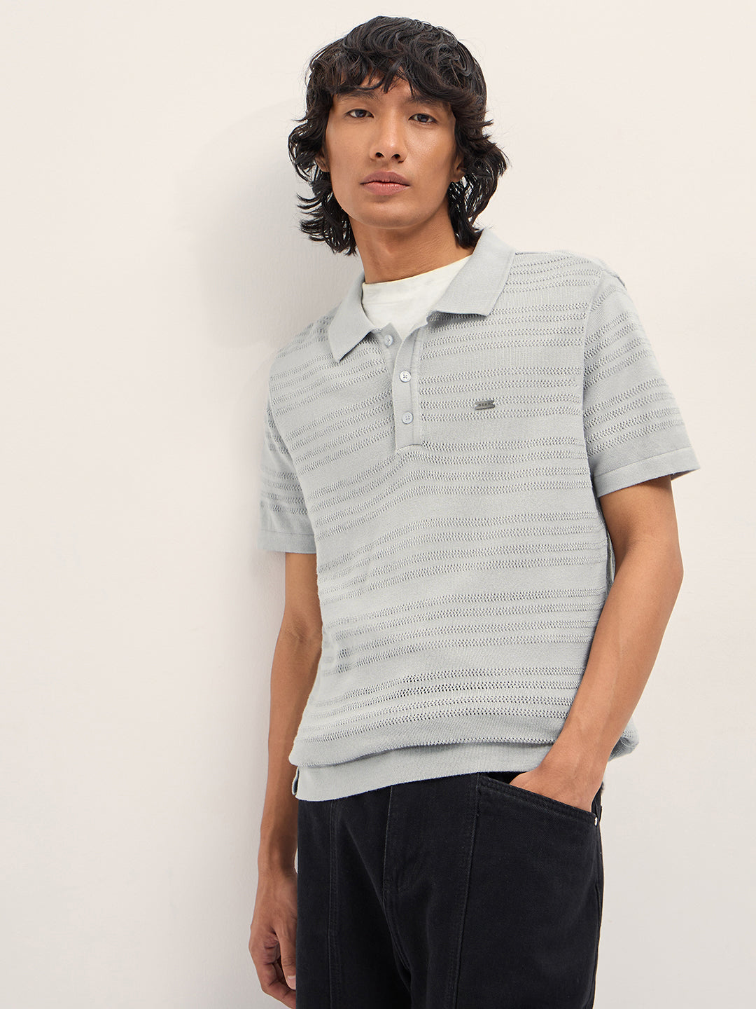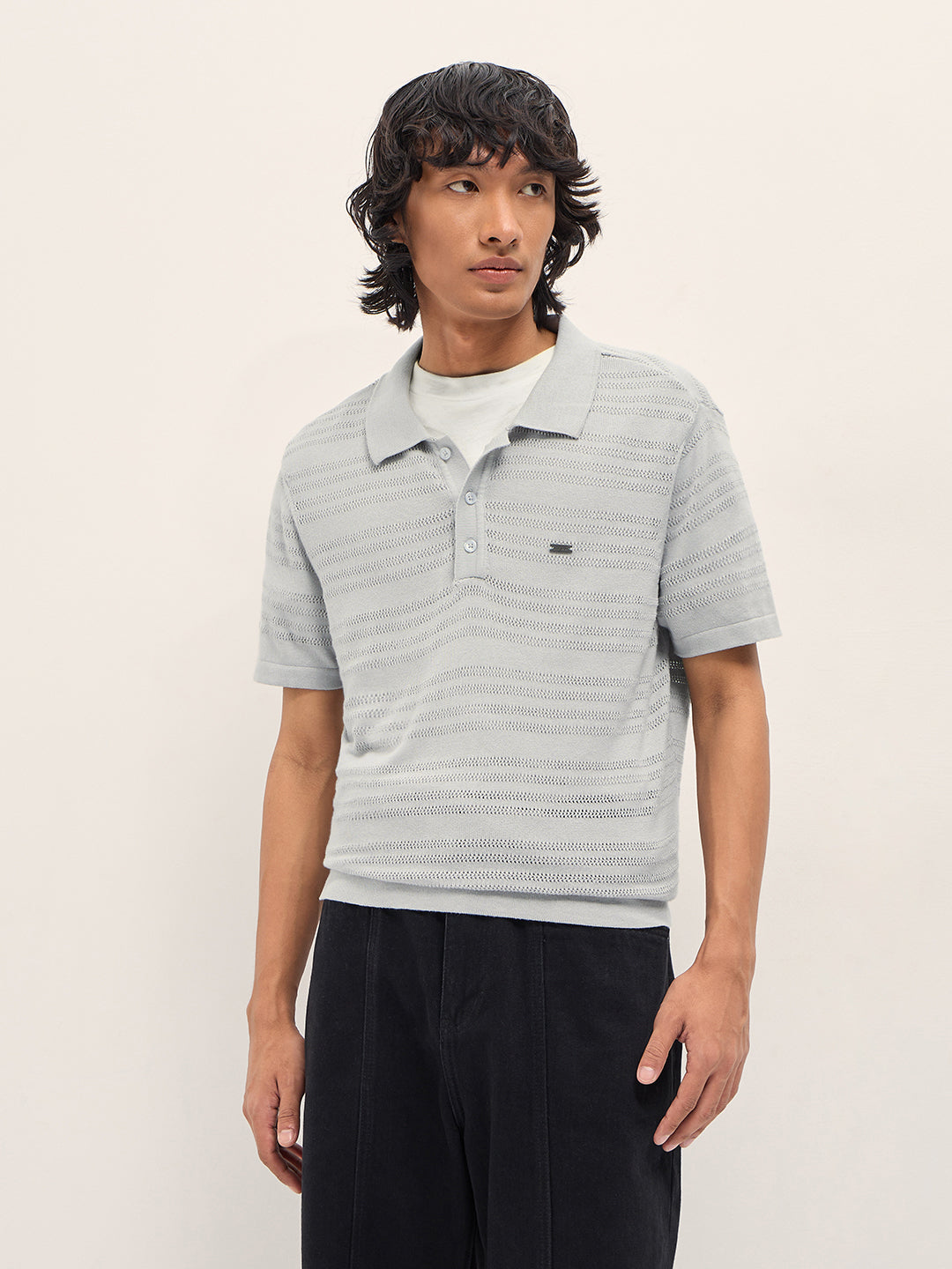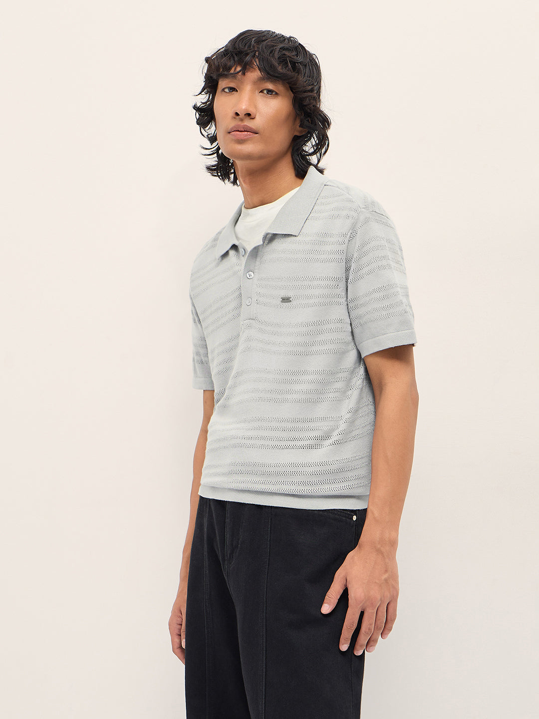 Grey Regular Fit Horizontal Textured Knit Polo Shirt with Transparent Effect