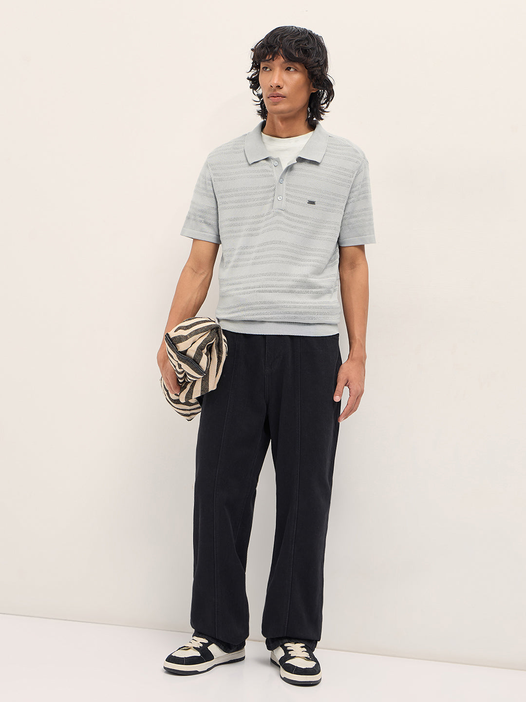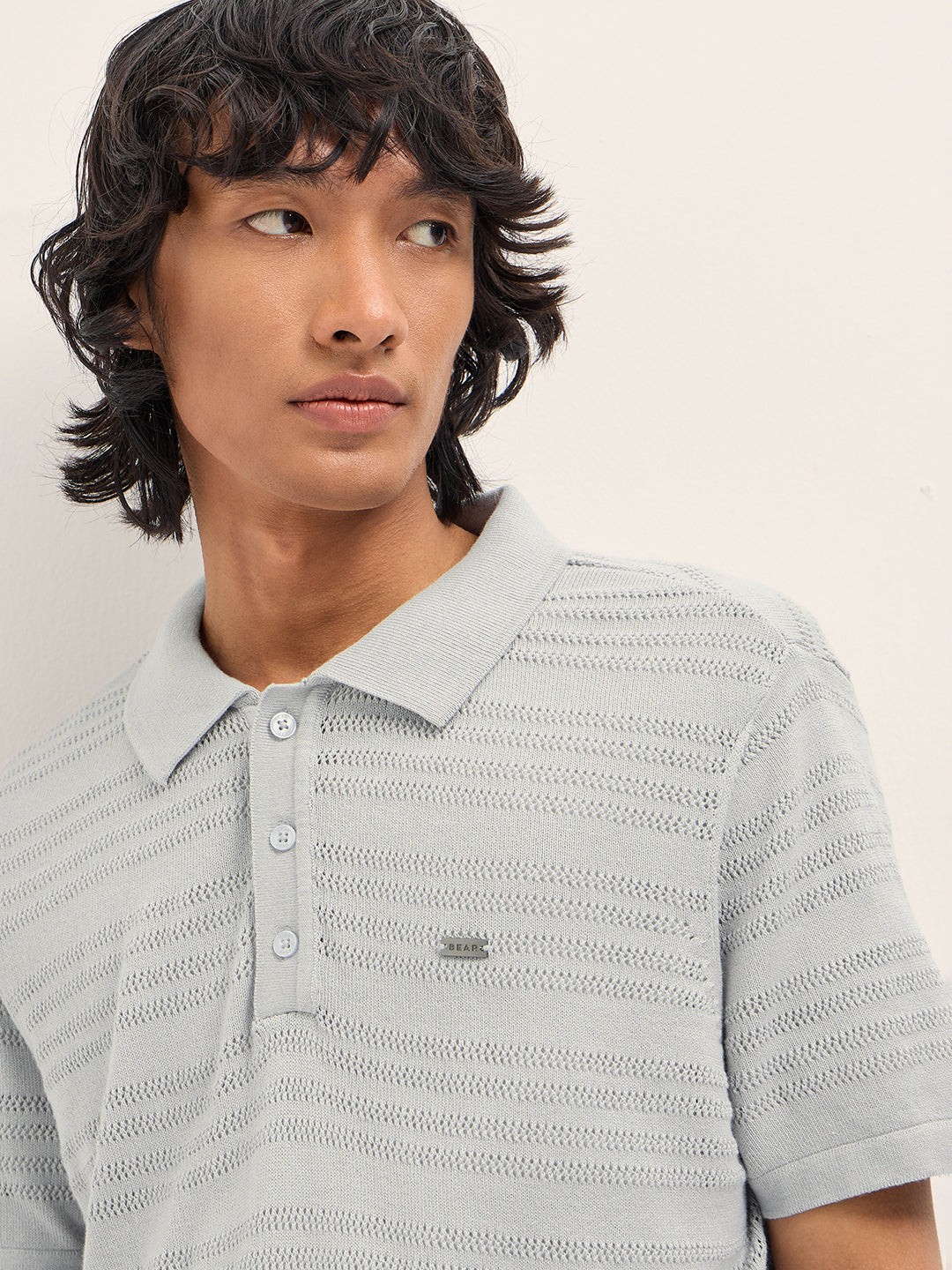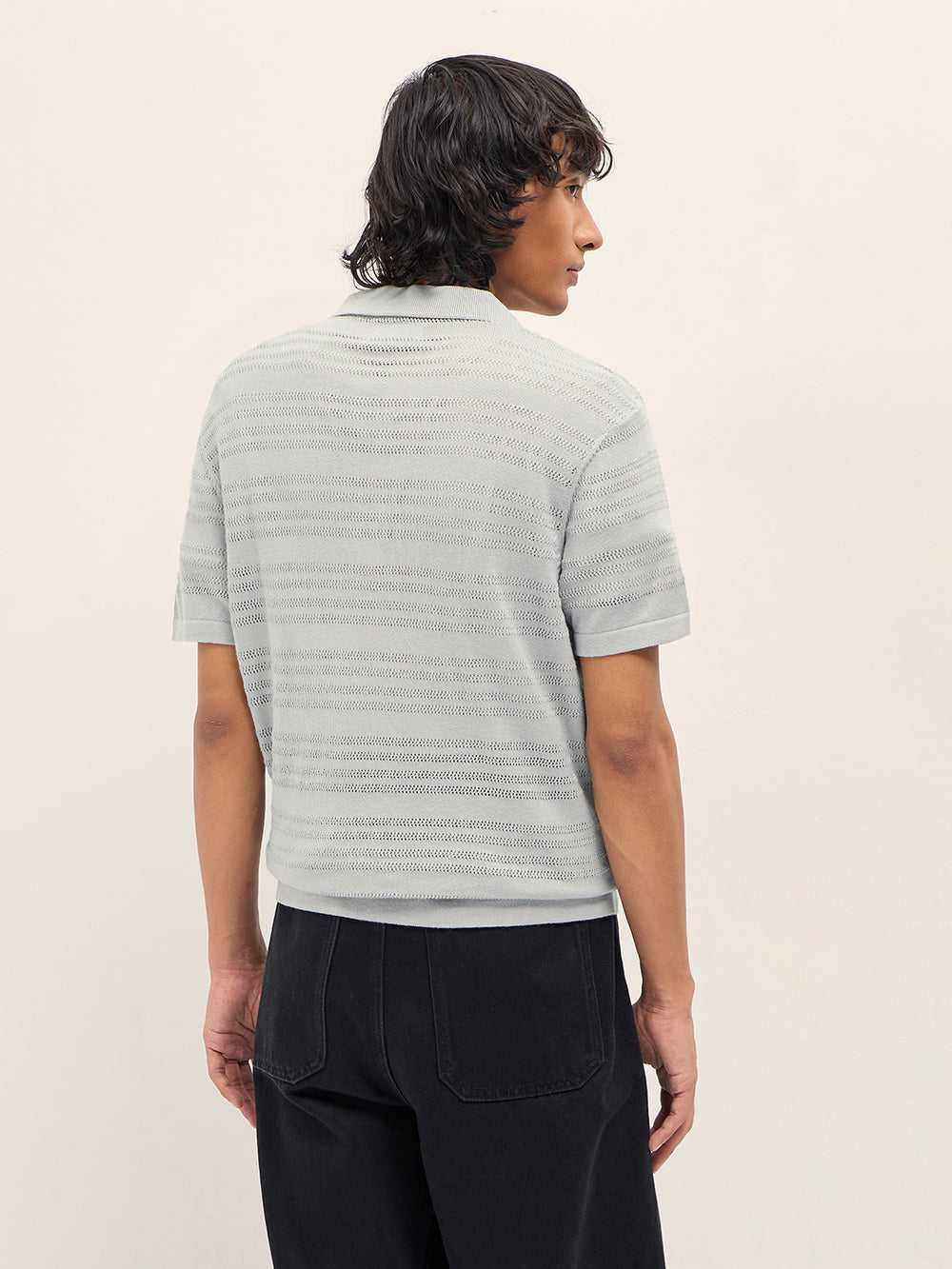 Grey Regular Fit Horizontal Textured Knit Polo Shirt with Transparent Effect