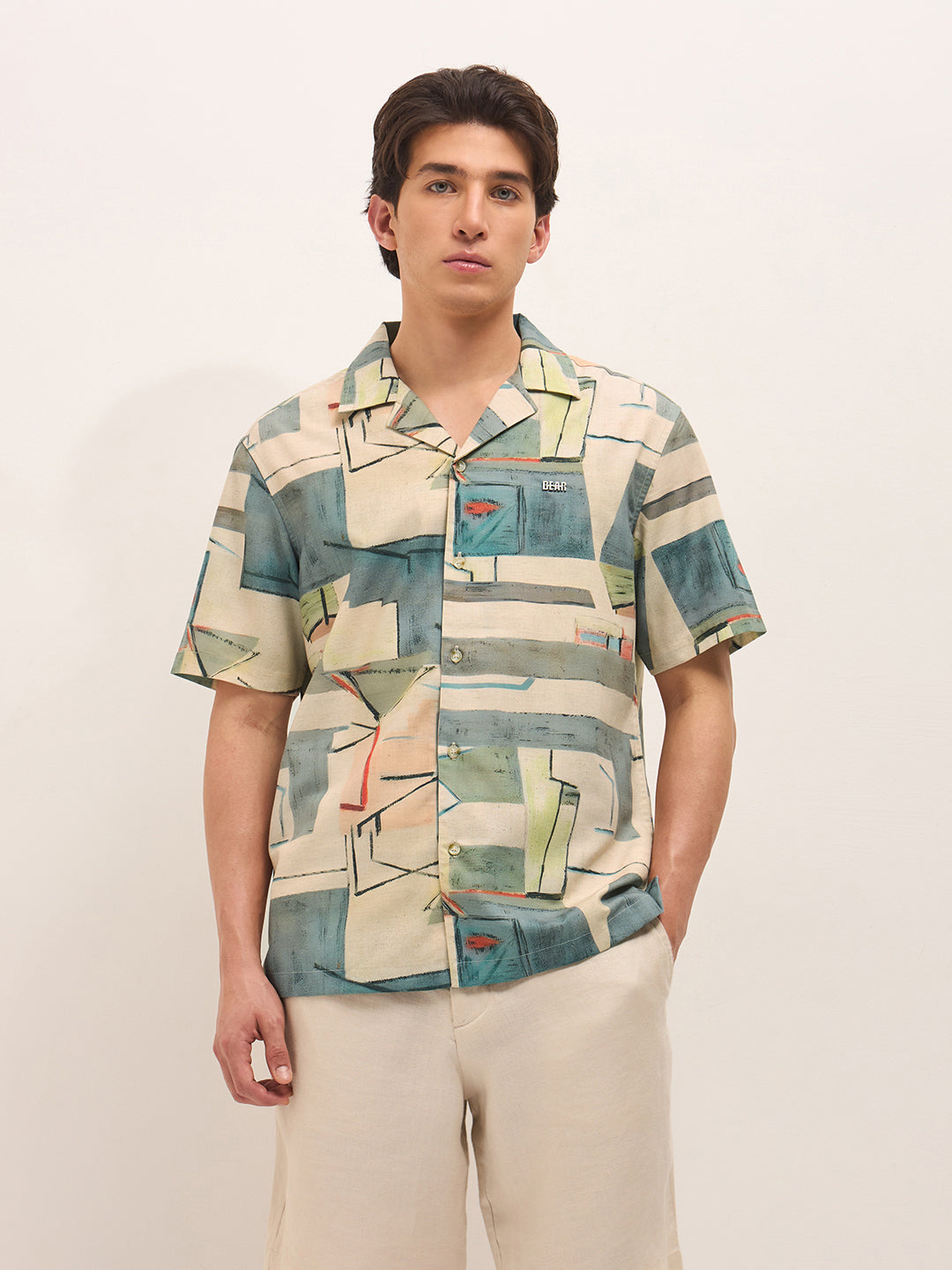 Multicolor Relaxed Fit Cuban Collar Shirt with Abstract Geometric Print