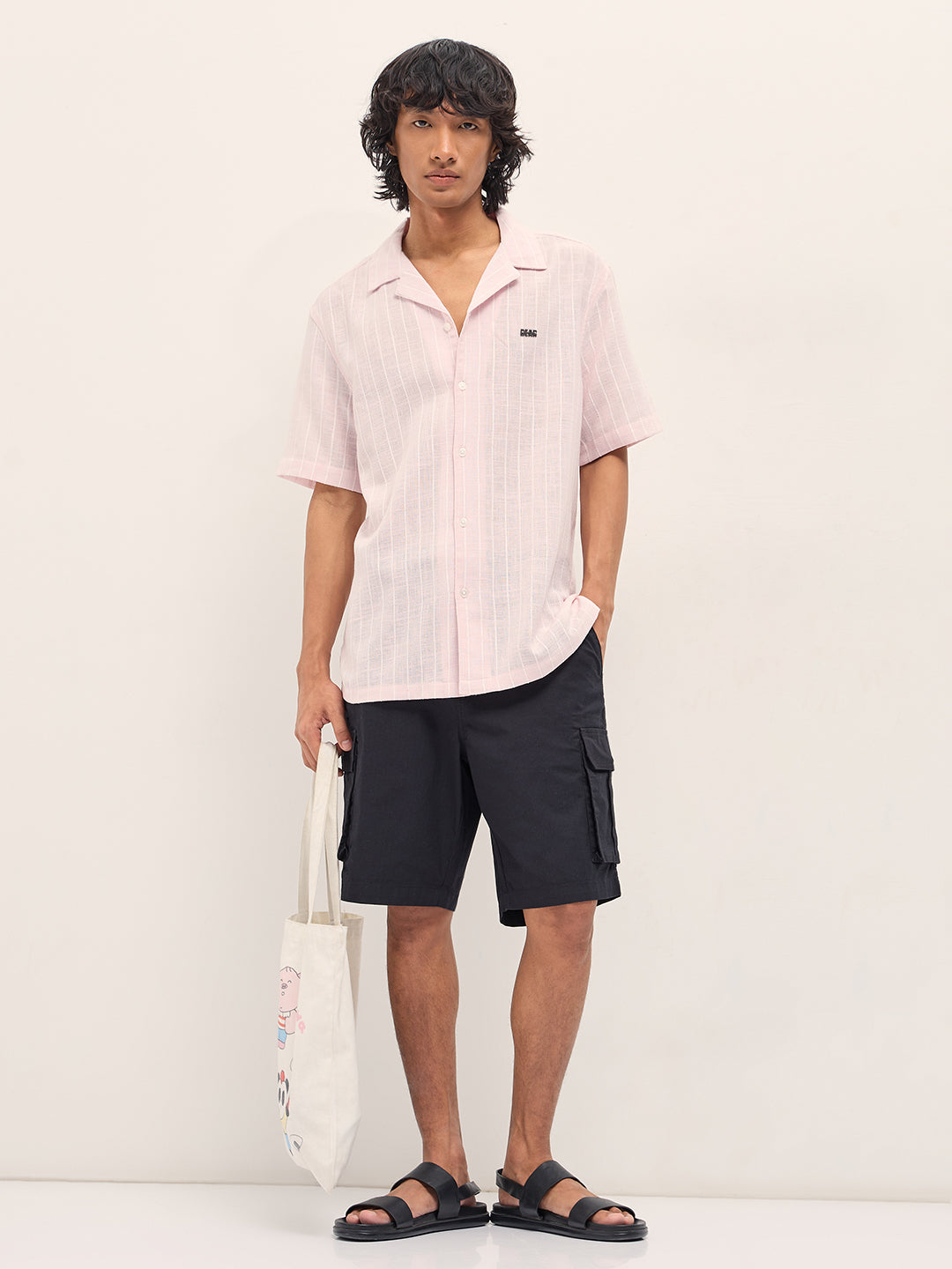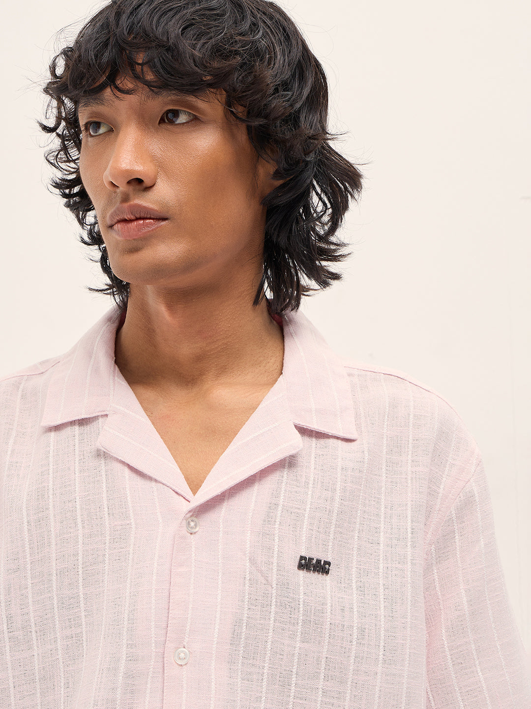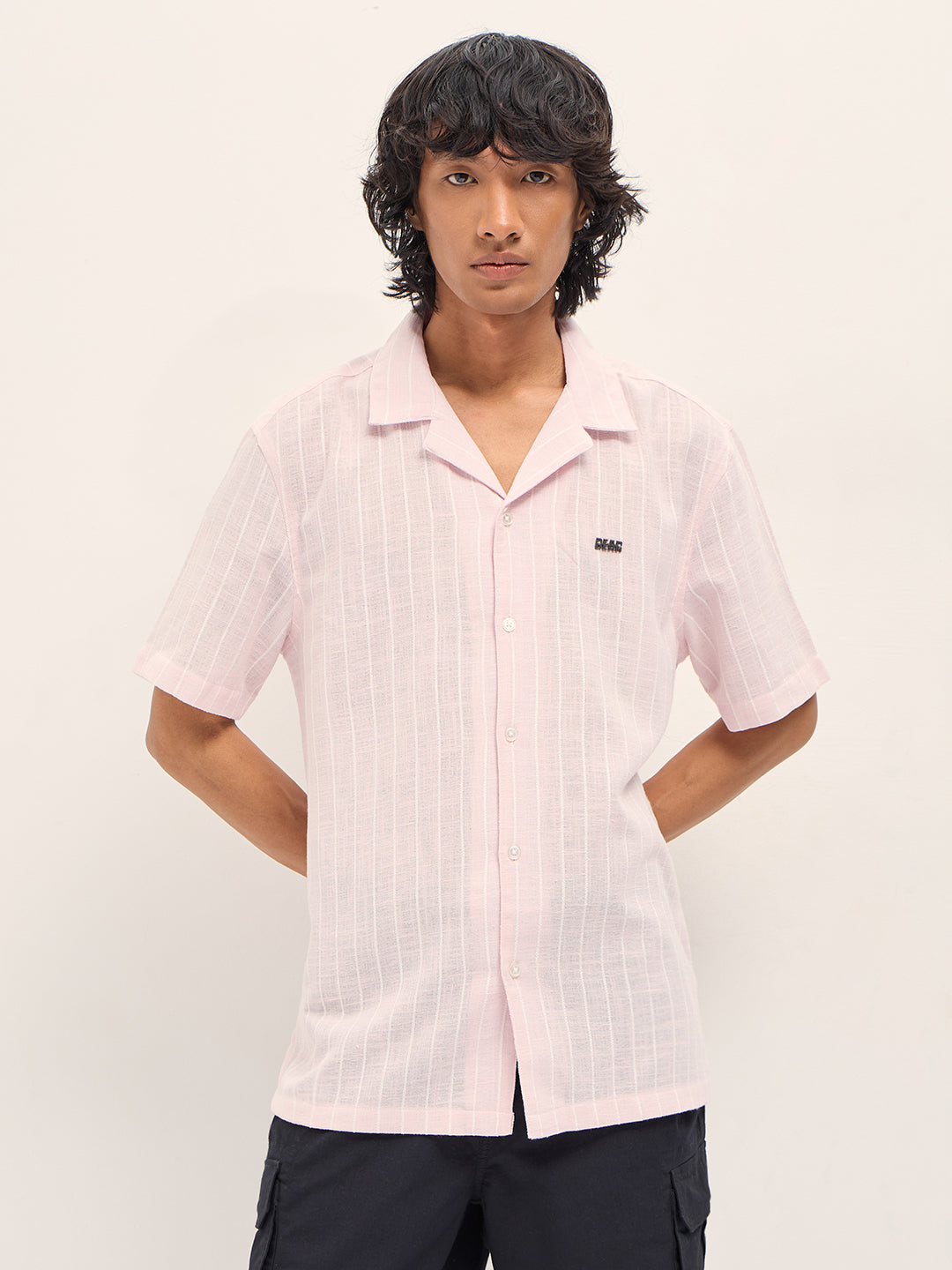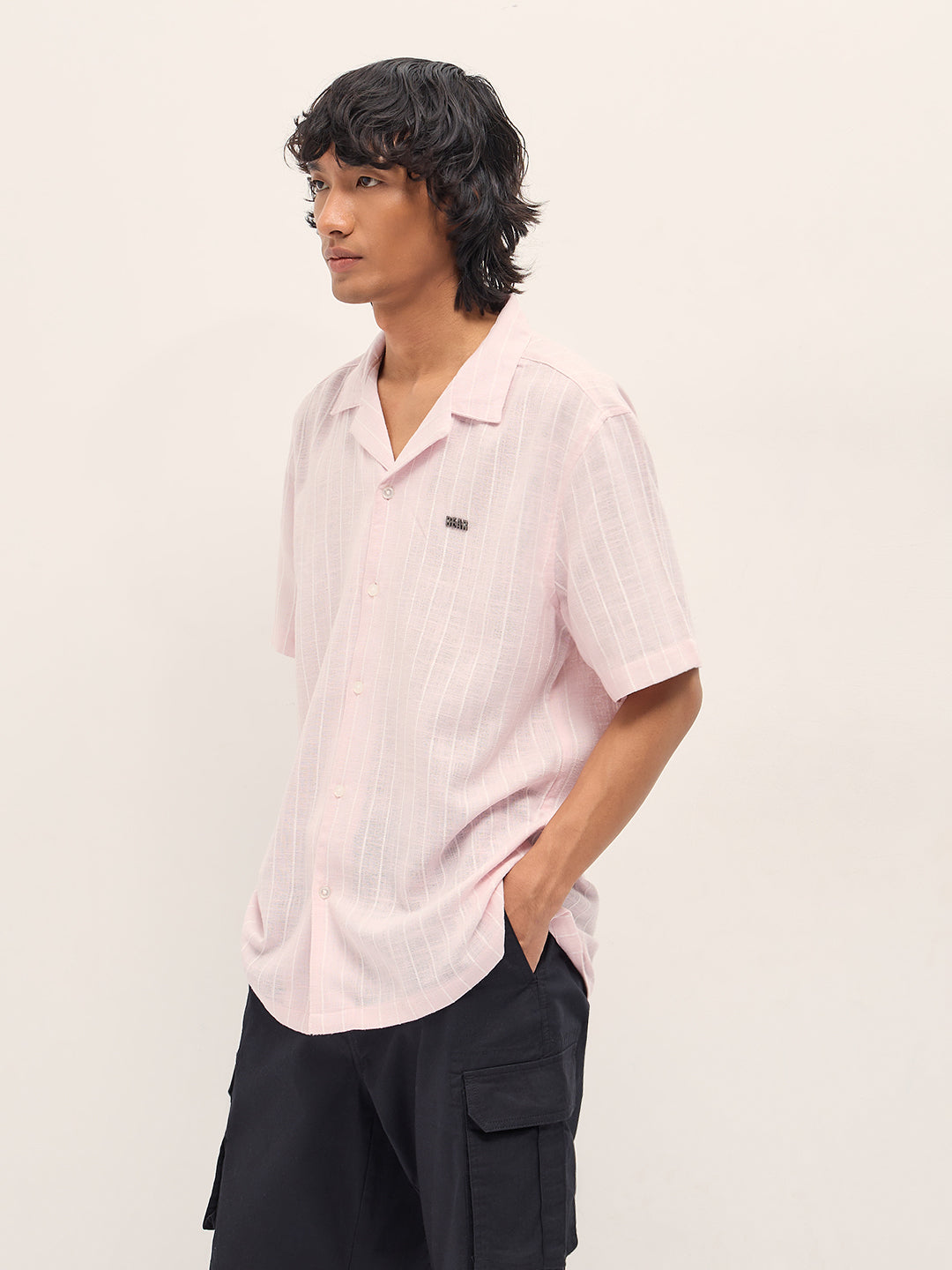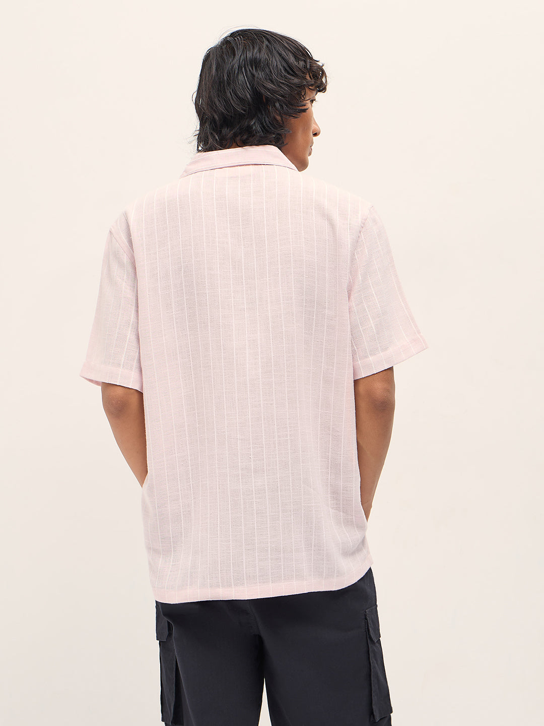 Light Pink Vertical Textured Stripe Relaxed Fit Half Sleeve Casual Shirt