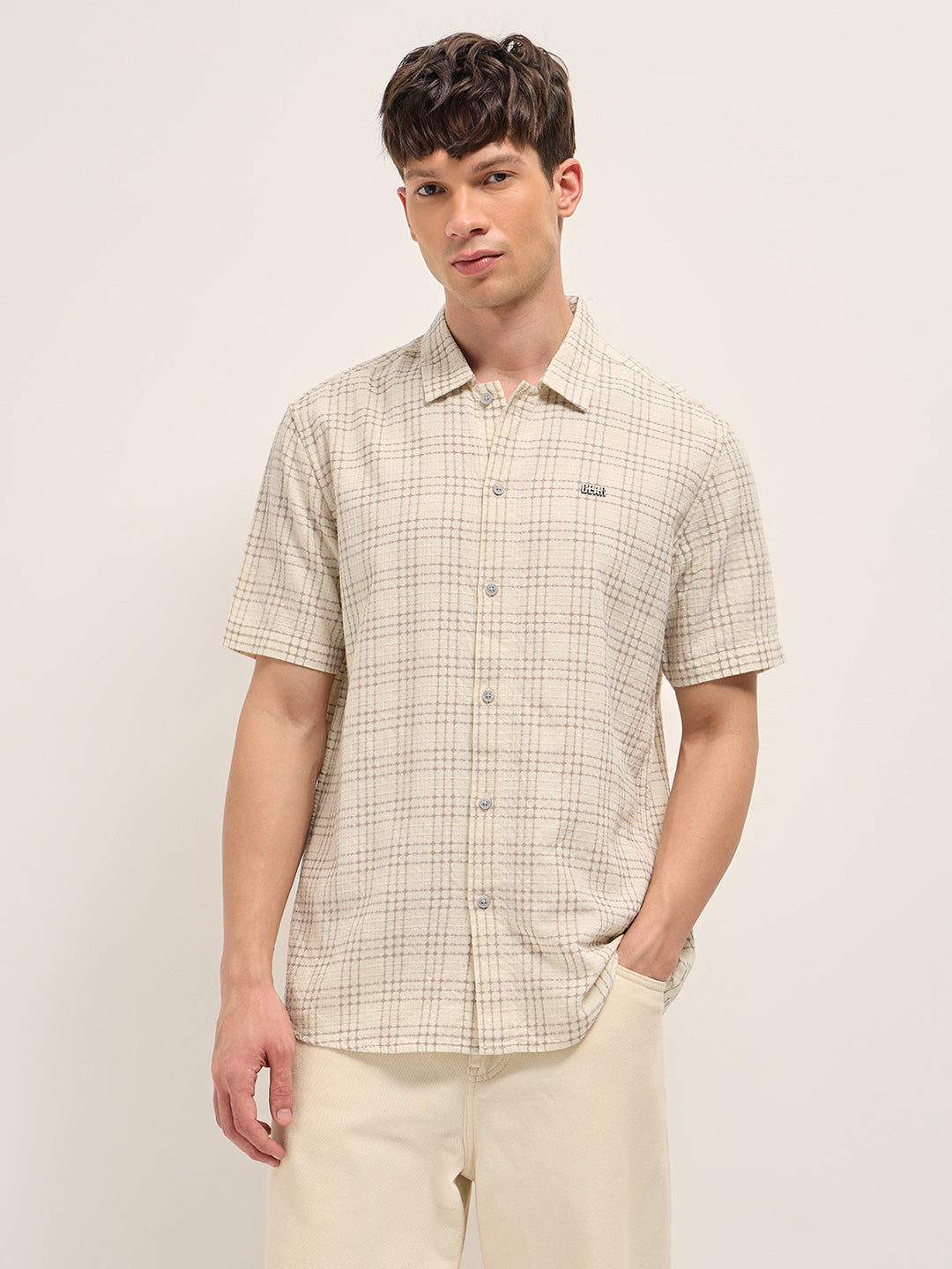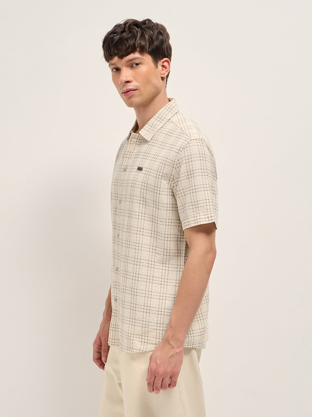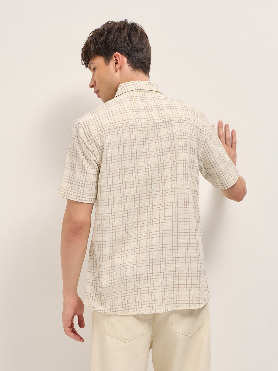 Cream Textured Checked Regular Fit Half-Sleeve Casual Shirt