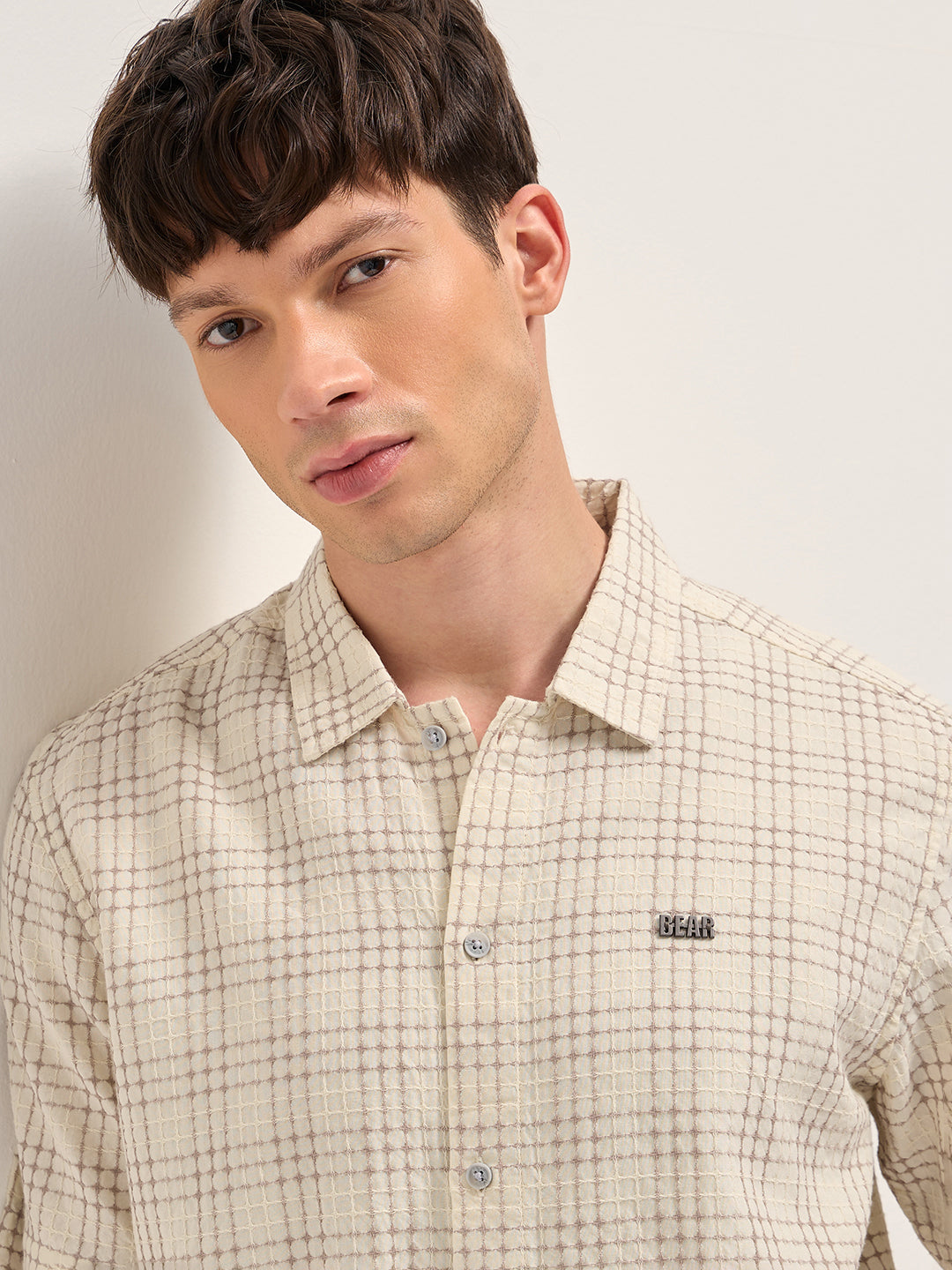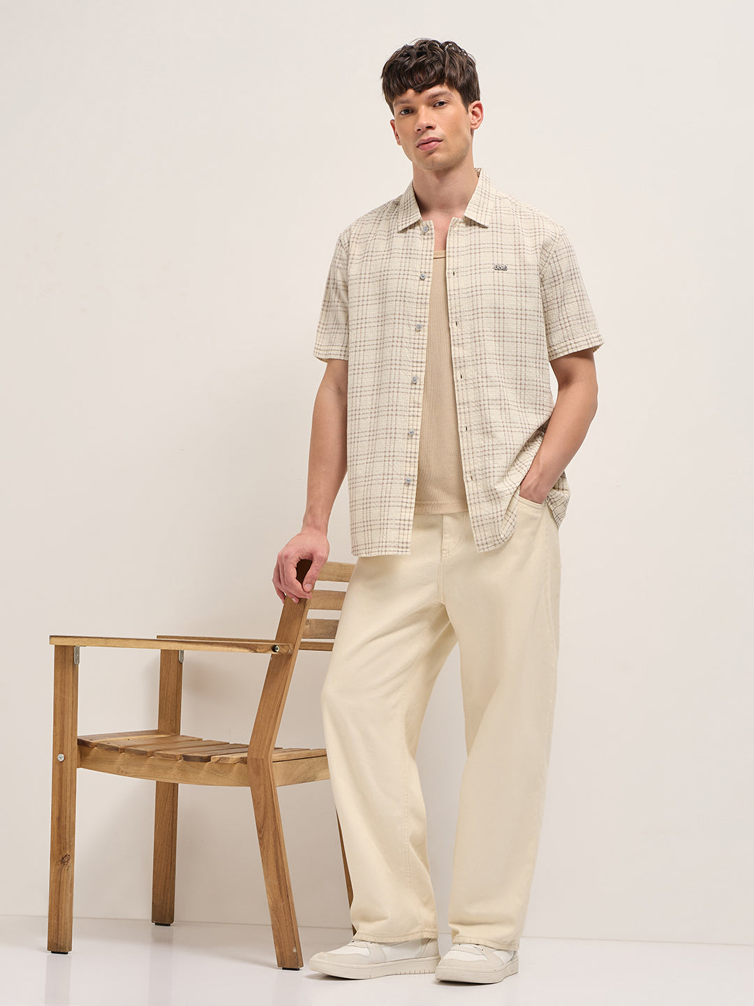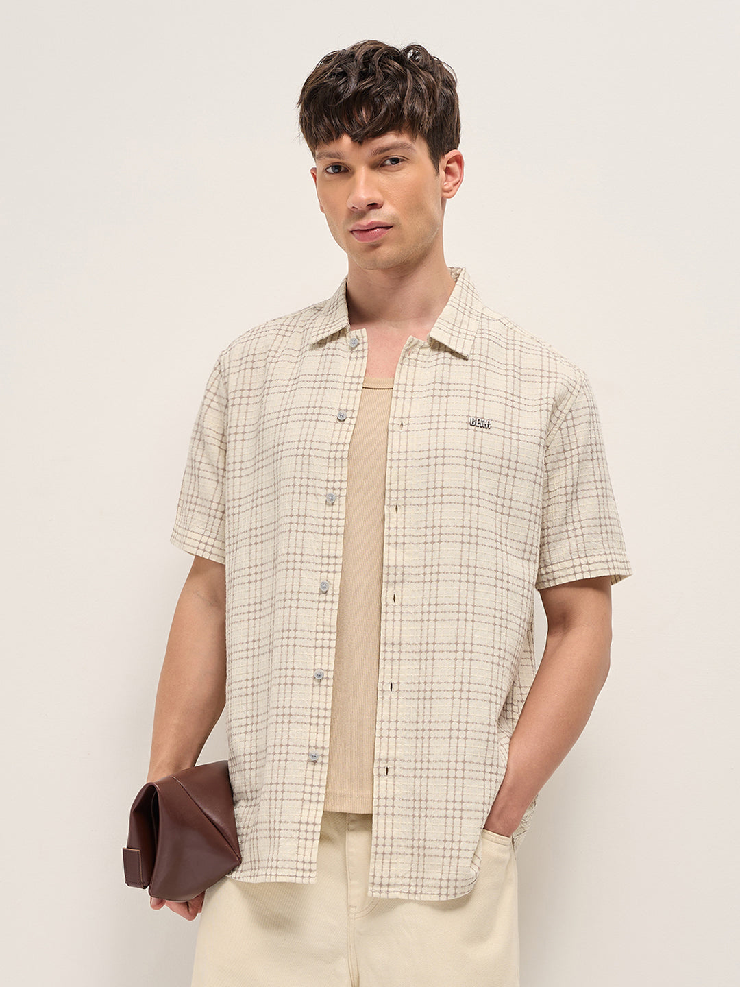 Cream Textured Checked Regular Fit Half-Sleeve Casual Shirt