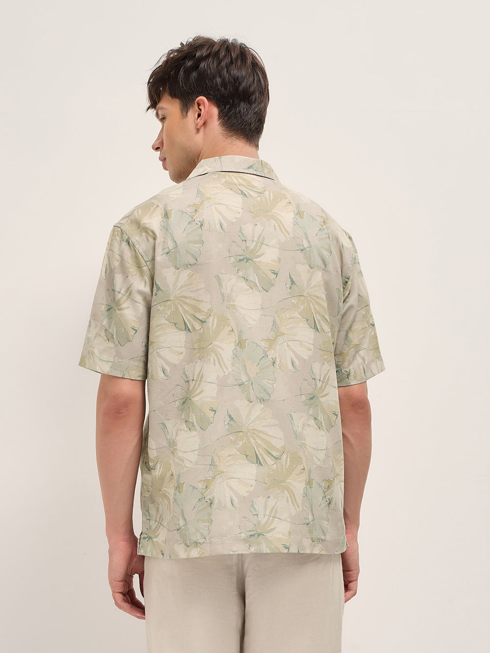 Beige Oversized Fit Cuban Collar Shirt with Tropical Leaf Print
