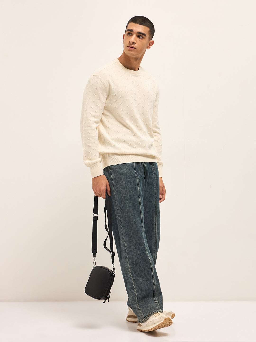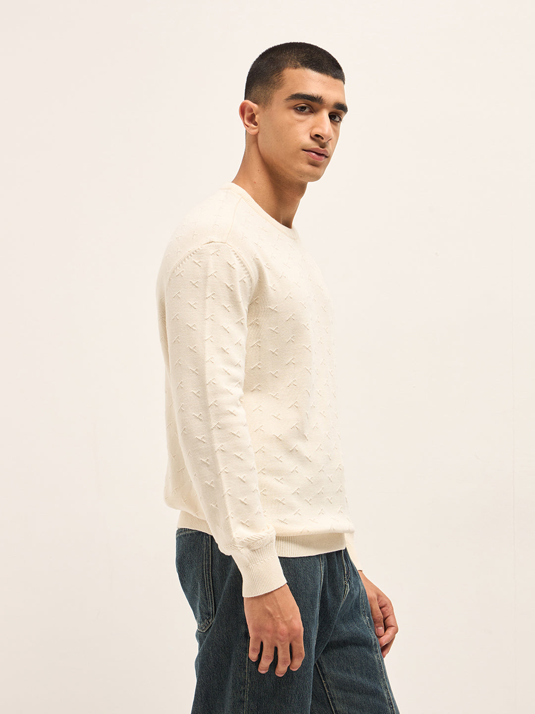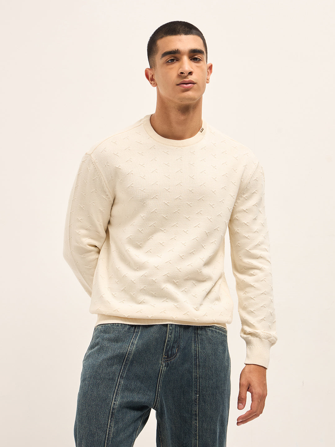 Cream Textured Knit Relaxed Fit Full Sleeve Sweater