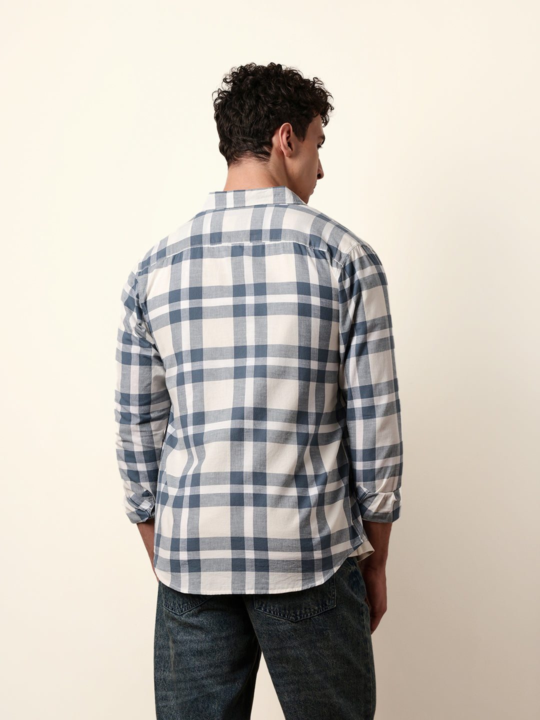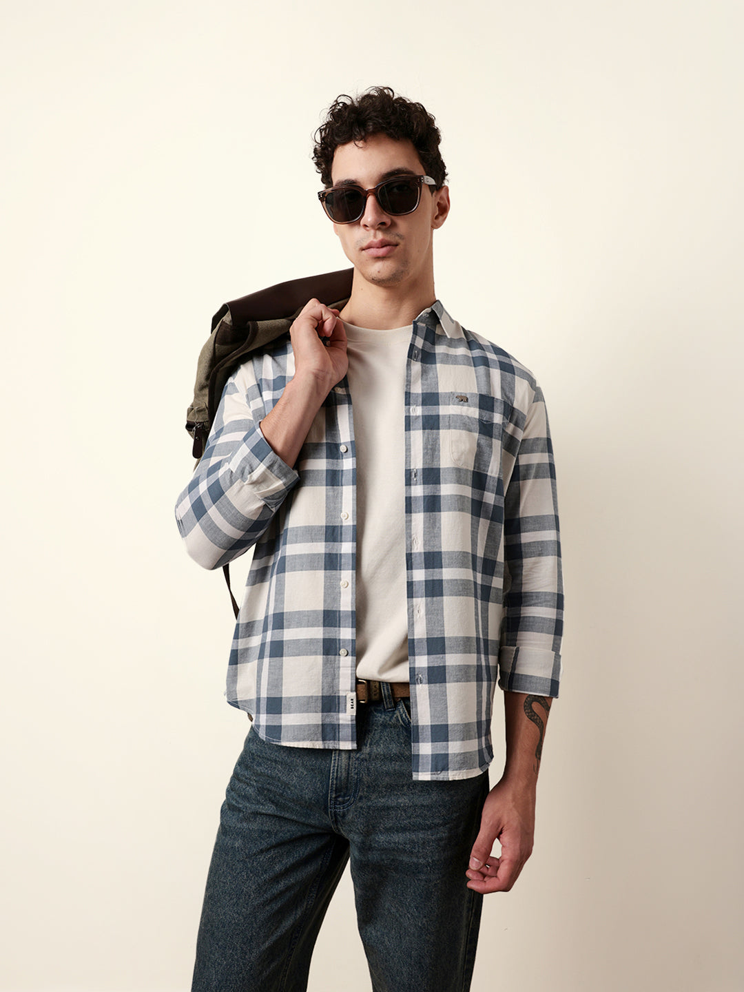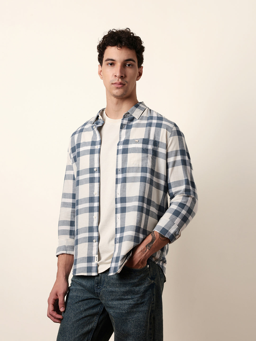 Shop Off white with Blue Woven Tartan Checked Slim Fit Casual Shirt Online.