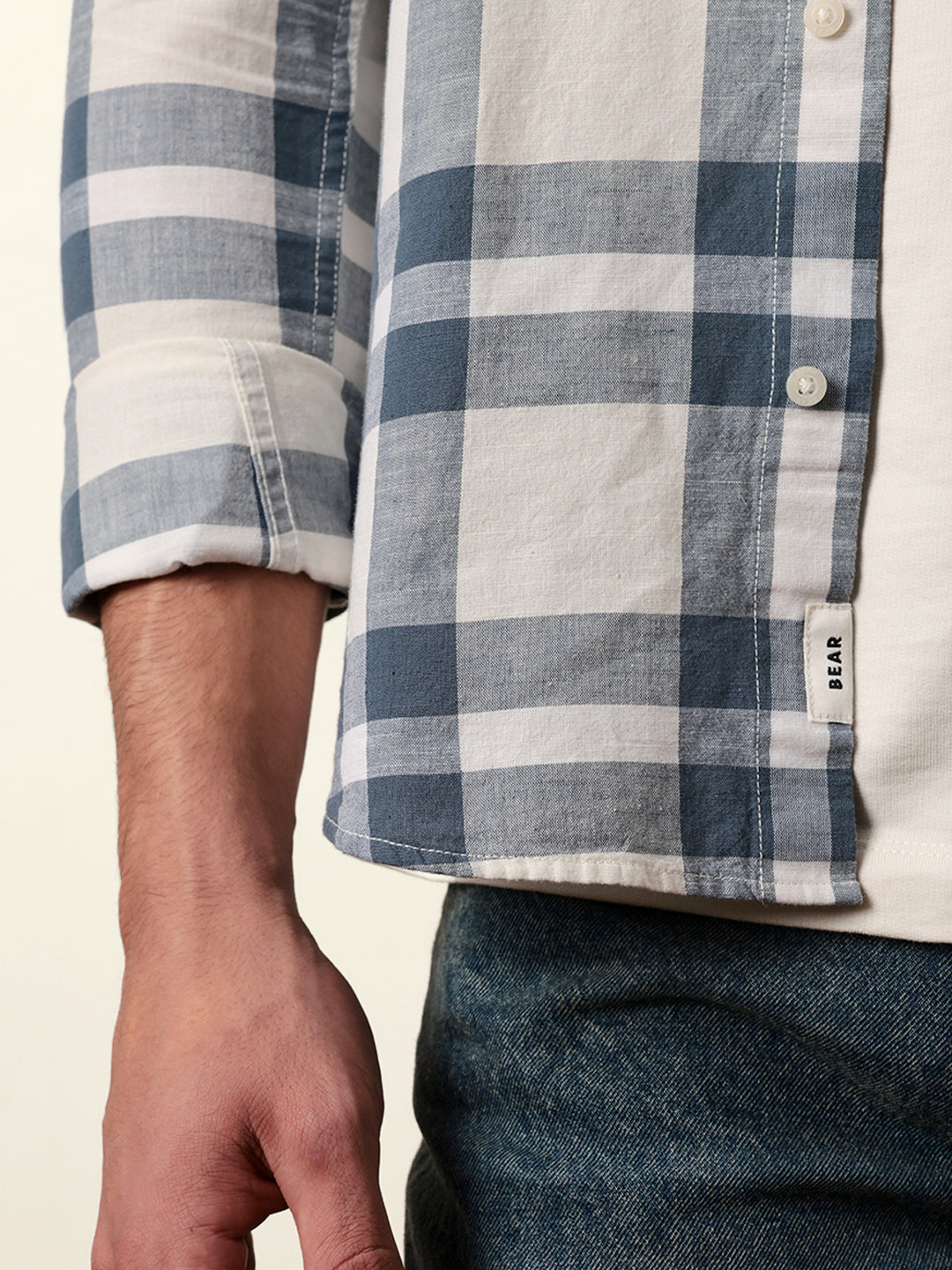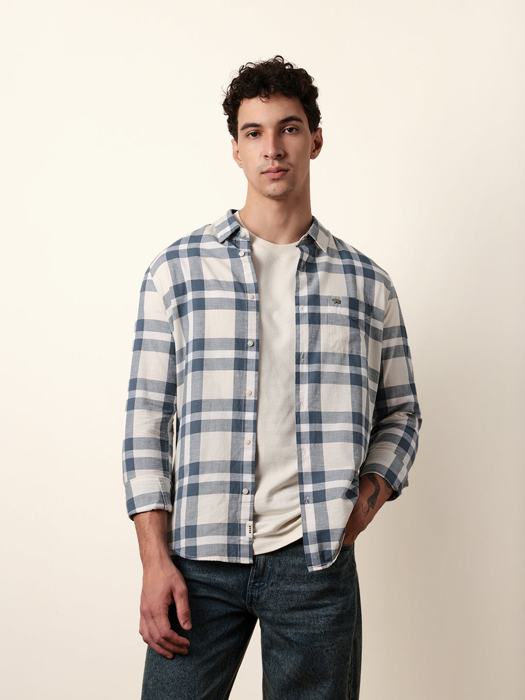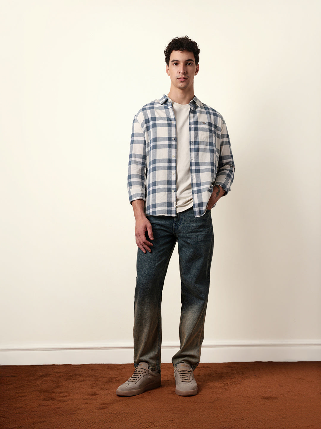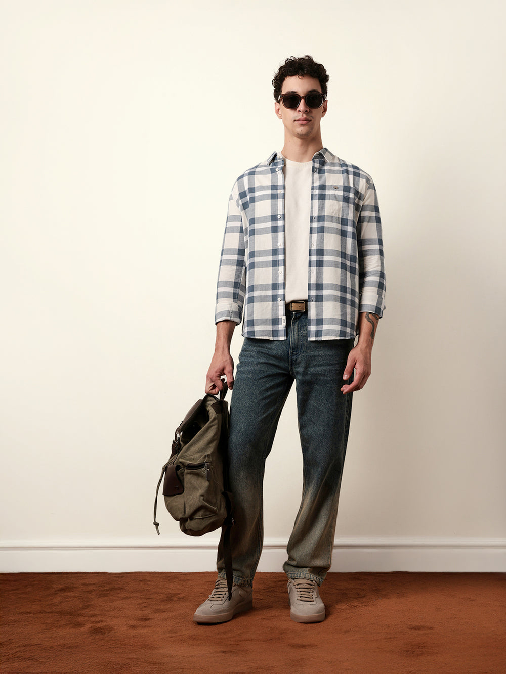 Shop Off white with Blue Woven Tartan Checked Slim Fit Casual Shirt Online.