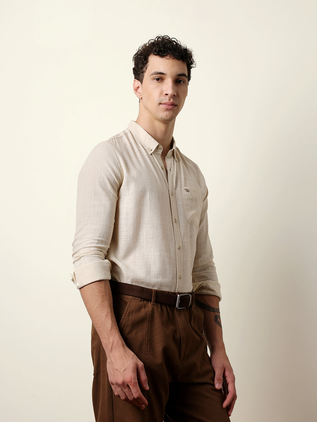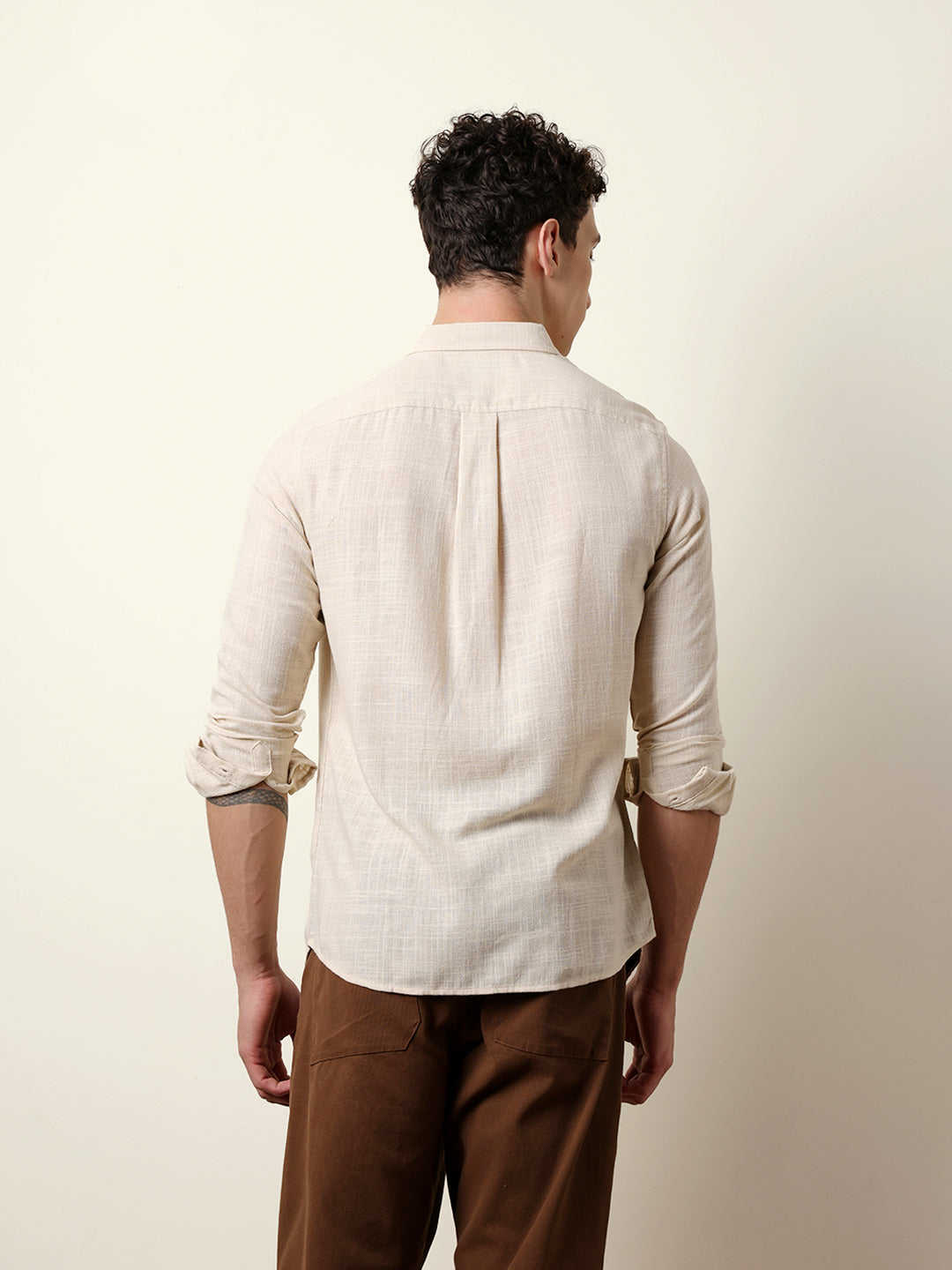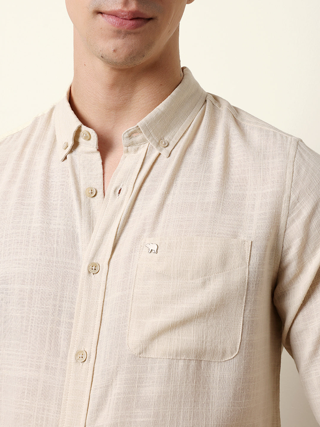 Cream Slub-Textured Woven Slim Fit Casual Shirt