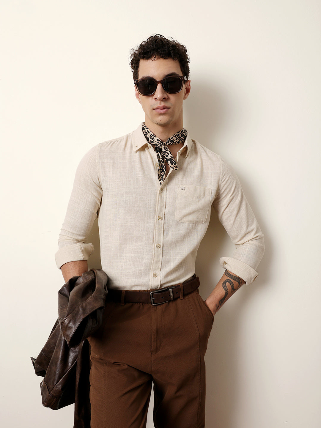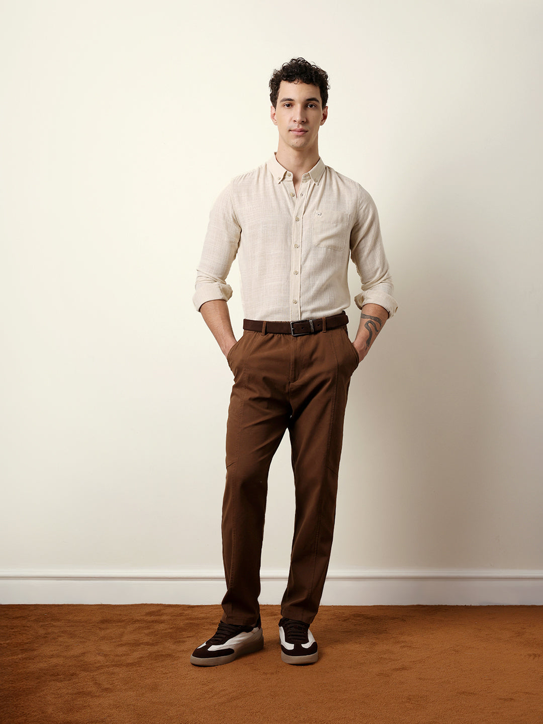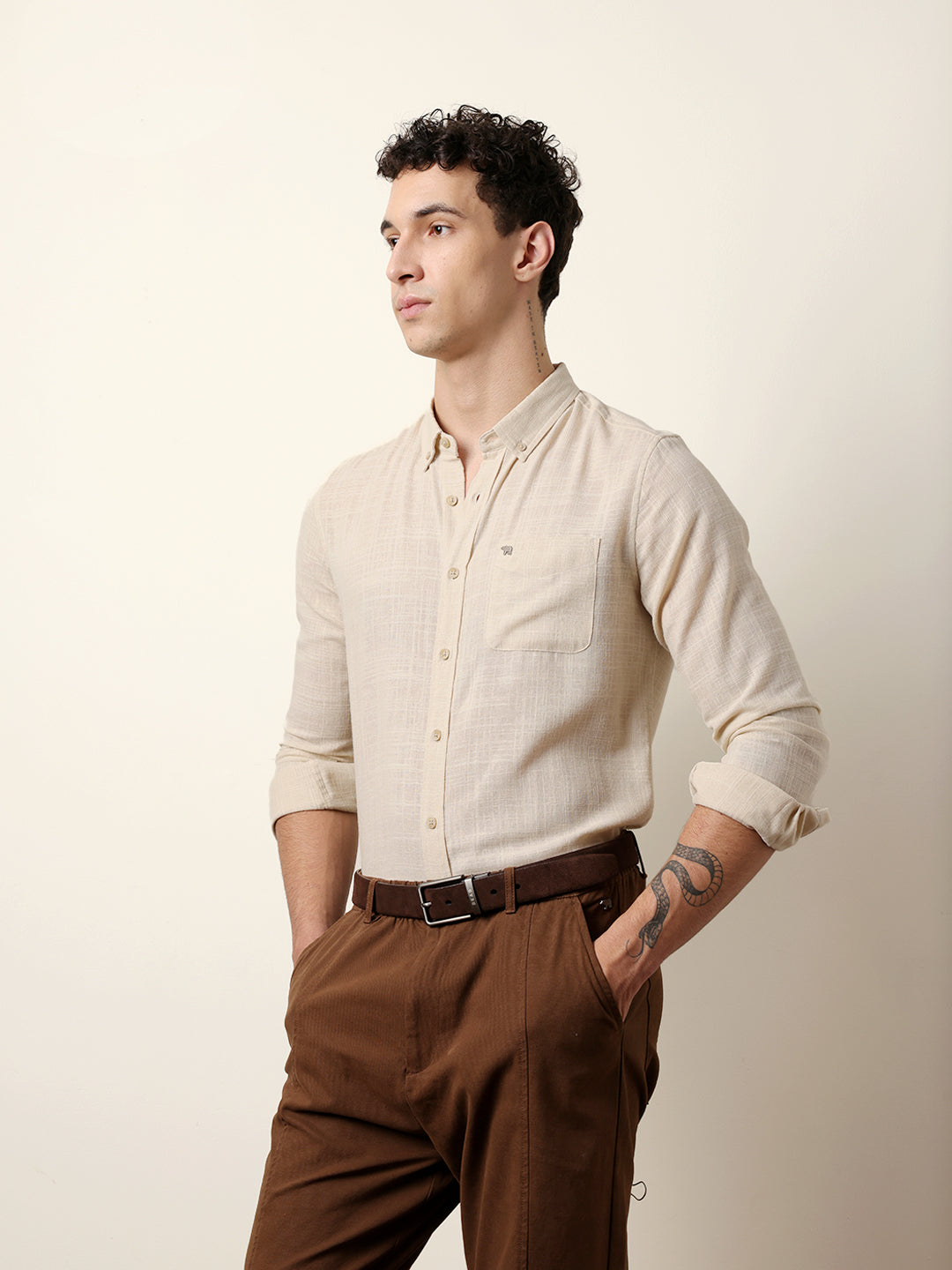 Cream Slub-Textured Woven Slim Fit Casual Shirt