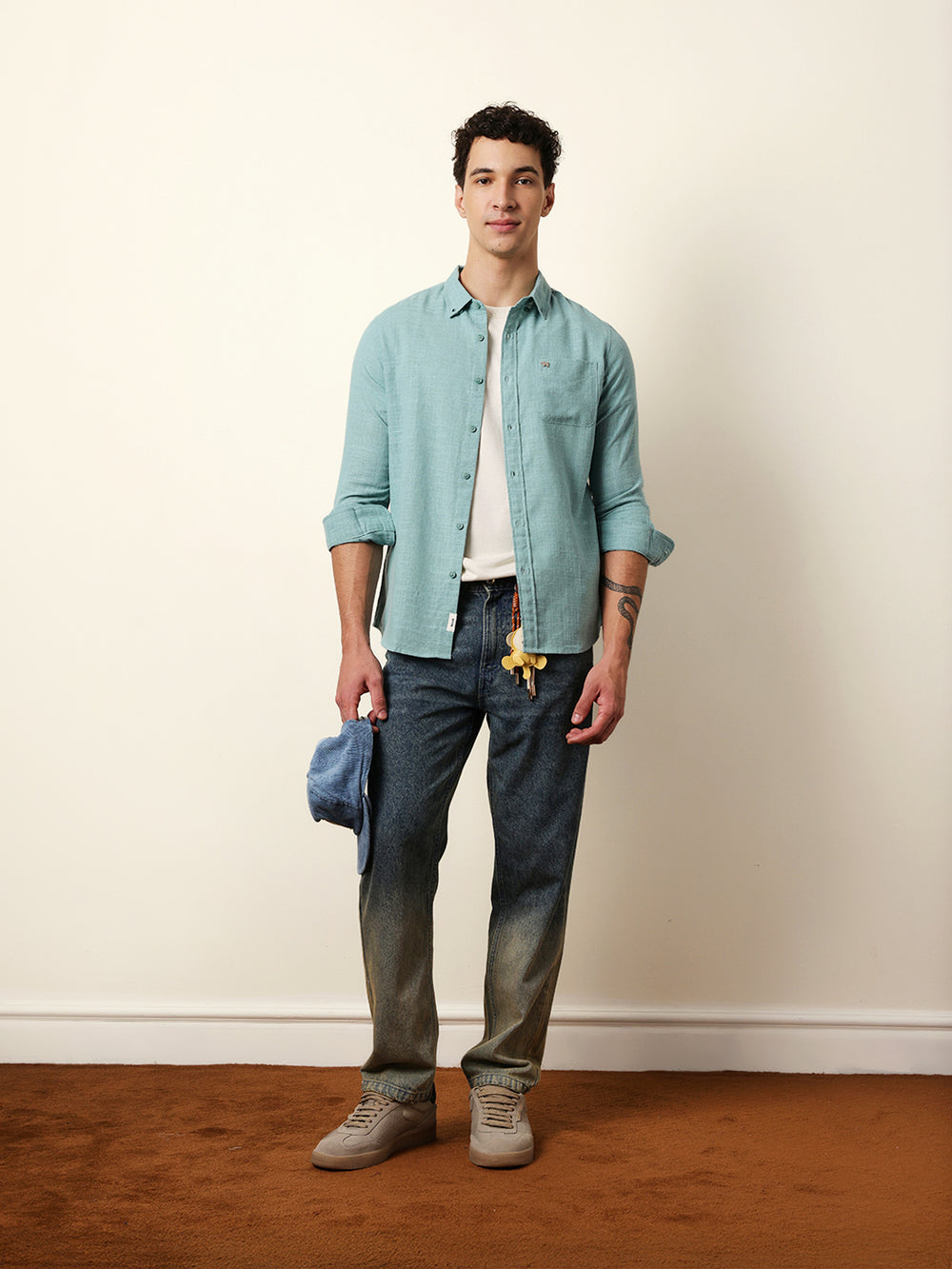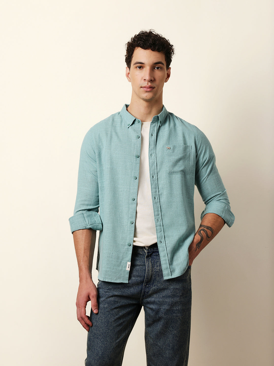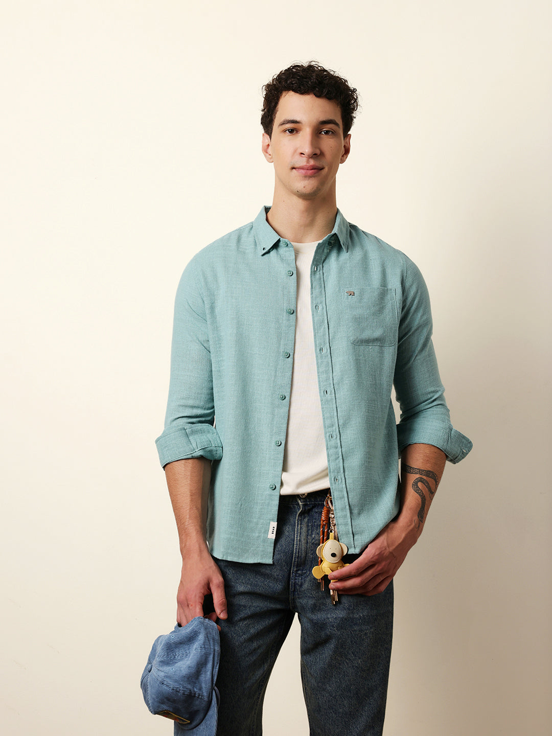 Shop Teal Slub-Textured Woven Slim Fit Casual Shirt Online.