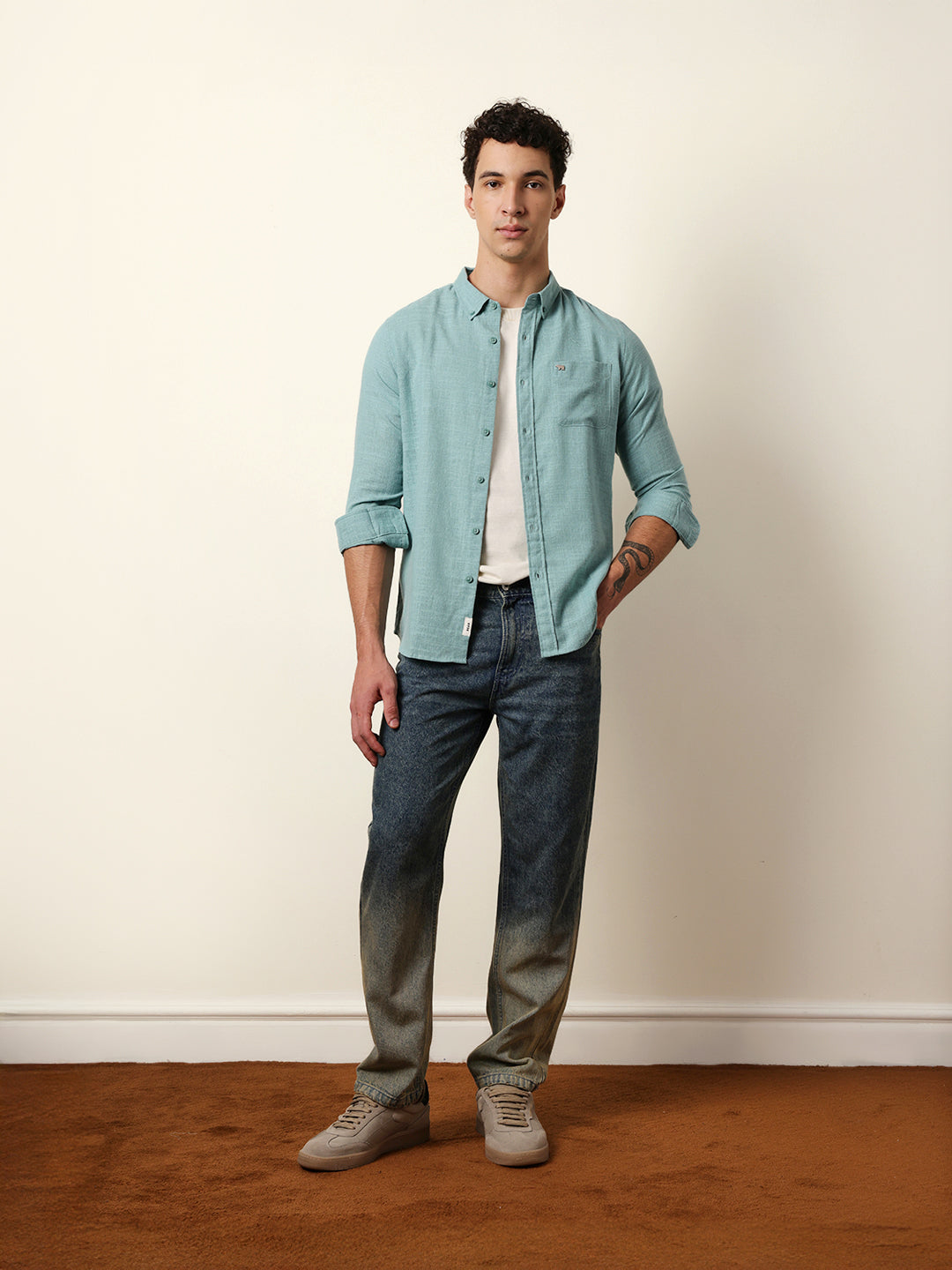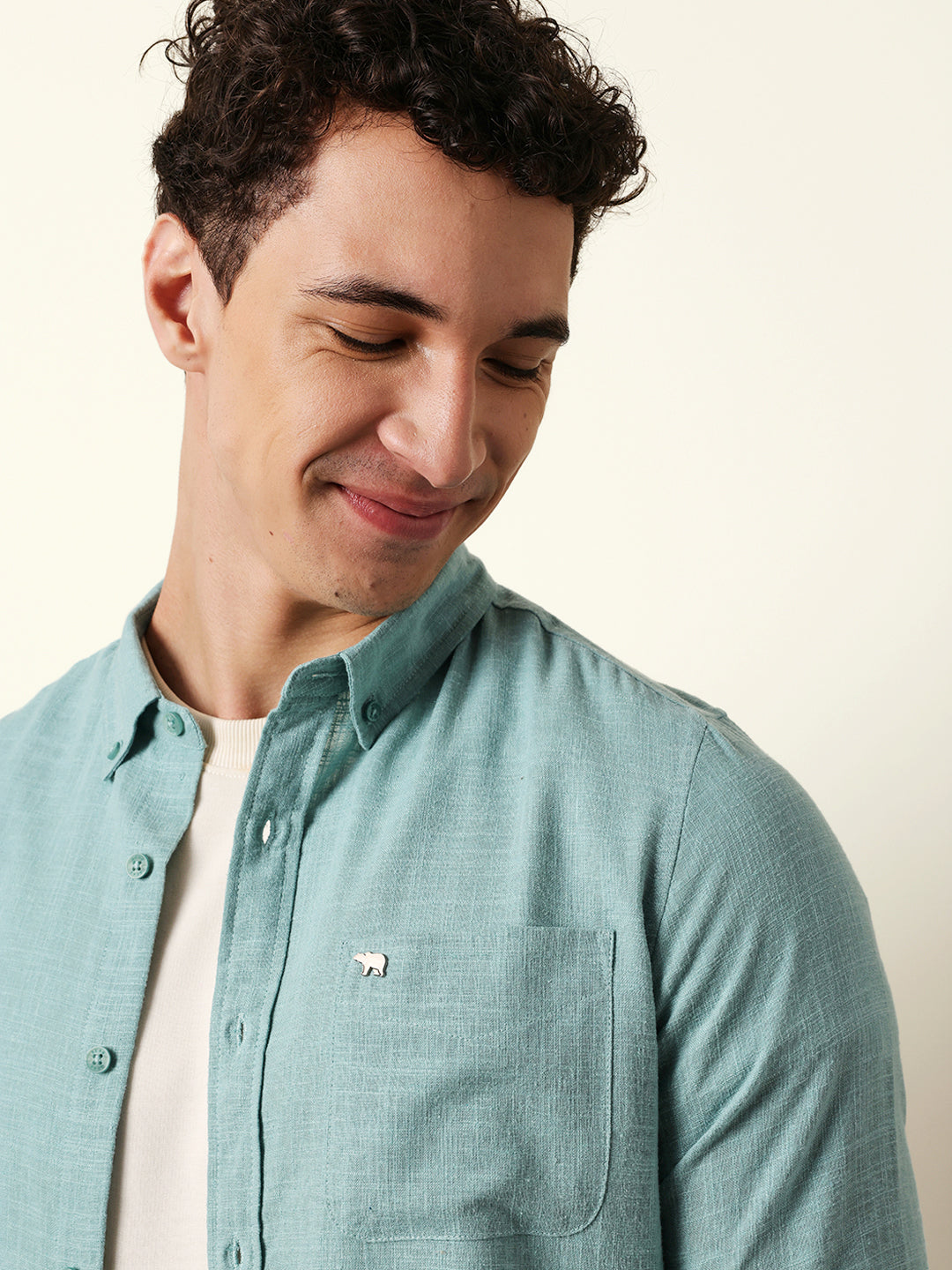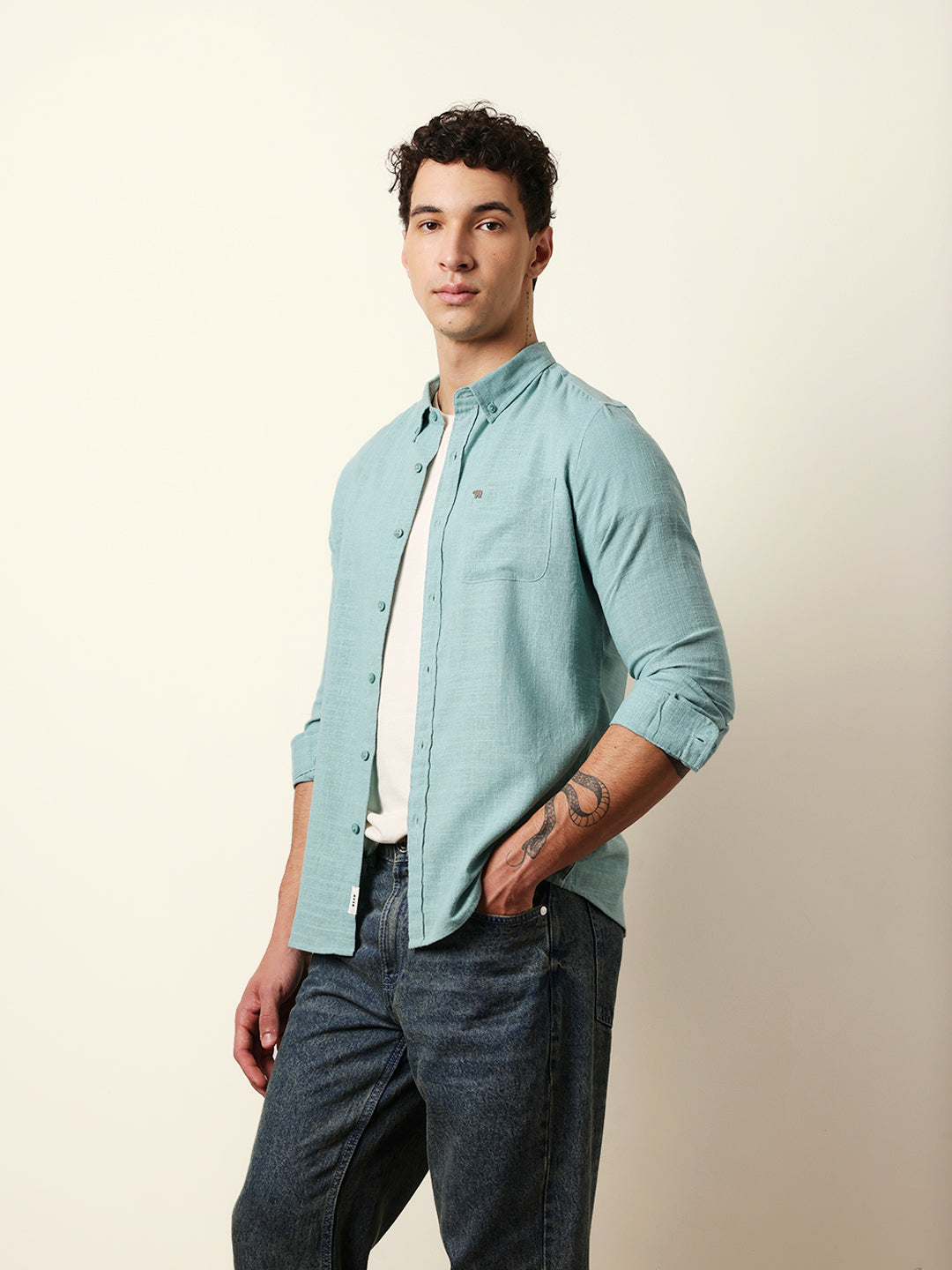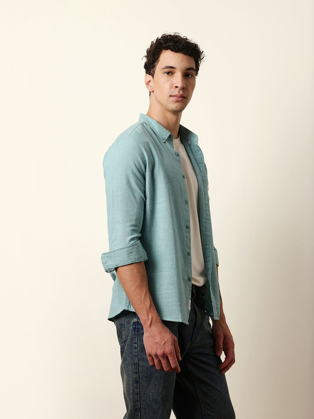 Teal Slub-Textured Woven Slim Fit Casual Shirt