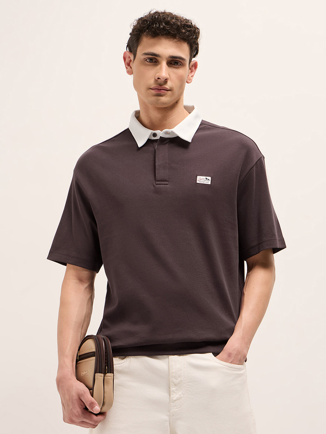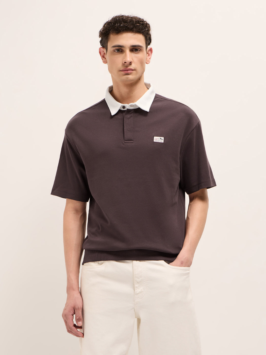 Shop Brown Solid Relax Fit Polo with Contrast Collar and Hidden Button Placket Online.