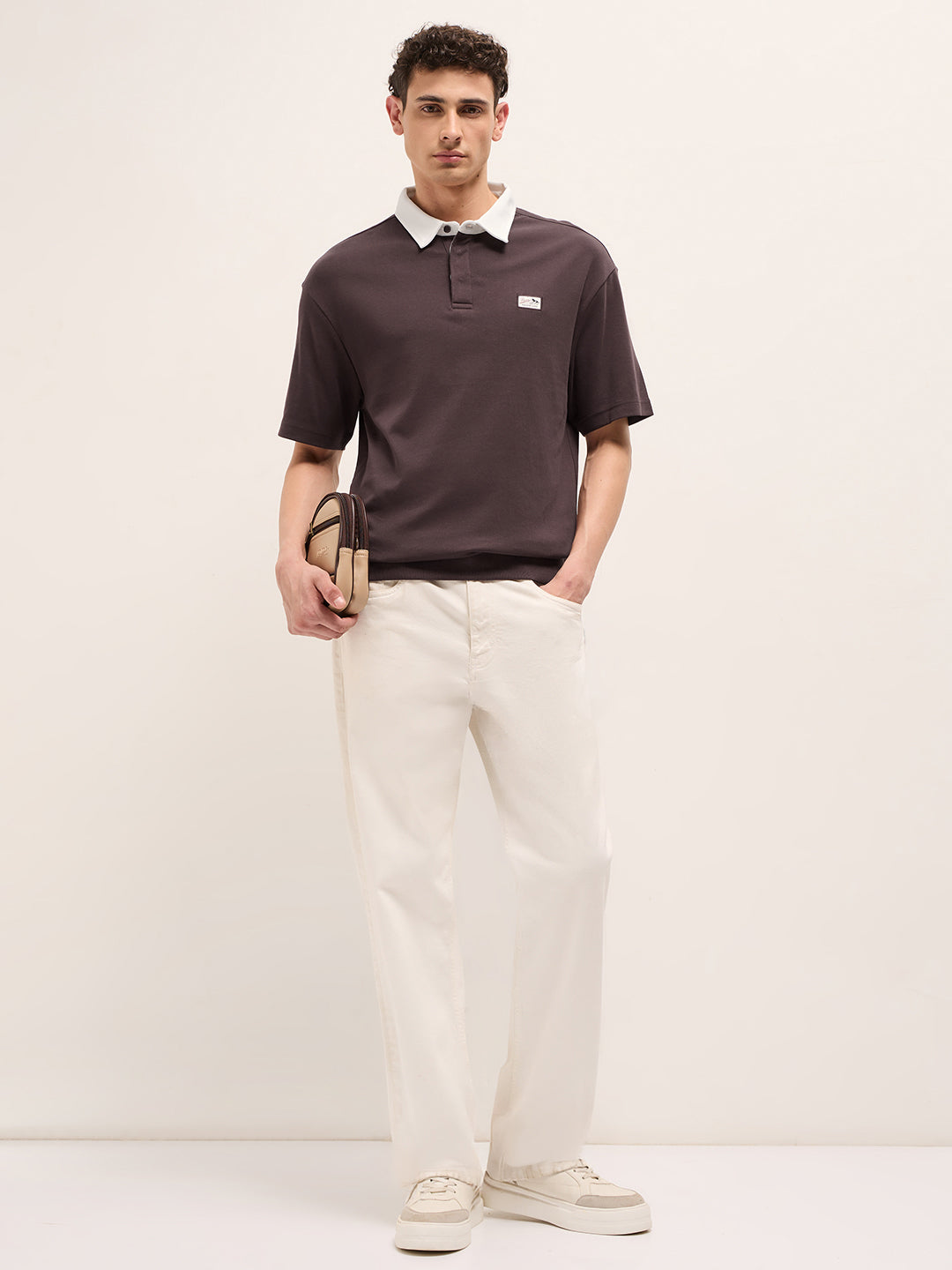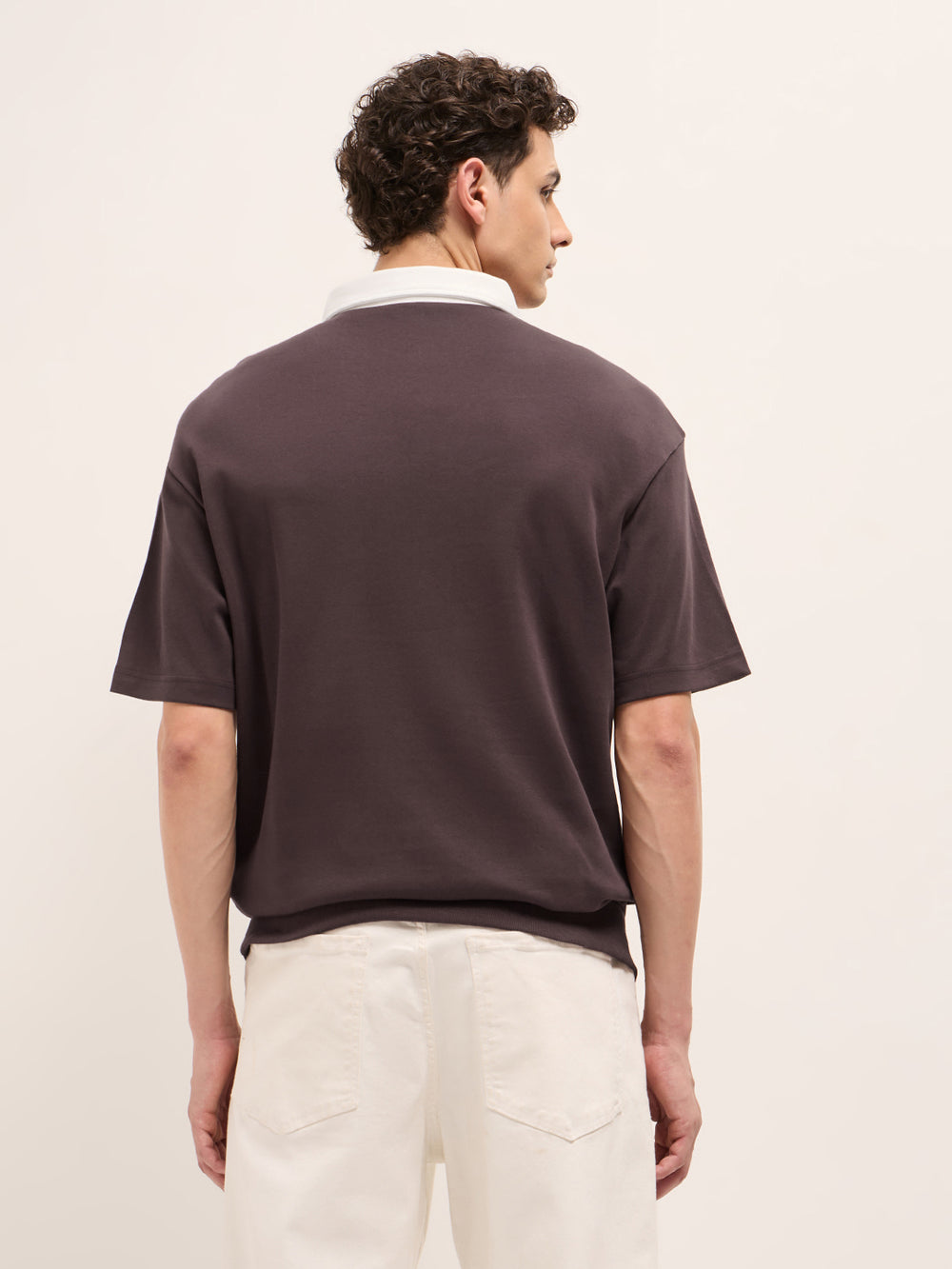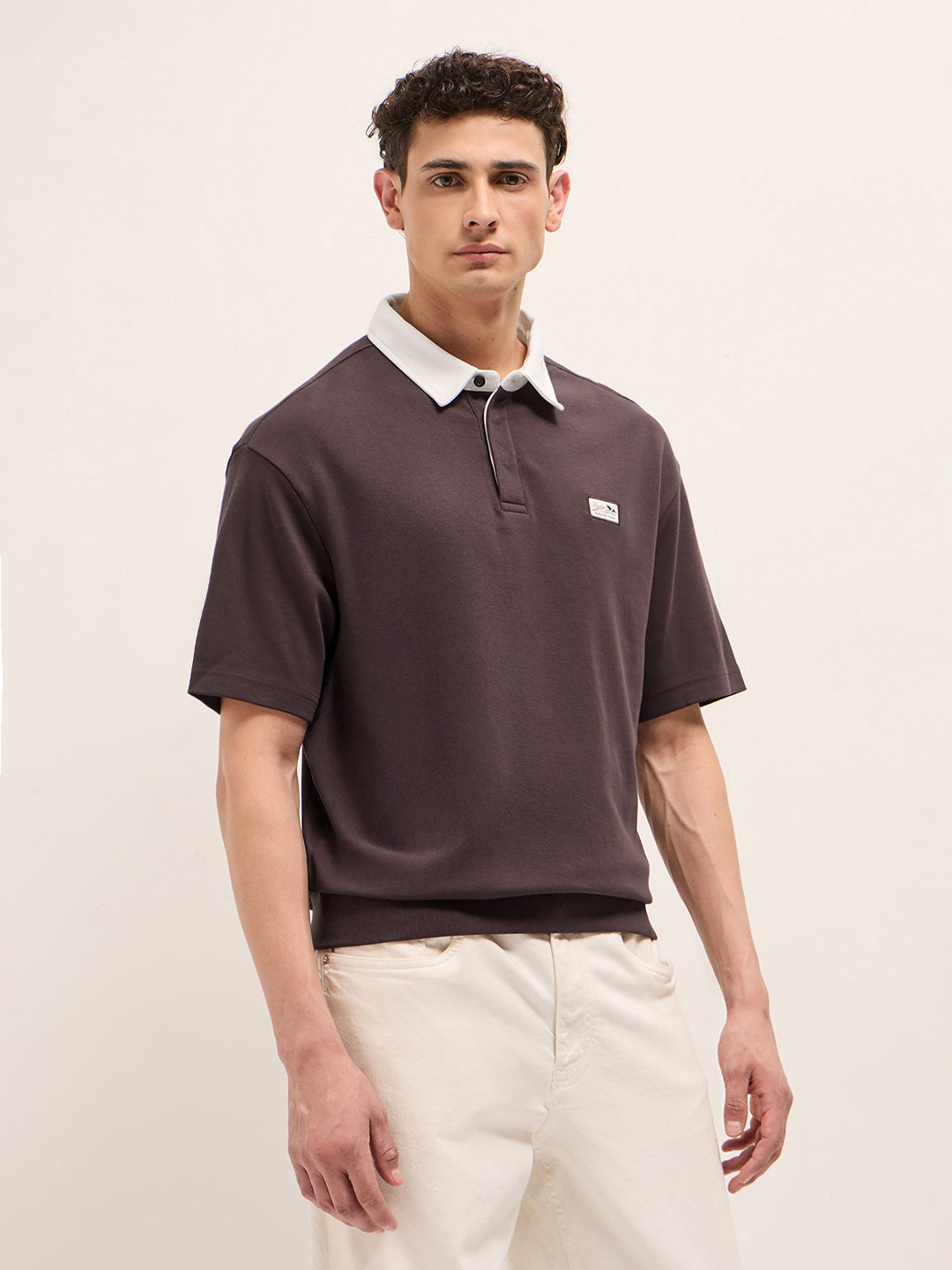 Brown Solid Relax Fit Polo with Contrast Collar and Hidden Button Placket