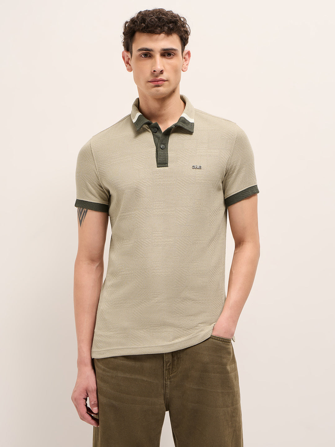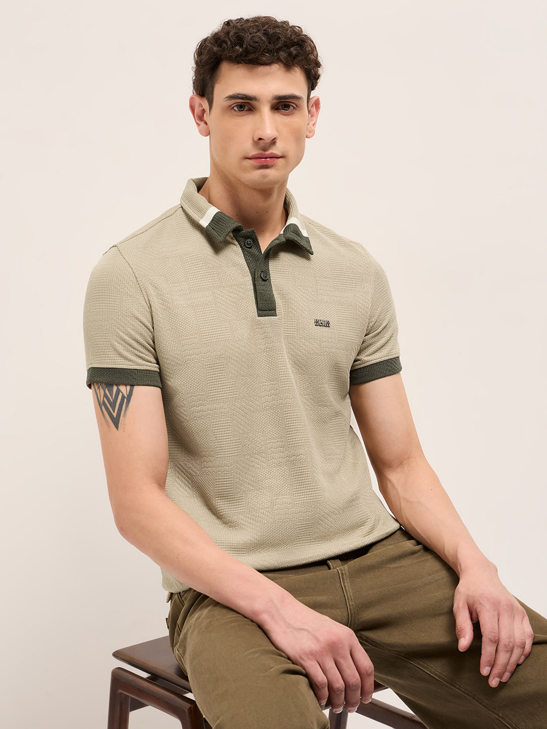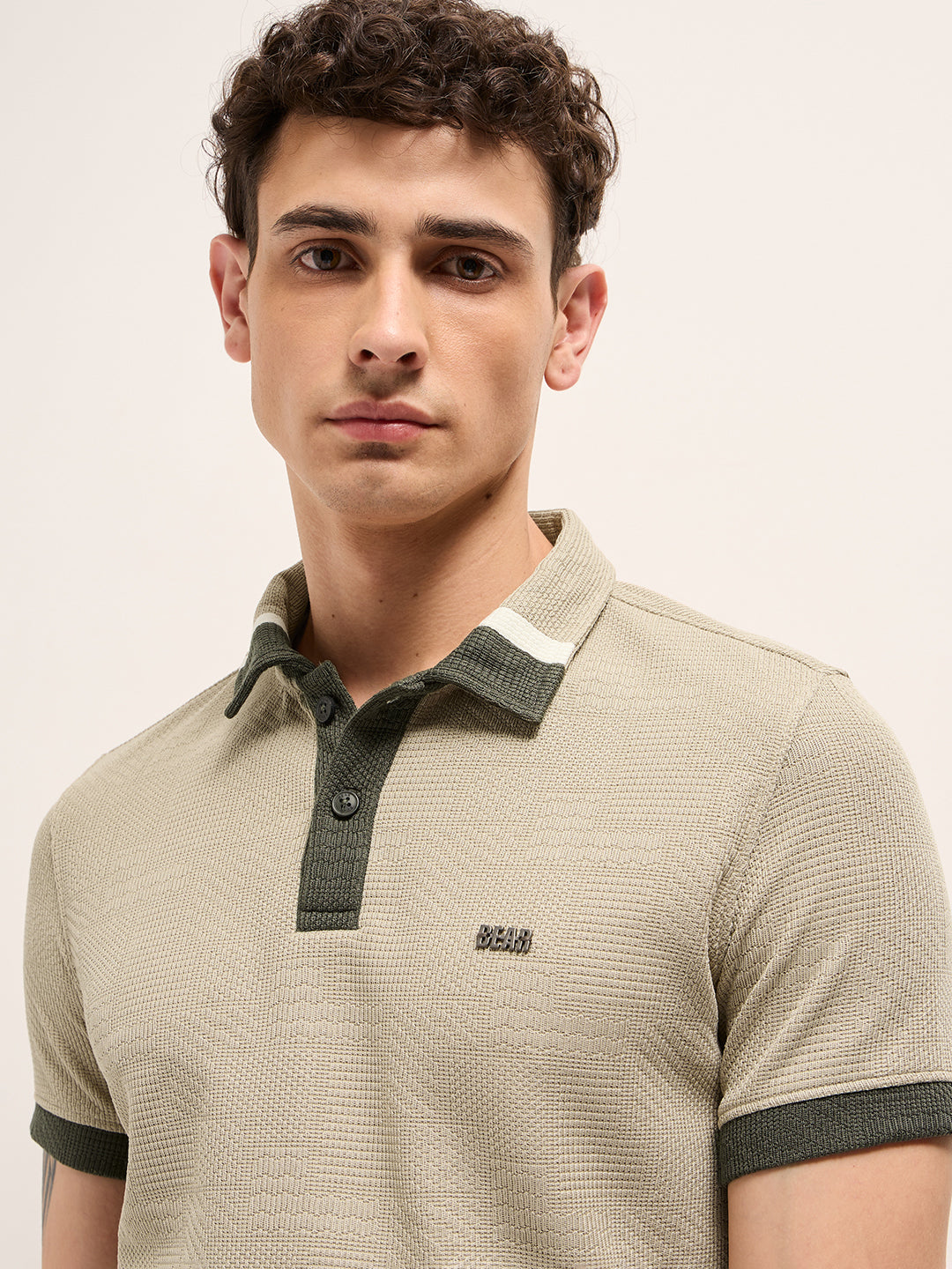 Beige Geometric Textured Knit Slim Fit Polo with Contrast Collar and Cuff Detailing