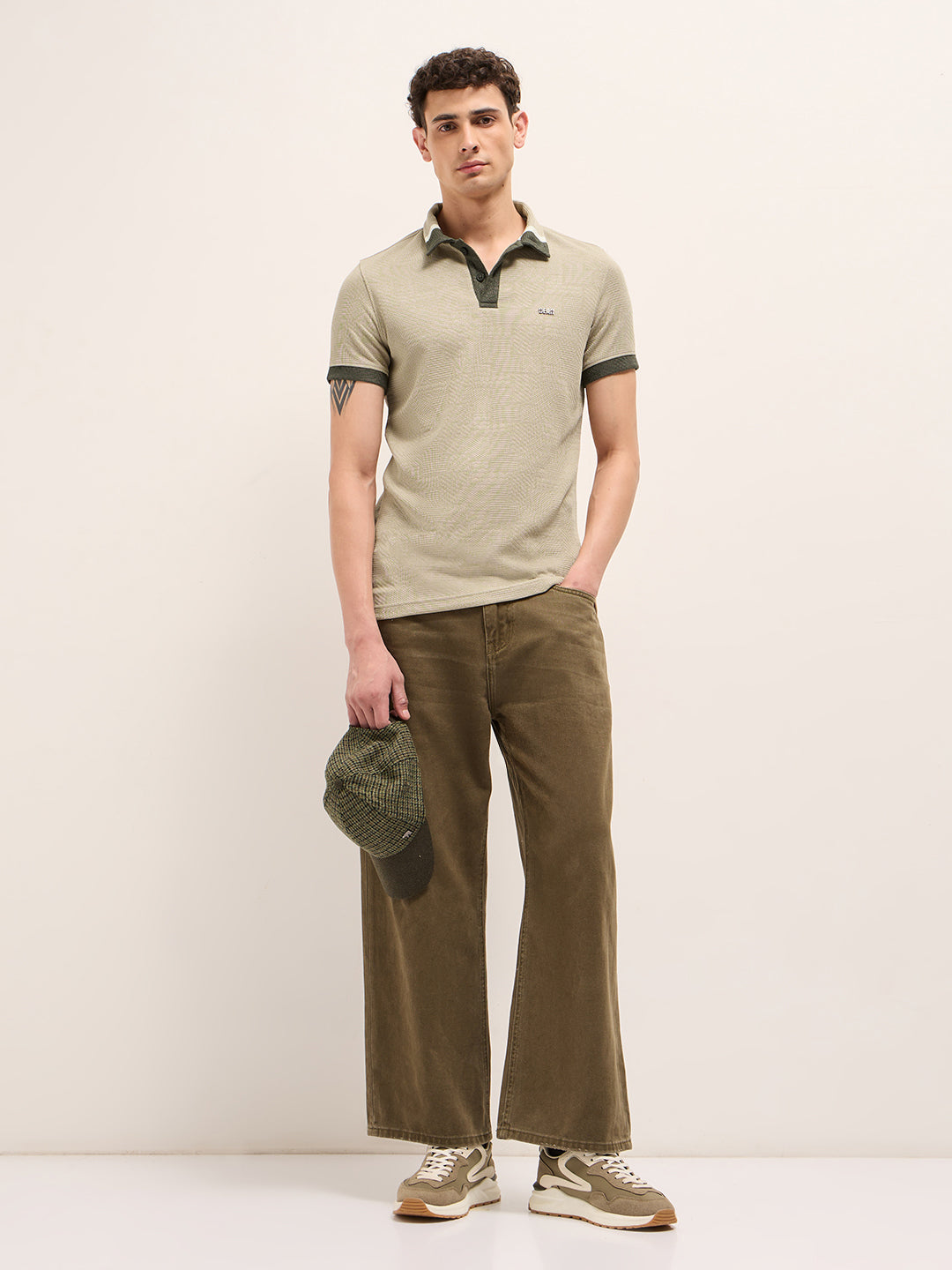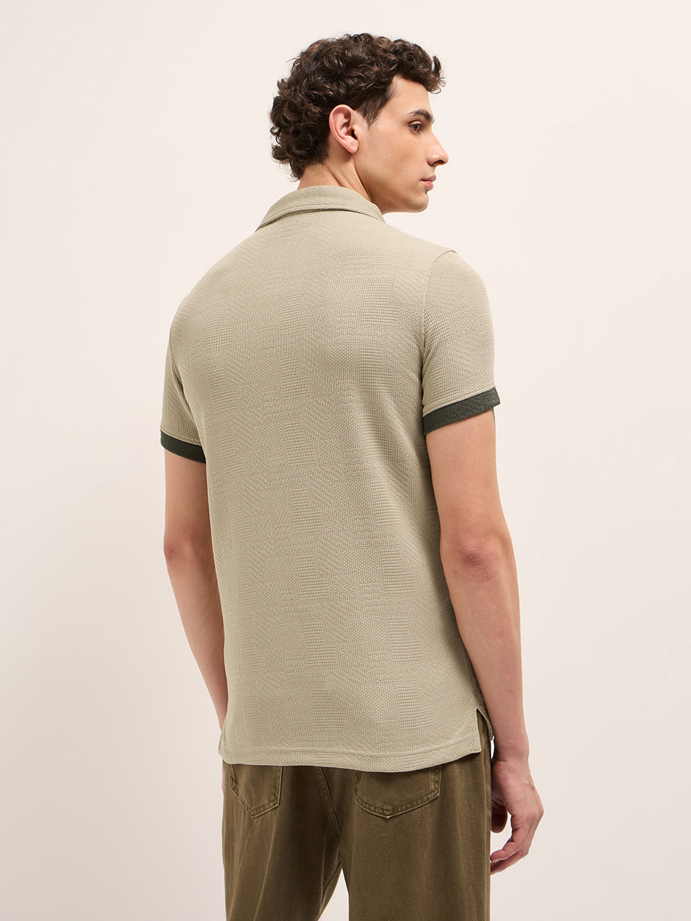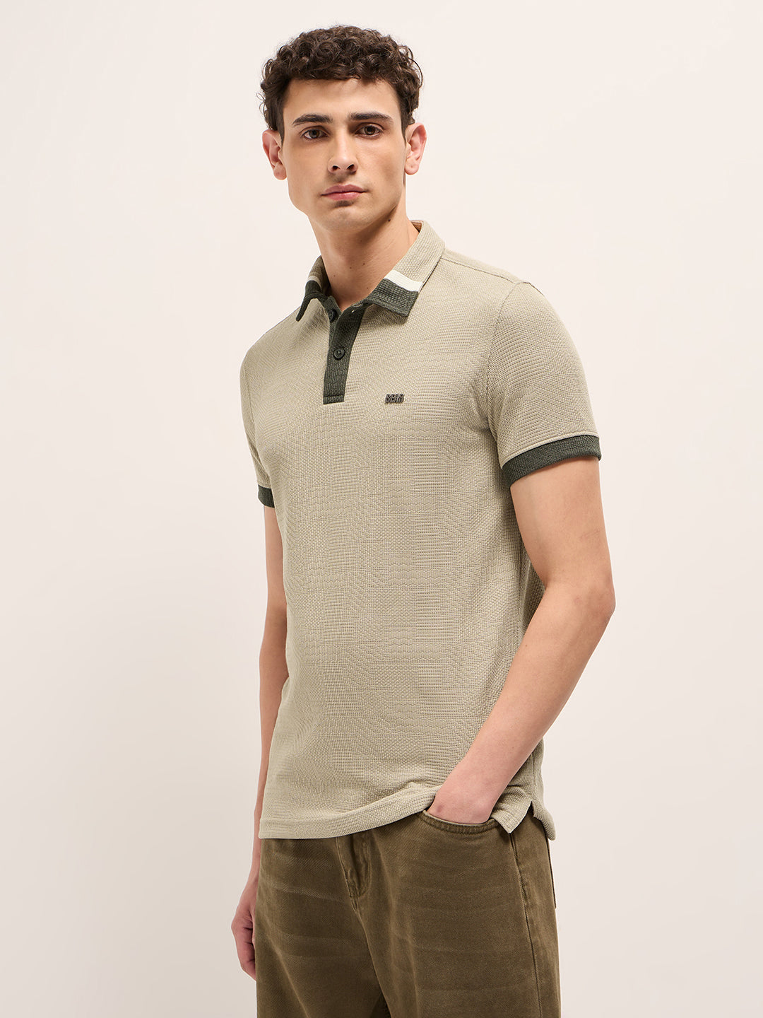 Beige Geometric Textured Knit Slim Fit Polo with Contrast Collar and Cuff Detailing