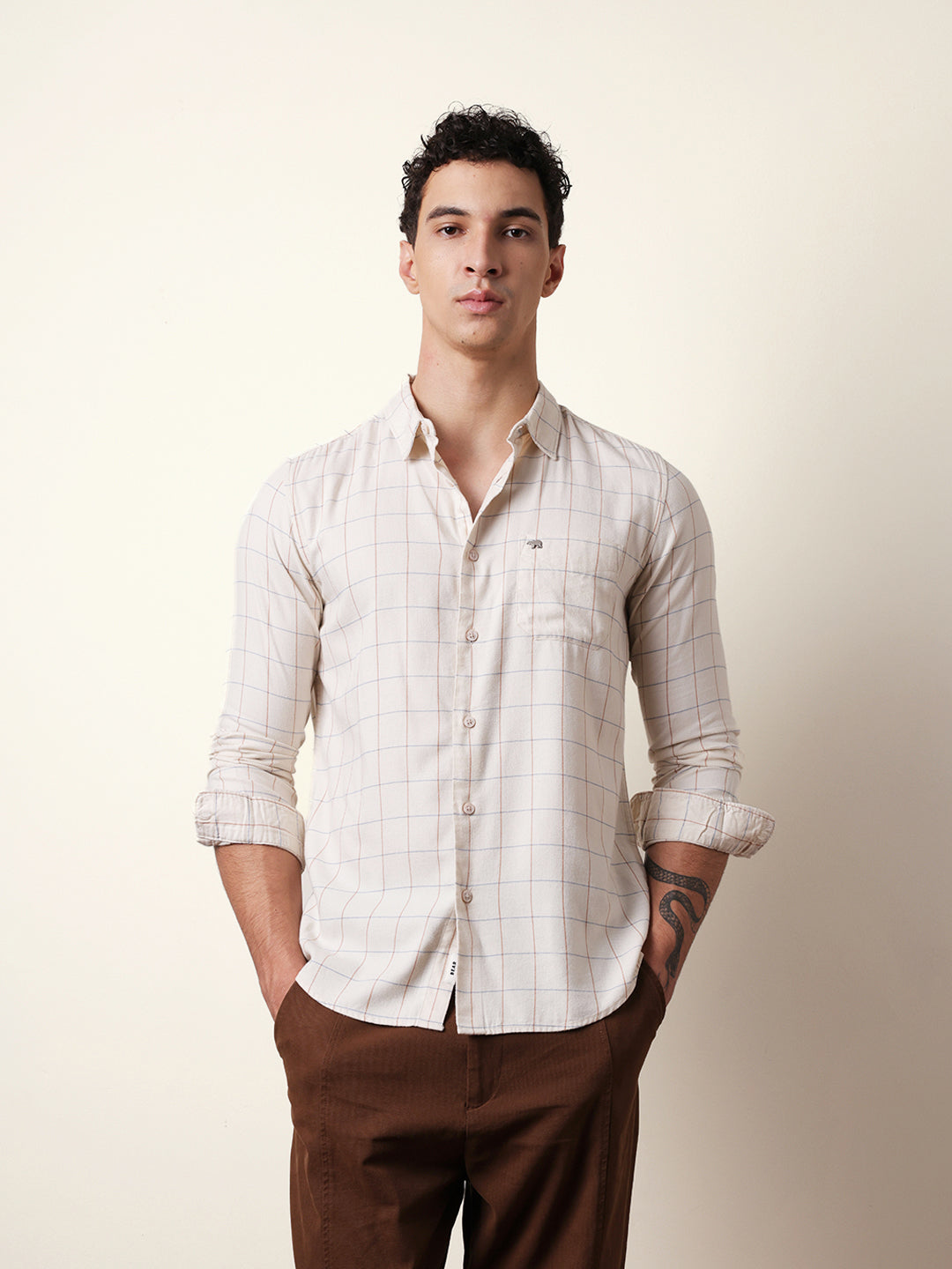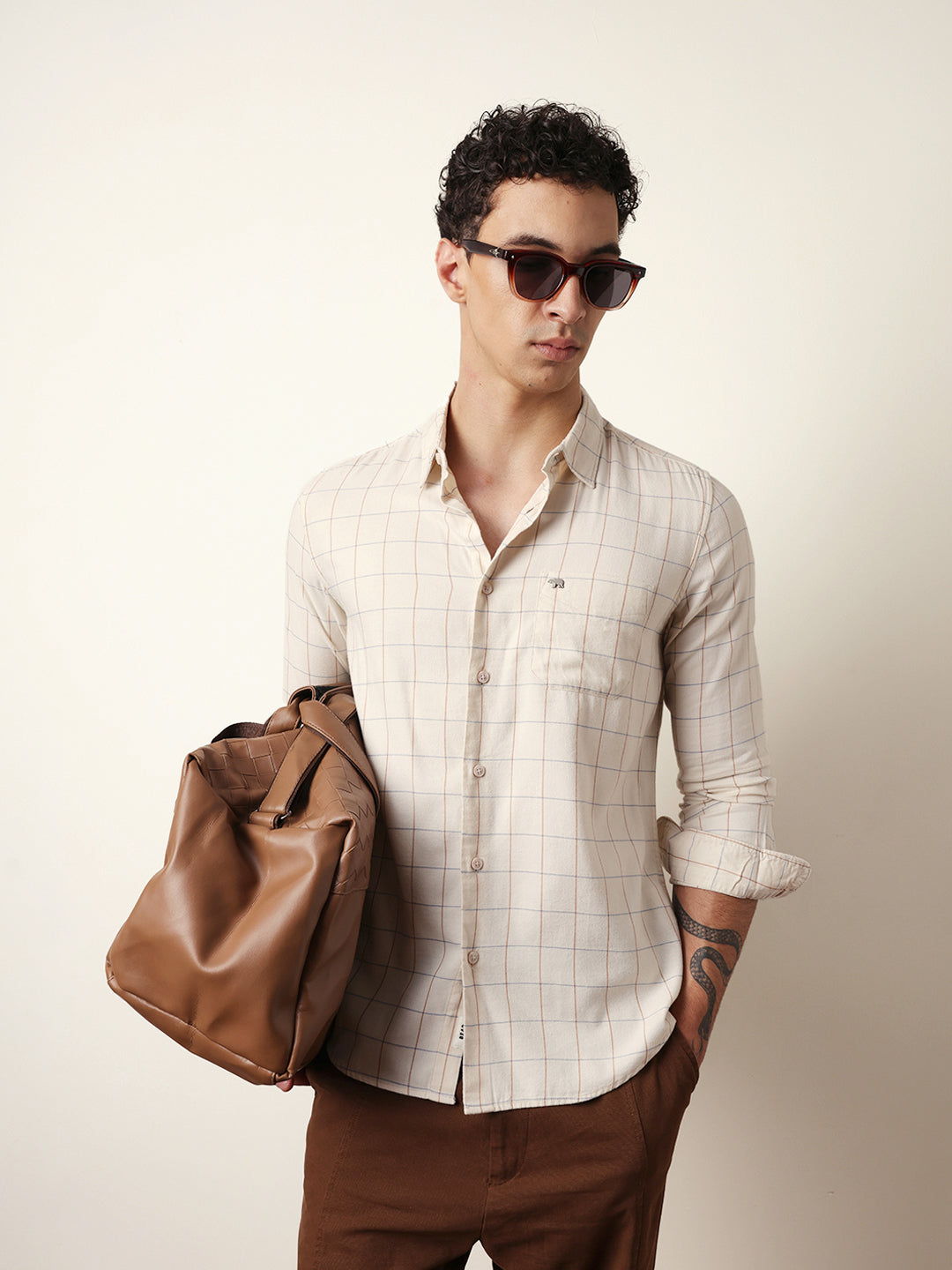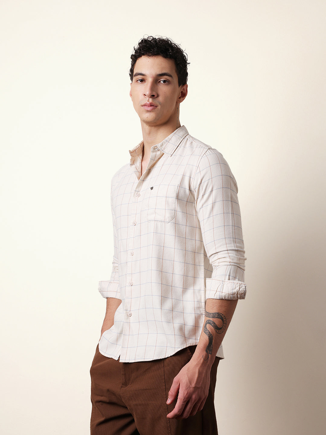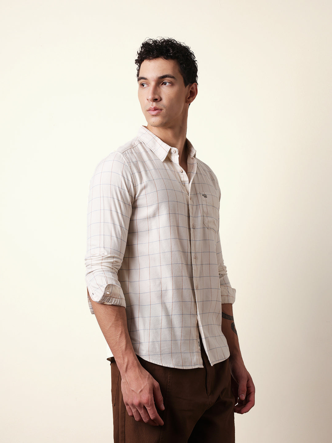 Cream Slim Fit Casual Shirt with Woven Block Checks