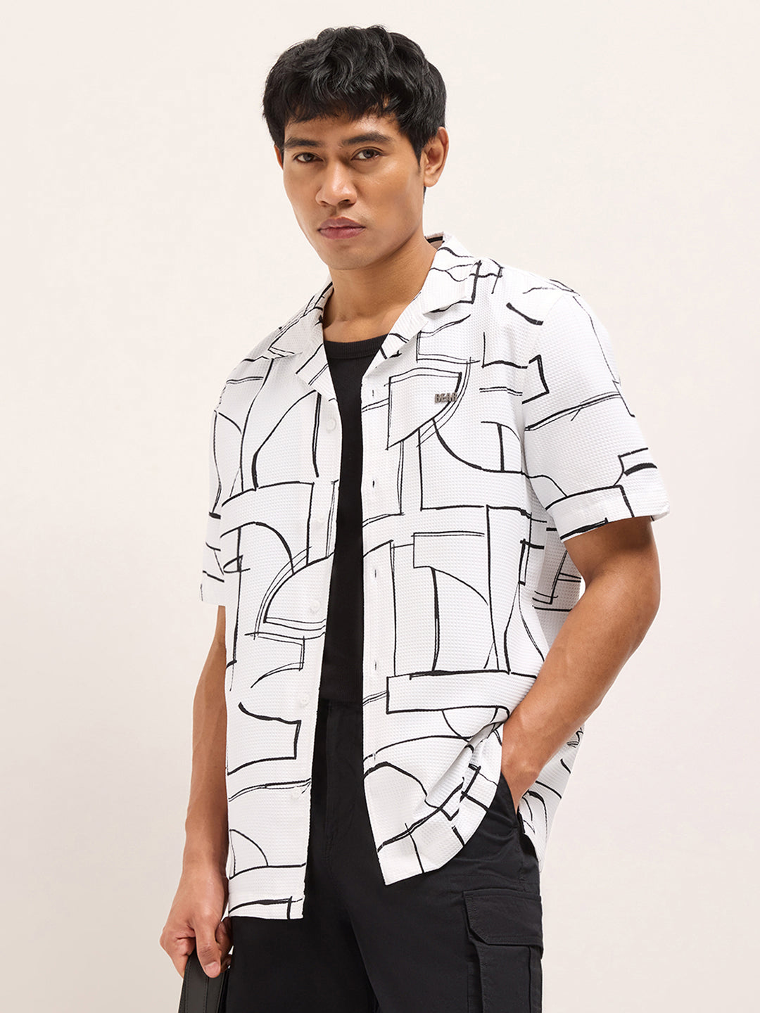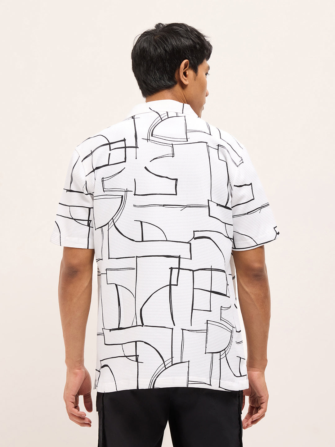 White Geometrical Print Textured Weave Relaxed Fit Casual Shirt