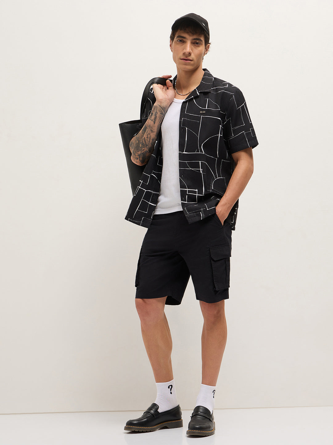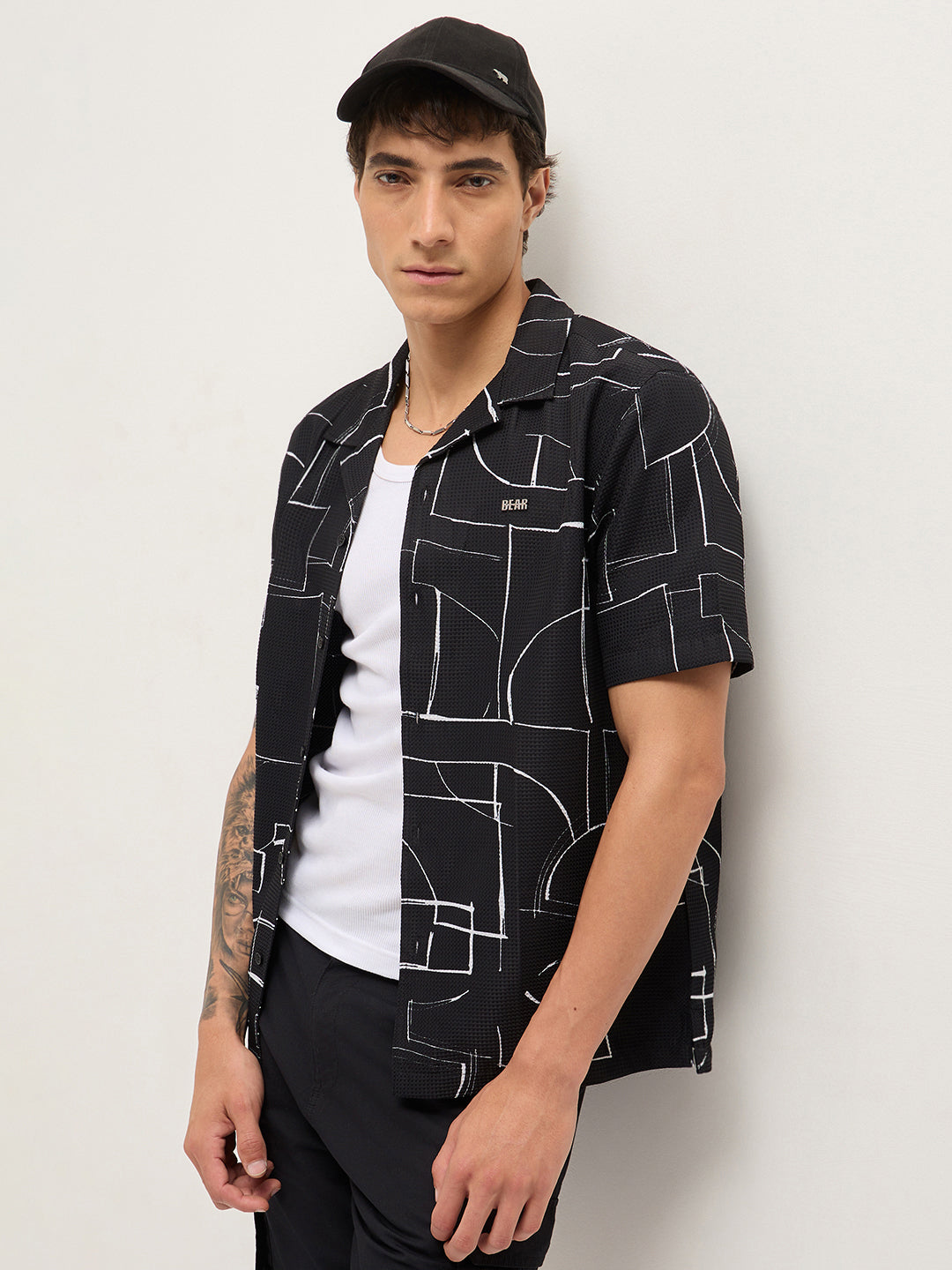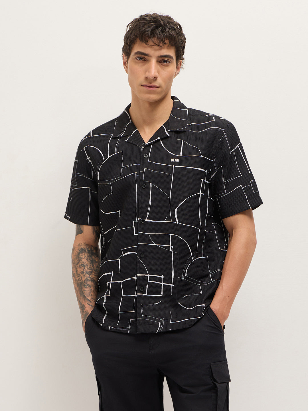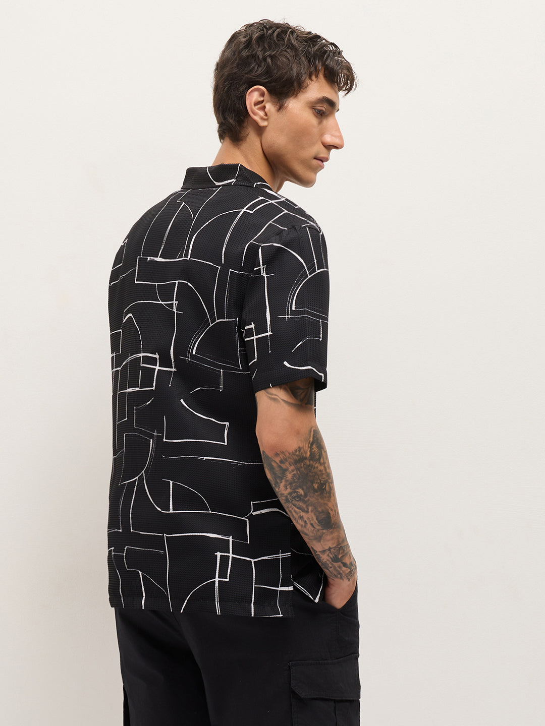 Shop Black Abstract Geometric Print Relaxed Fit Cuban Collar Casual Shirt Online.