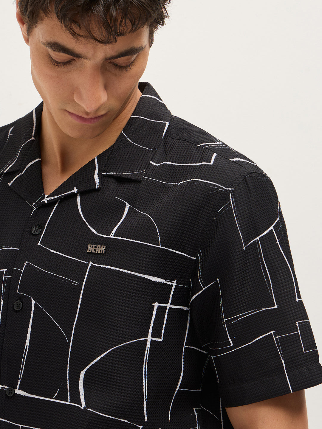 Black Abstract Geometric Print Relaxed Fit Cuban Collar Casual Shirt