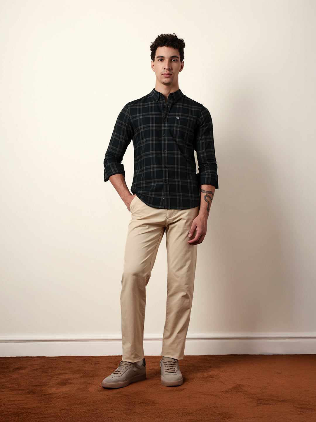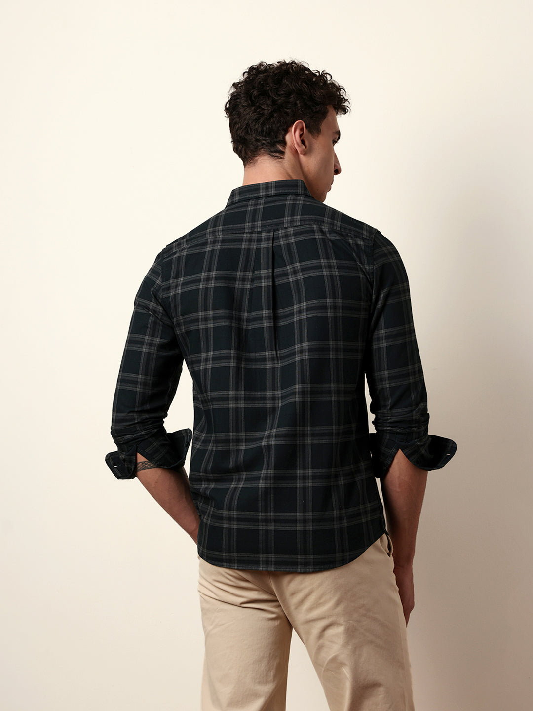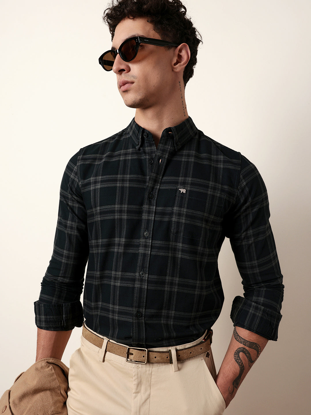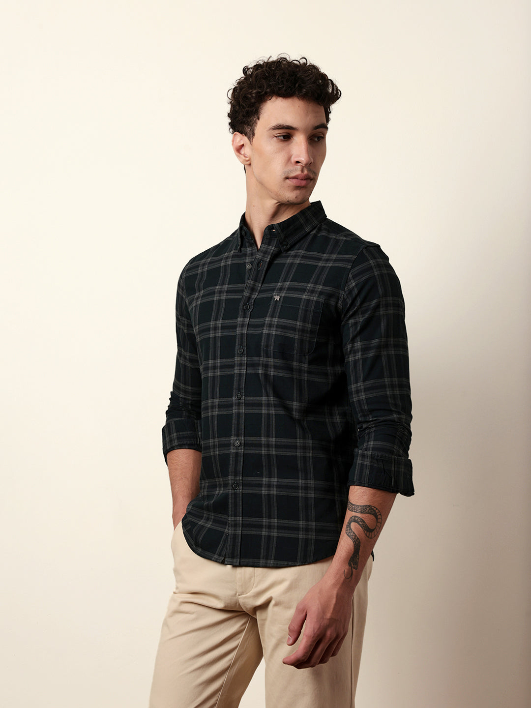 Shop Dark Green Woven Tartan Checked Slim Fit Casual Shirt Online.