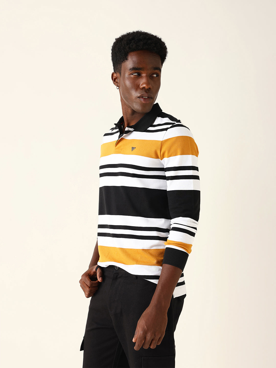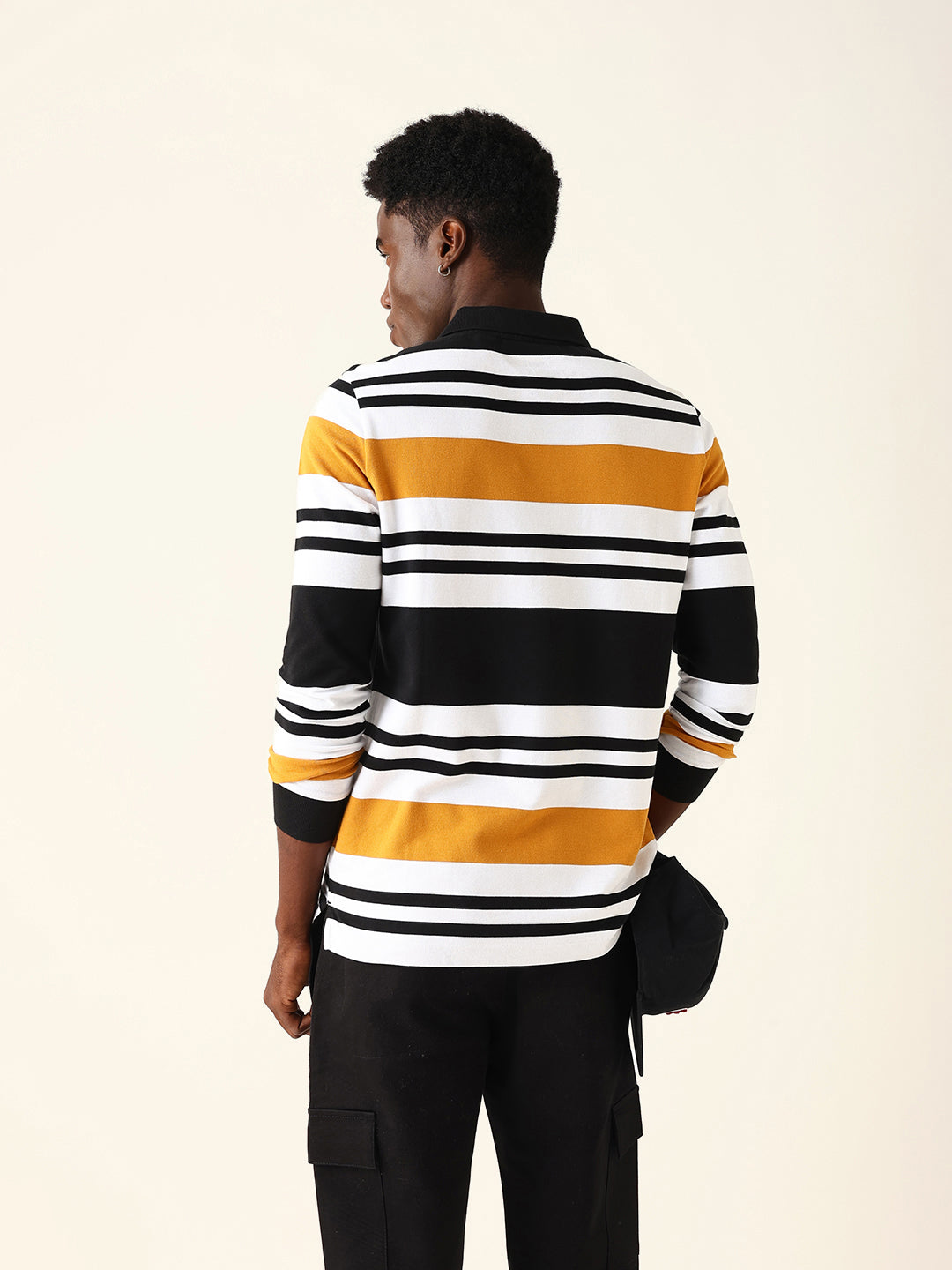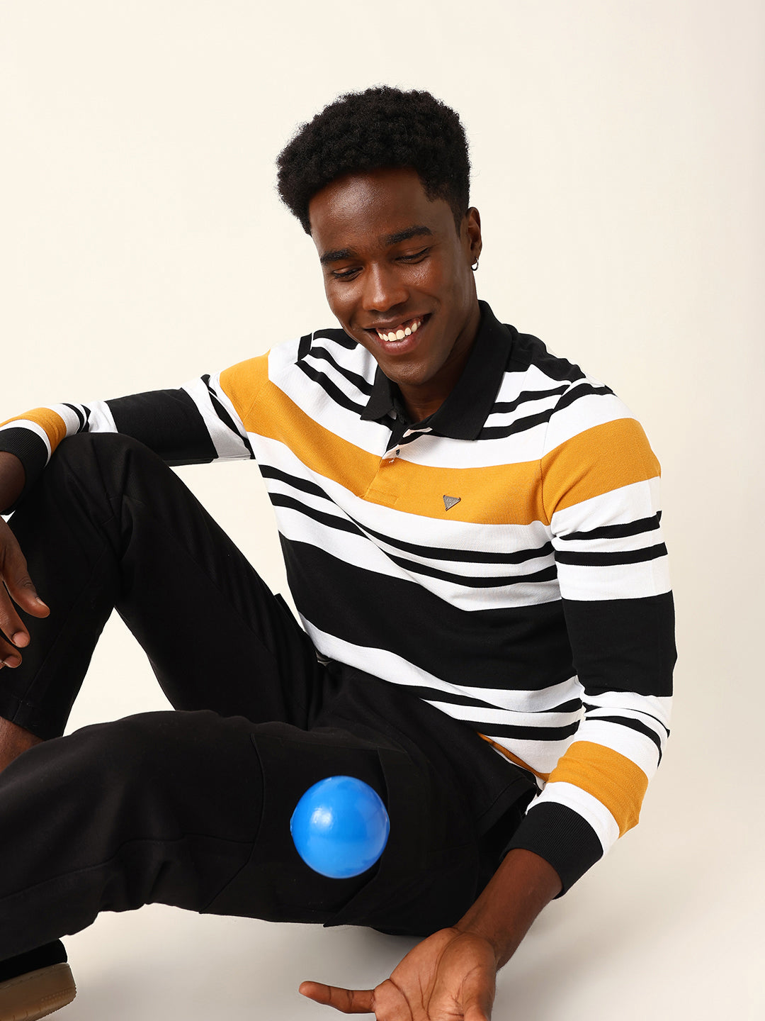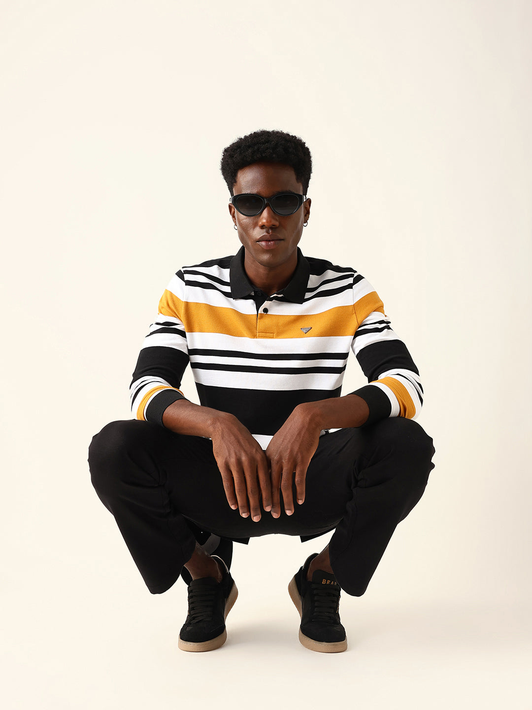 Shop Multicolor Regular Fit Striped Long Sleeve Polo with Metallic Branding Online.