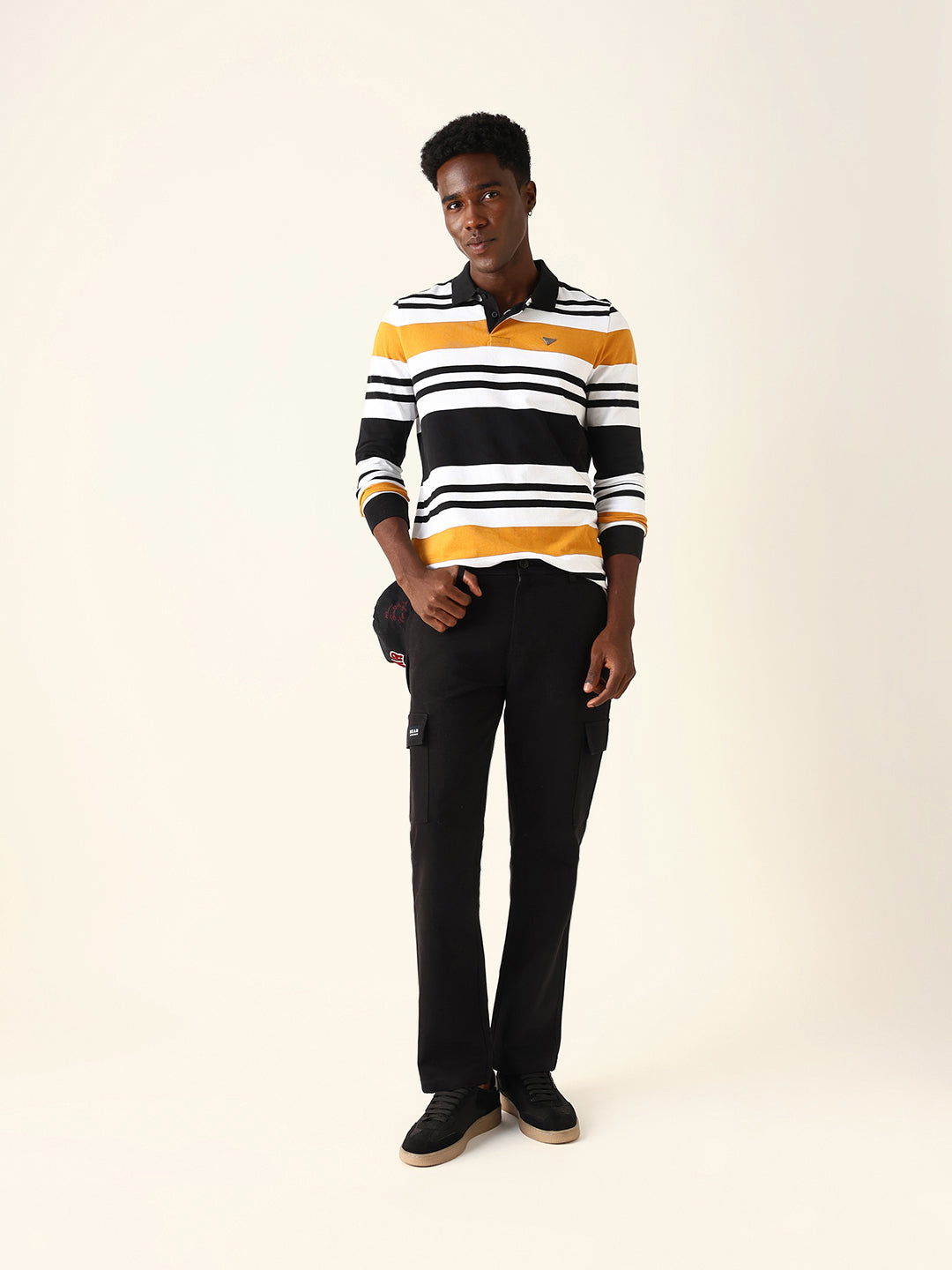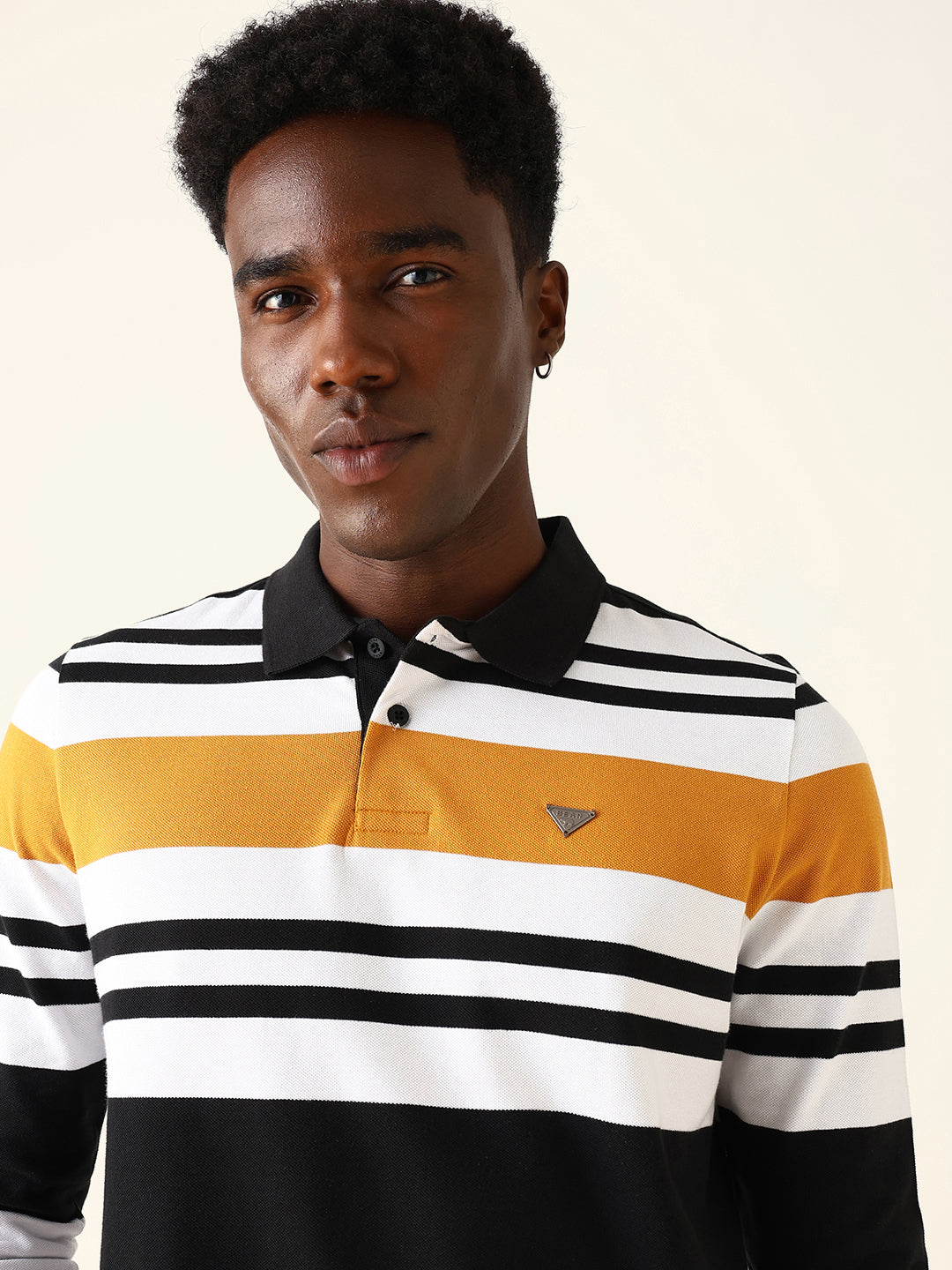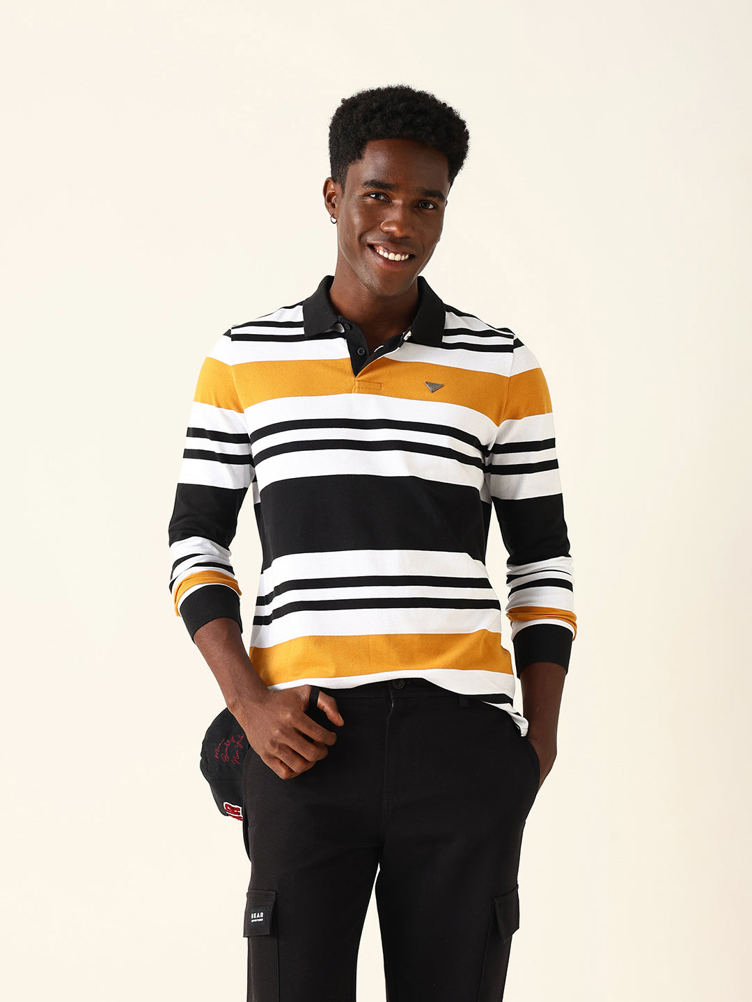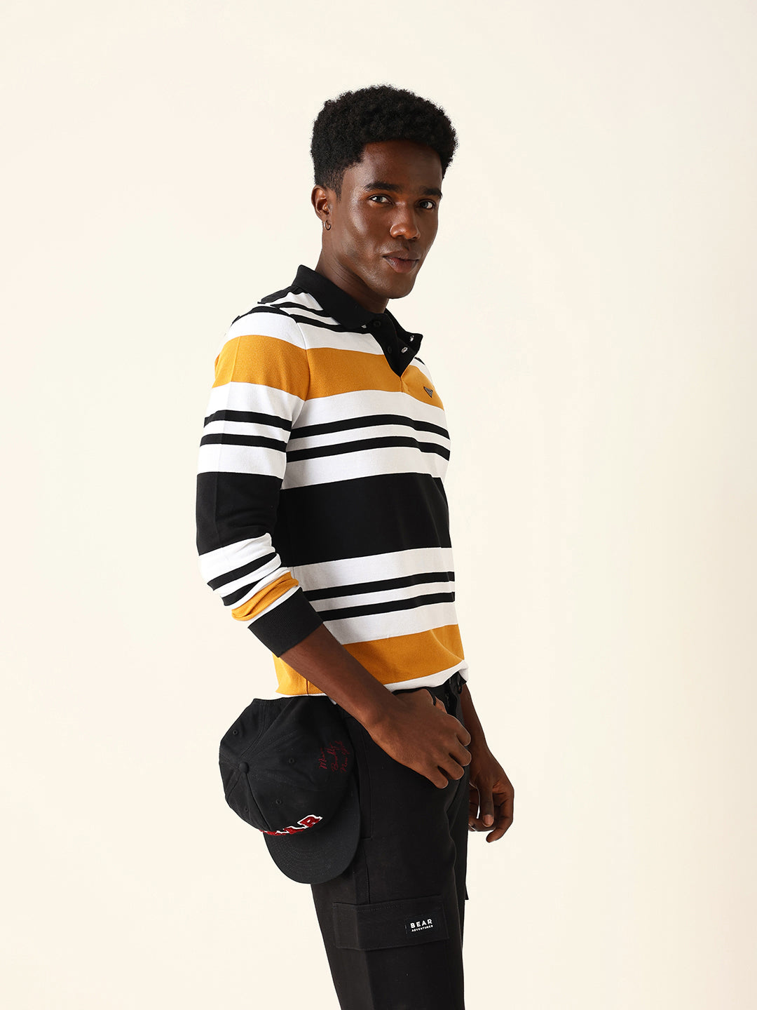 Shop Multicolor Regular Fit Striped Long Sleeve Polo with Metallic Branding Online.