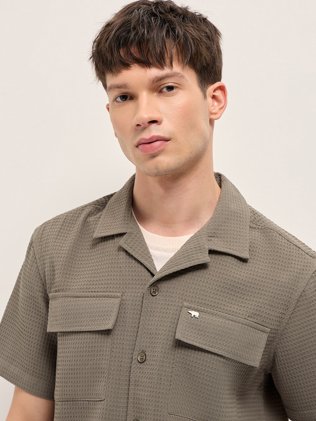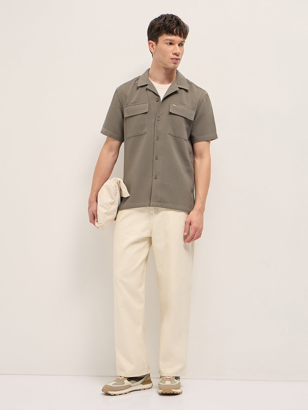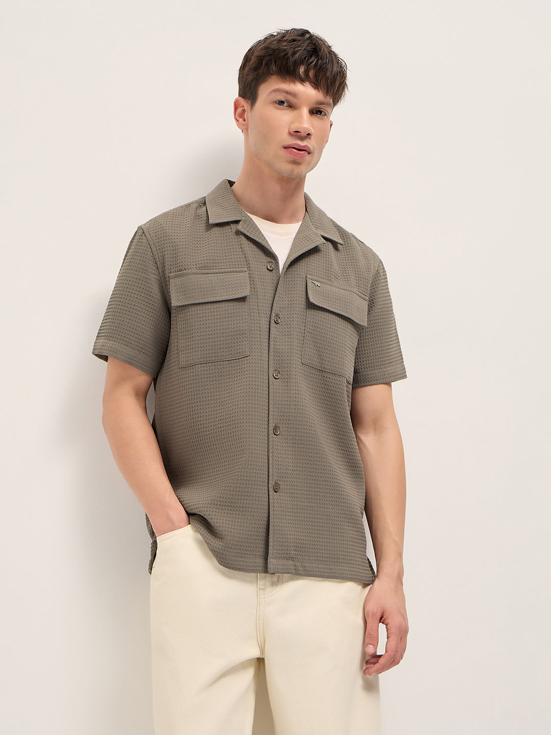 Shop Olive Textured Woven Relaxed Fit Casual Shirt with Flap Pockets Online.