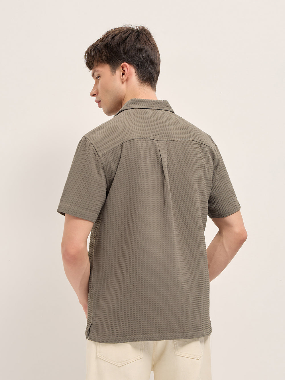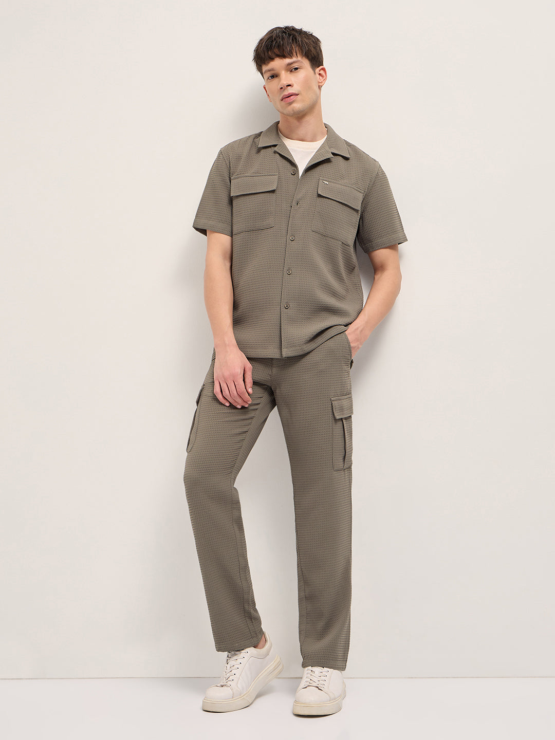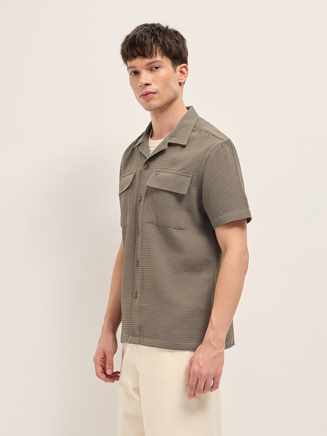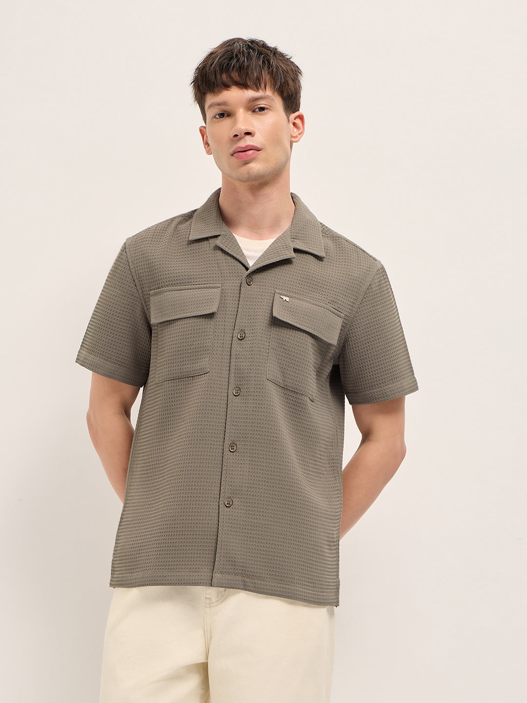 Shop Olive Textured Woven Relaxed Fit Casual Shirt with Flap Pockets Online.