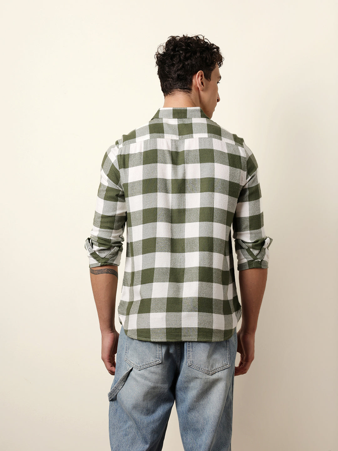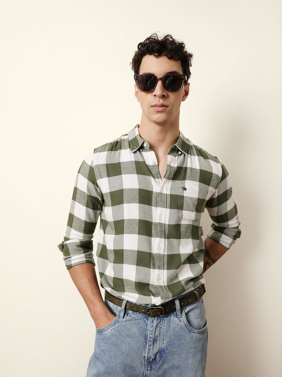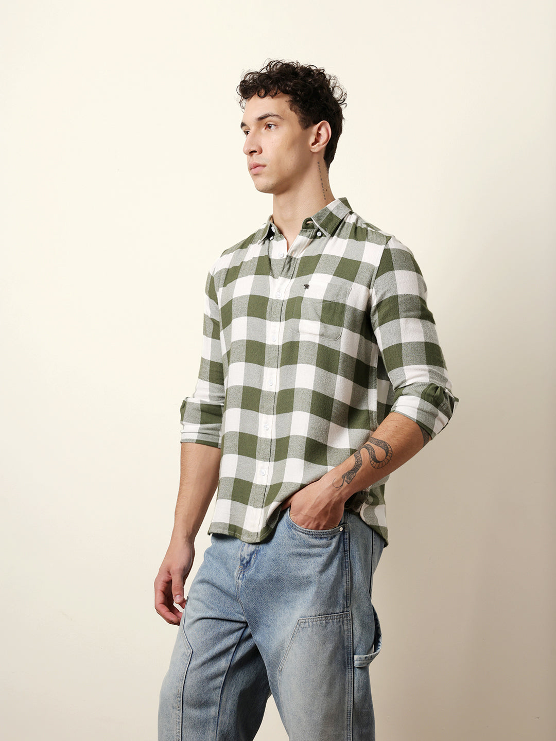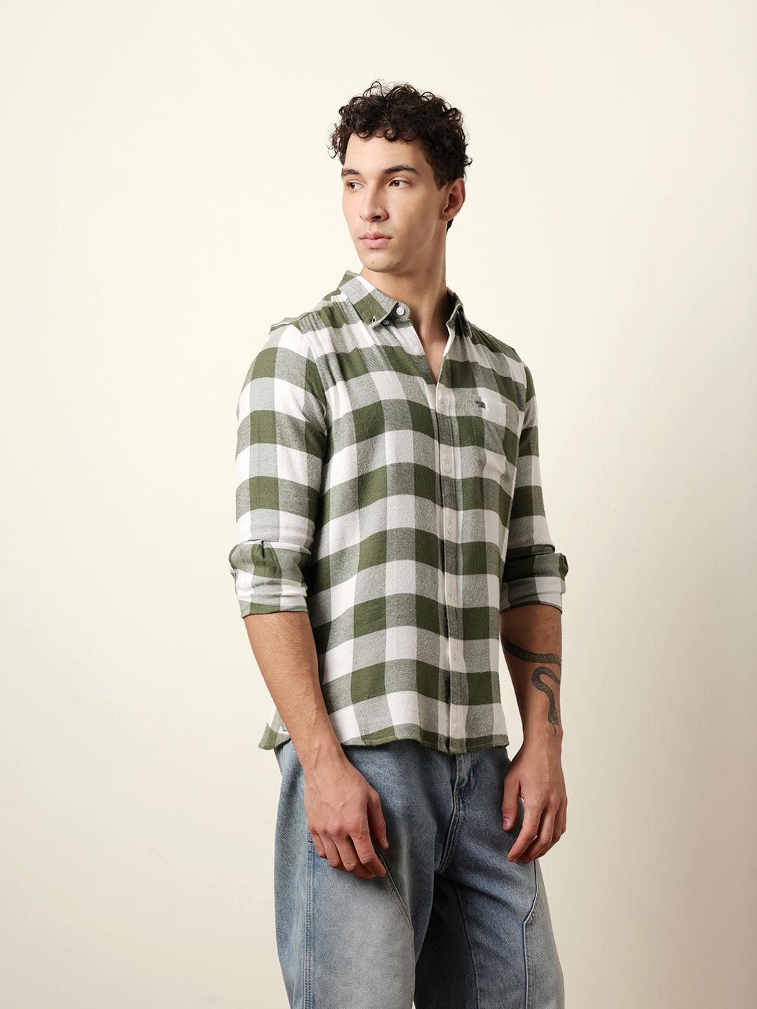 Olive & White Flannel Check Slim Fit Casual Shirt